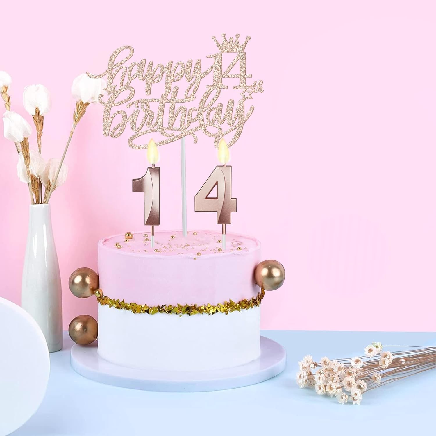 [14th Birthday cake topper and 14 candles]: Rose Gold Candles number 14, Rose Gold Glittery Happy 14 Birthday Cake Topper that are elegant prop to embellish your cake and cupcake. These dreamy rose gold 14 Birthday kit help to create a romantic and elegant 14 year old birthday celebrations