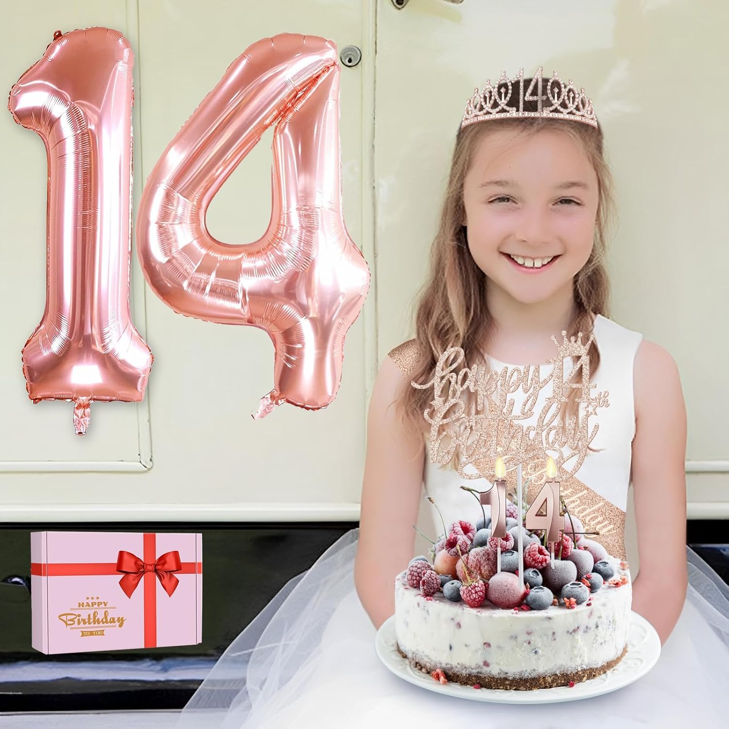 [14th Birthday Decorations Set]: Package Coming with Glittery Rhinestone 14th Birthday Tiara/Crown x 1pc, Rose Gold 14th Birthday Sash x 1pc, Happy 14th Birthday Cake Topper x 1pc, Number 14 Candles x 1set, Big Rose Gold Numeral 14Balloons x 1 set, 3D Birthday Card x 1pc. This great valuable 14h birthday gift for girl has been packed in a beautiful gift box for ready presentation
