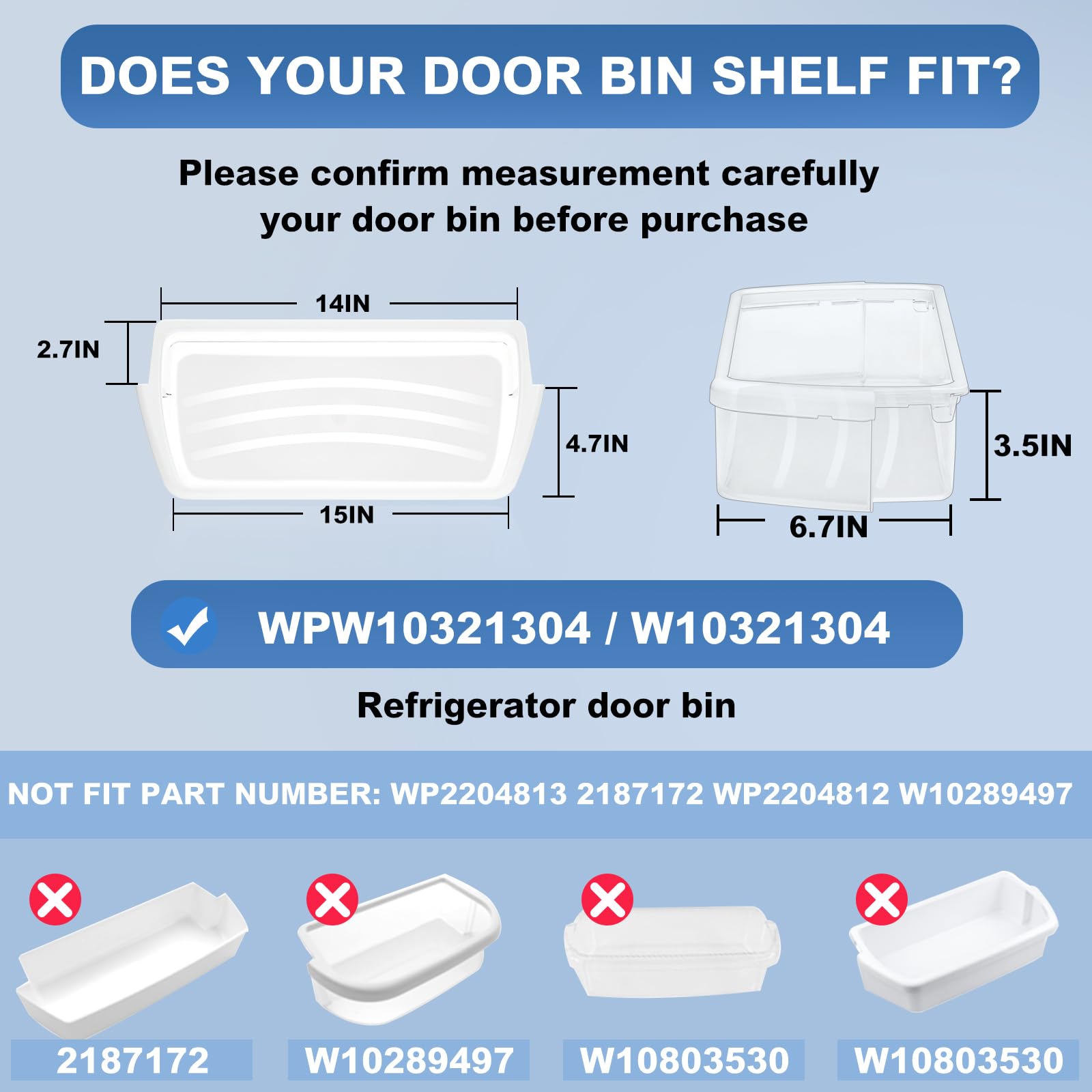 WPW10321304 Compatible with Kenmore Whirlpool Refrigerator Door Shelf:This Refrigerator Door Shelf Bin, also known as the crisper bin and door shelf bin, is made of resin, and is easy to install. Package include 2 WPW10321304 Refrigerator Door Shelf