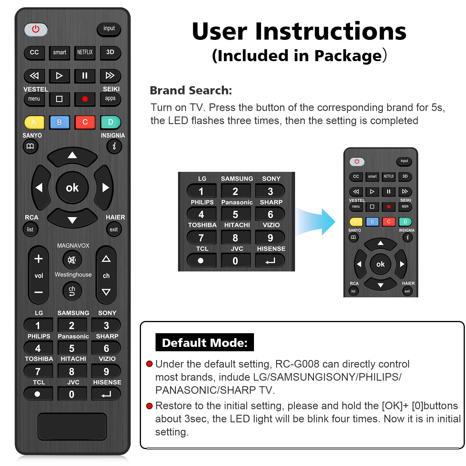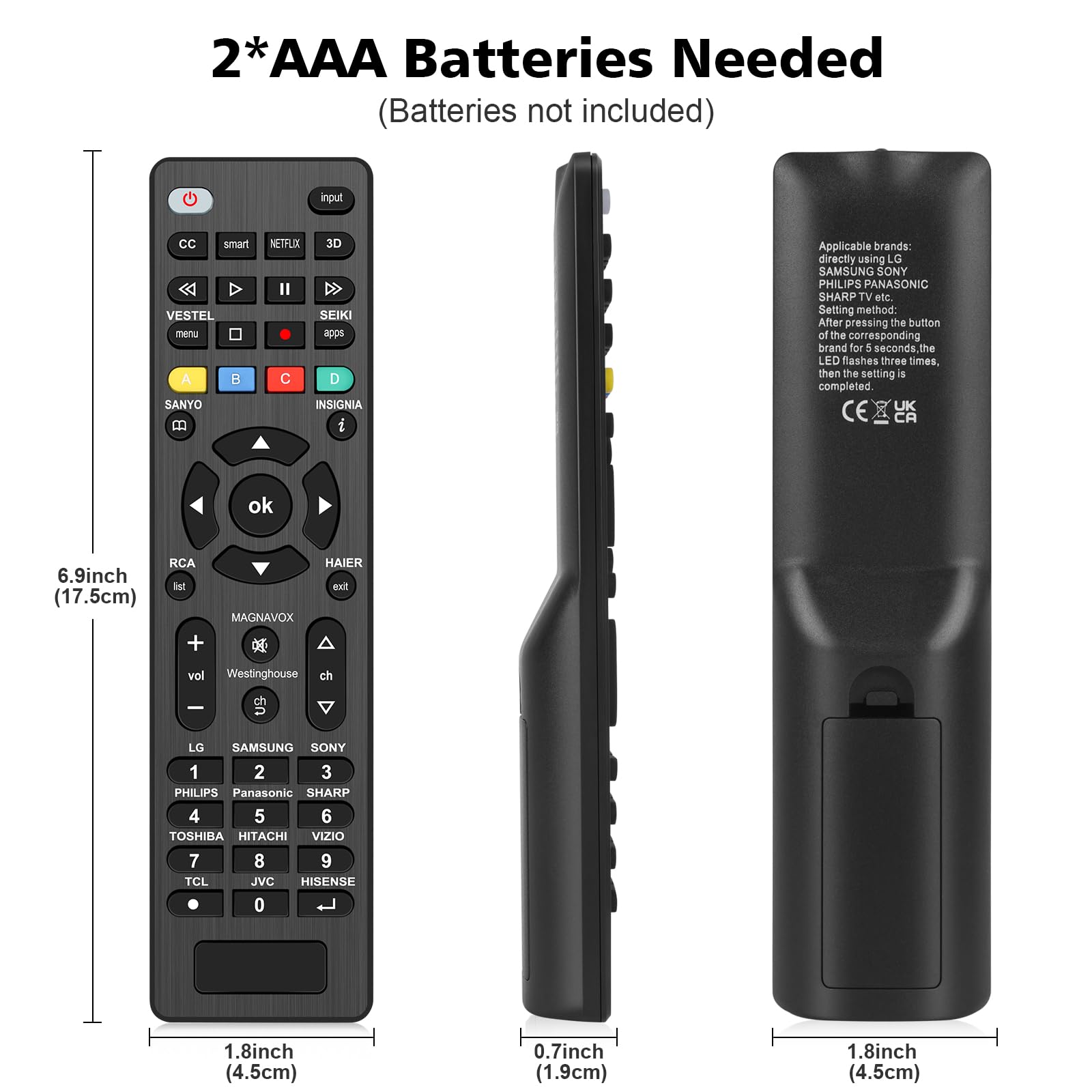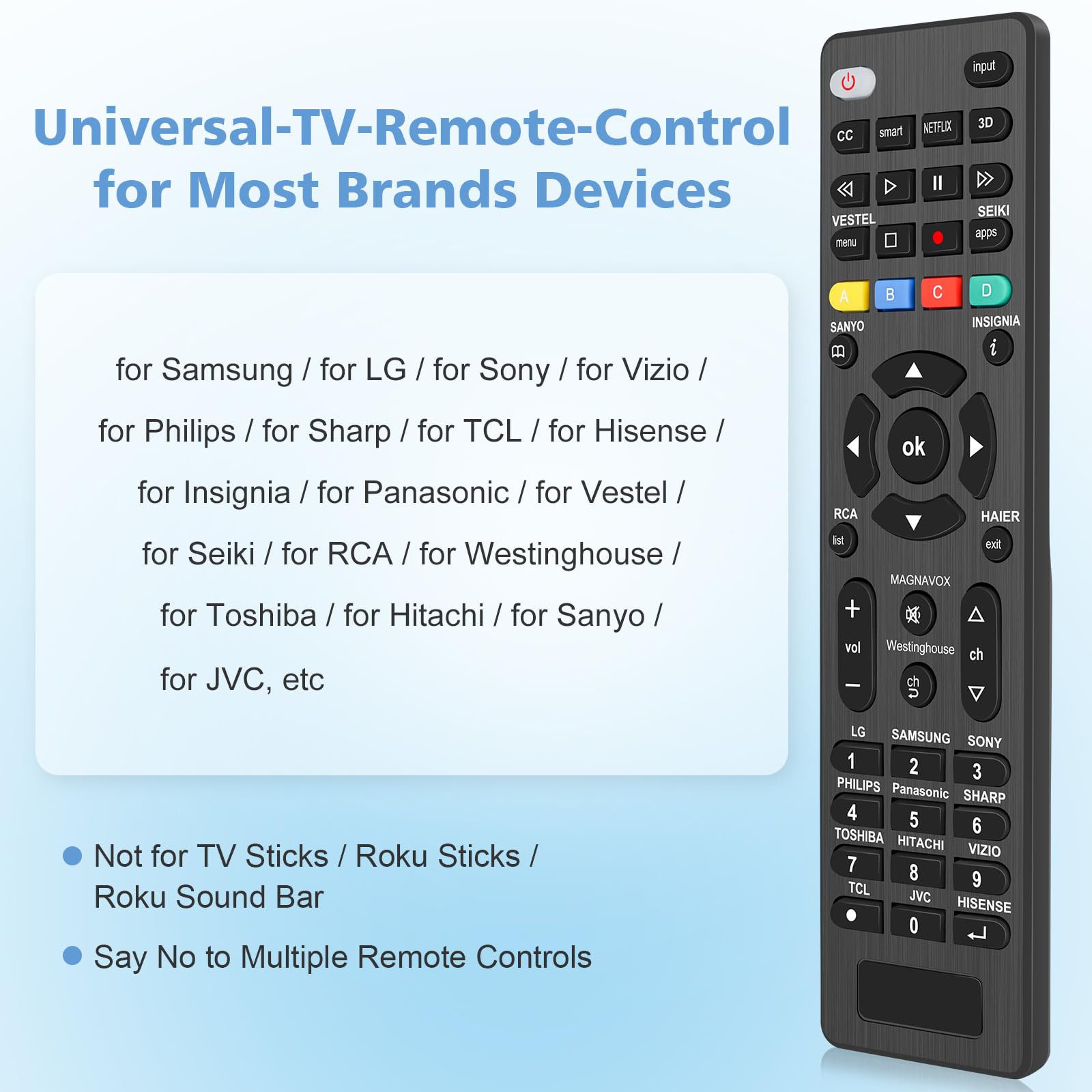 Perfect Compatibility(only for TV): This TV remote control is suitable for Samsung, LG, Sony, Sharp, Vizio, Philips, RCA, Westinghouse, Toshiba, Hitachi, Sanyo, JVC, TCL, Hisense, Vestel, Seiki, Insignia, Panasonic and other TV brands. It is made of high-quality materials, sturdy and long-lasting, accompaning you through countless happy moments