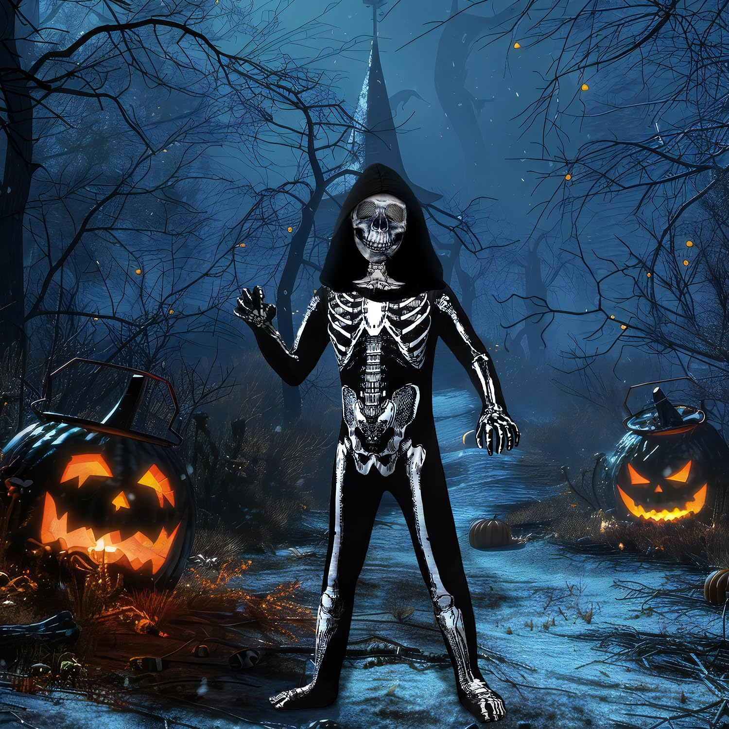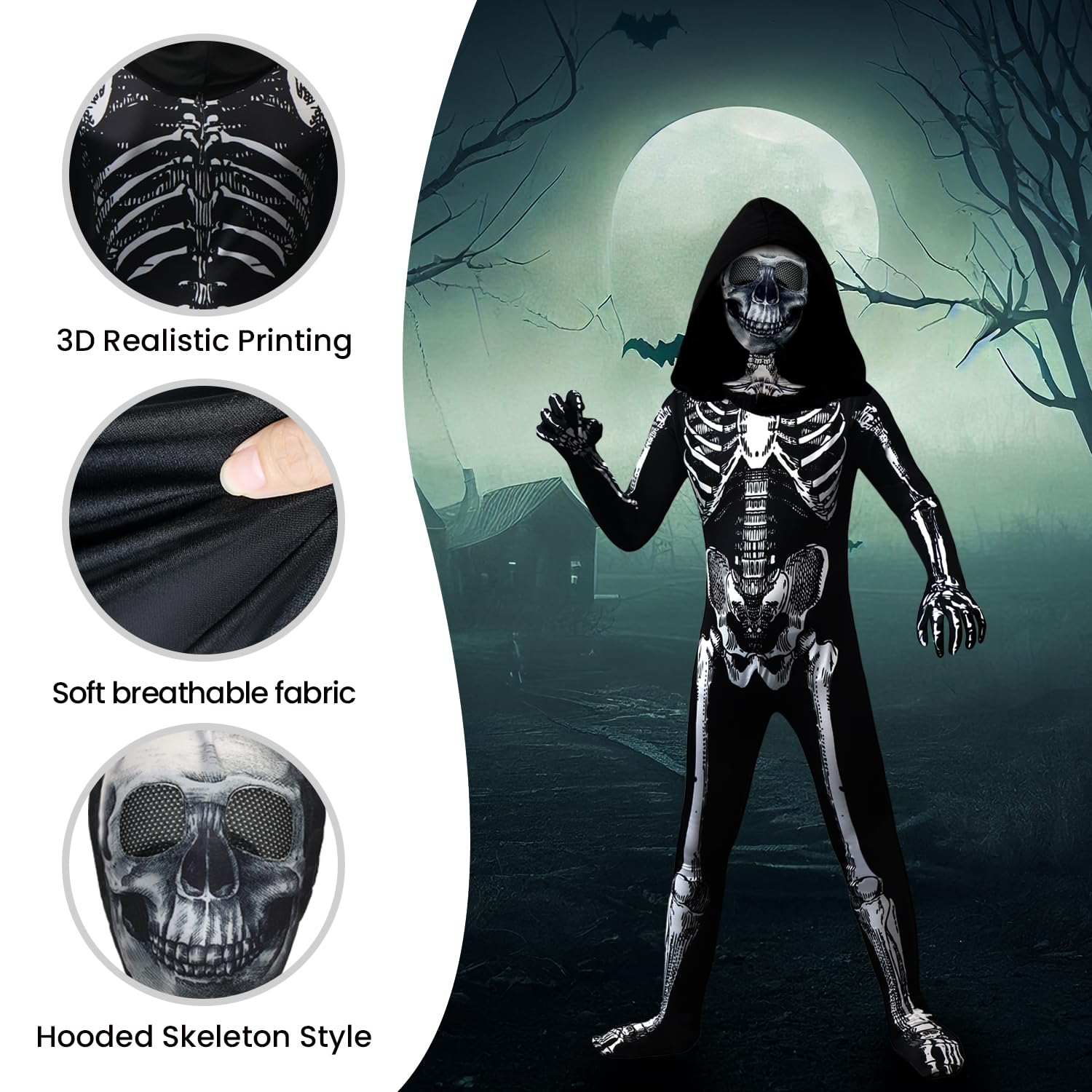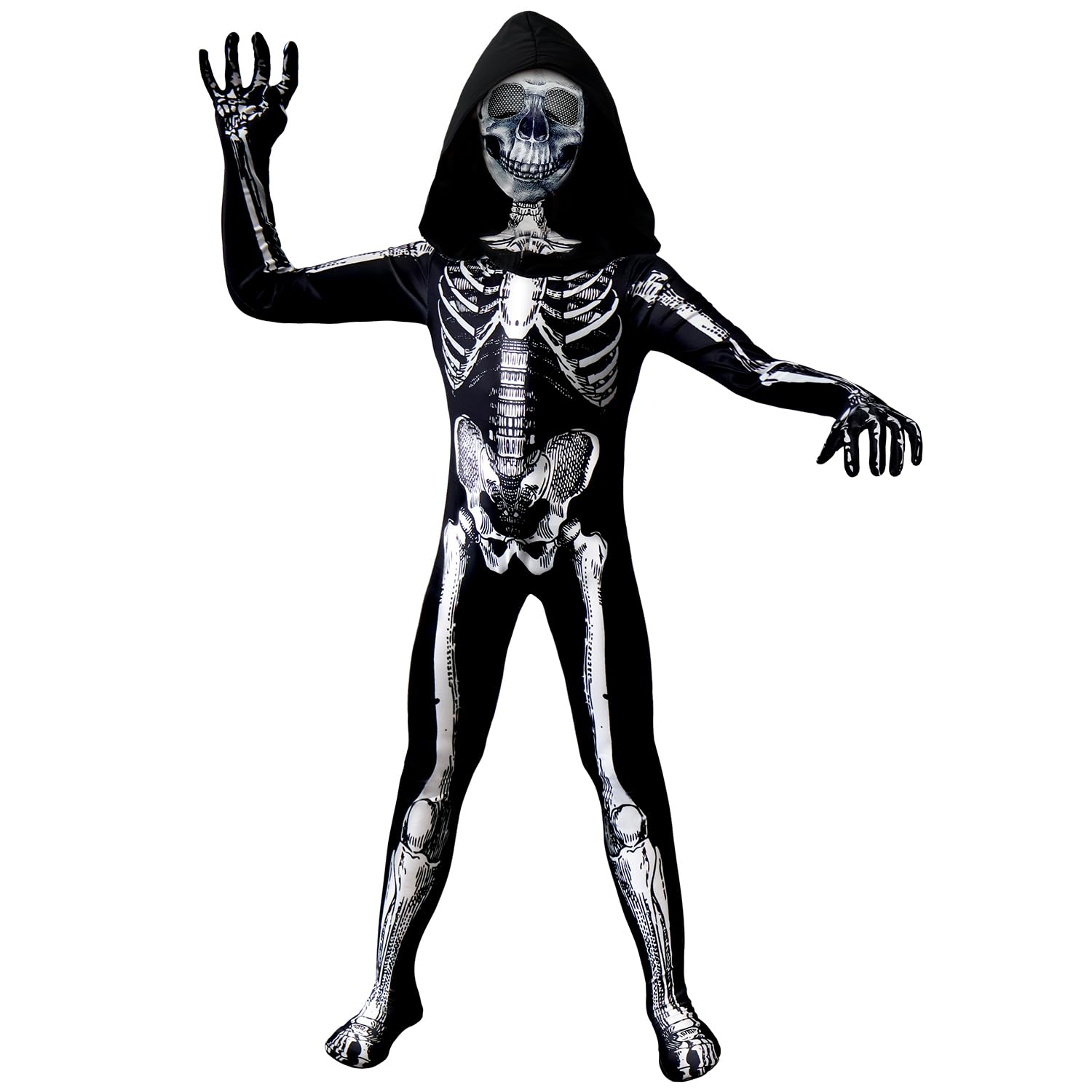 Package Include: 1× hooded full-body Kids Halloween skeleton costume, 1x scary skeleton mask. skeleton mask can also be used on its own and also creates a Halloween horror vibe, great halloween gifts for boys and grils