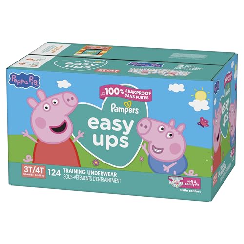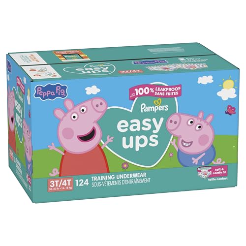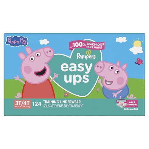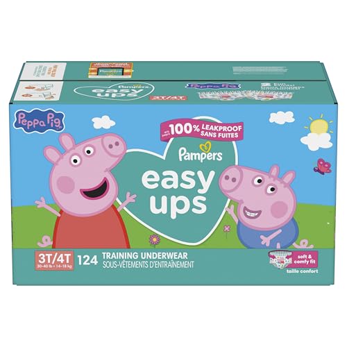 Make potty-training easy and fun with Pampers Easy Ups Potty Training Underwear for Girls and Boys! Featuring your favorite characters - Bluey and Peppa Pig - these super soft, comfortable, and breathable training pants fit just like real cotton underwear giving your toddler the confidence to feel like they have transitioned out of diapers! With a 360 stretchy waistband that is gentle on your child's skin, Easy Ups make it easy for your toddler to pull up and down their training pants independently. For easy changing, Easy Ups feature easy tear sides for mess-free convenience, even on the go! When it comes to potty training accidents, your toddler will be covered with up to 100% leakproof protection Day OR Night. To protect where leaks happen most, Easy Ups are made with Dual Leak-Guard Barriers around the leg cuffs and Extra Absorb Channels for all around coverage to absorb accidents and lock them away from your toddler's skin. Plus, they're dermatologically tested, hypoallergenic, and free of parabens and latex.* That's just one of the many reasons Pampers is the #1 pediatrician recommended brand. Available in sizes 2T-3T (16-34 lb), 3T-4T (30-40 lb), 4T-5T (37+ lb) and 5T- 6T (41+ lb). *No natural Rubber