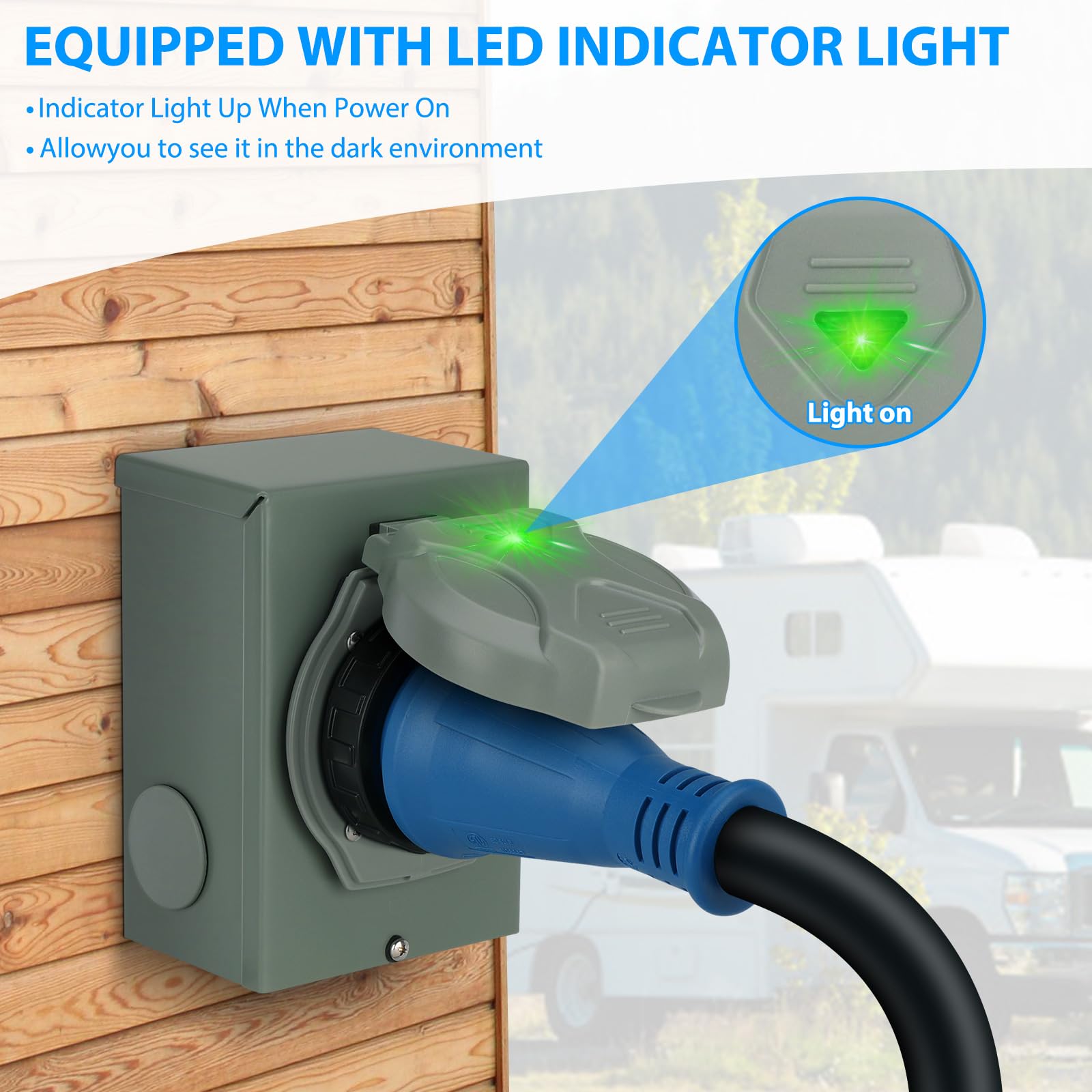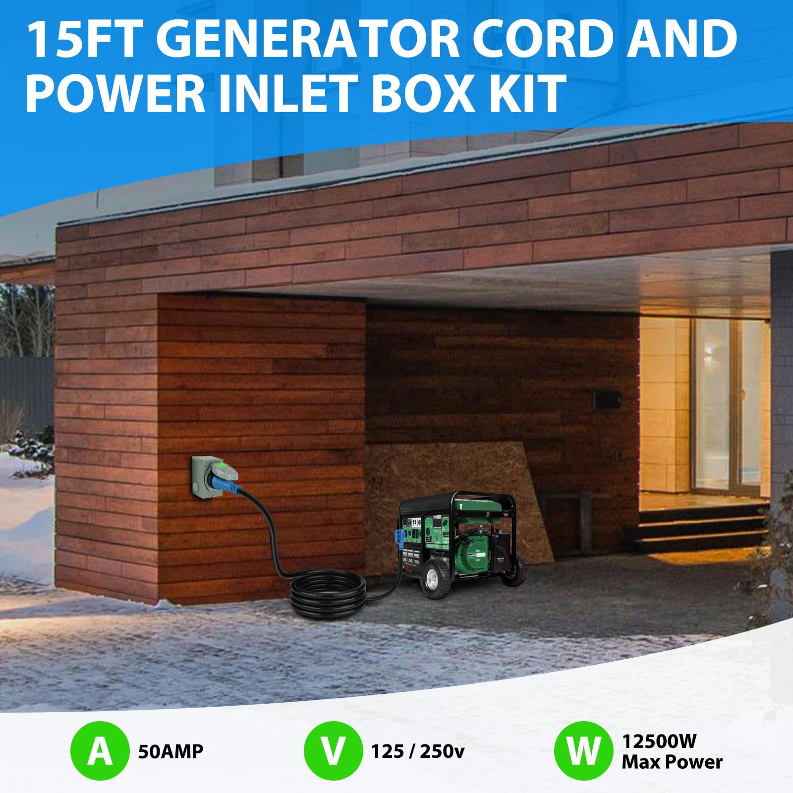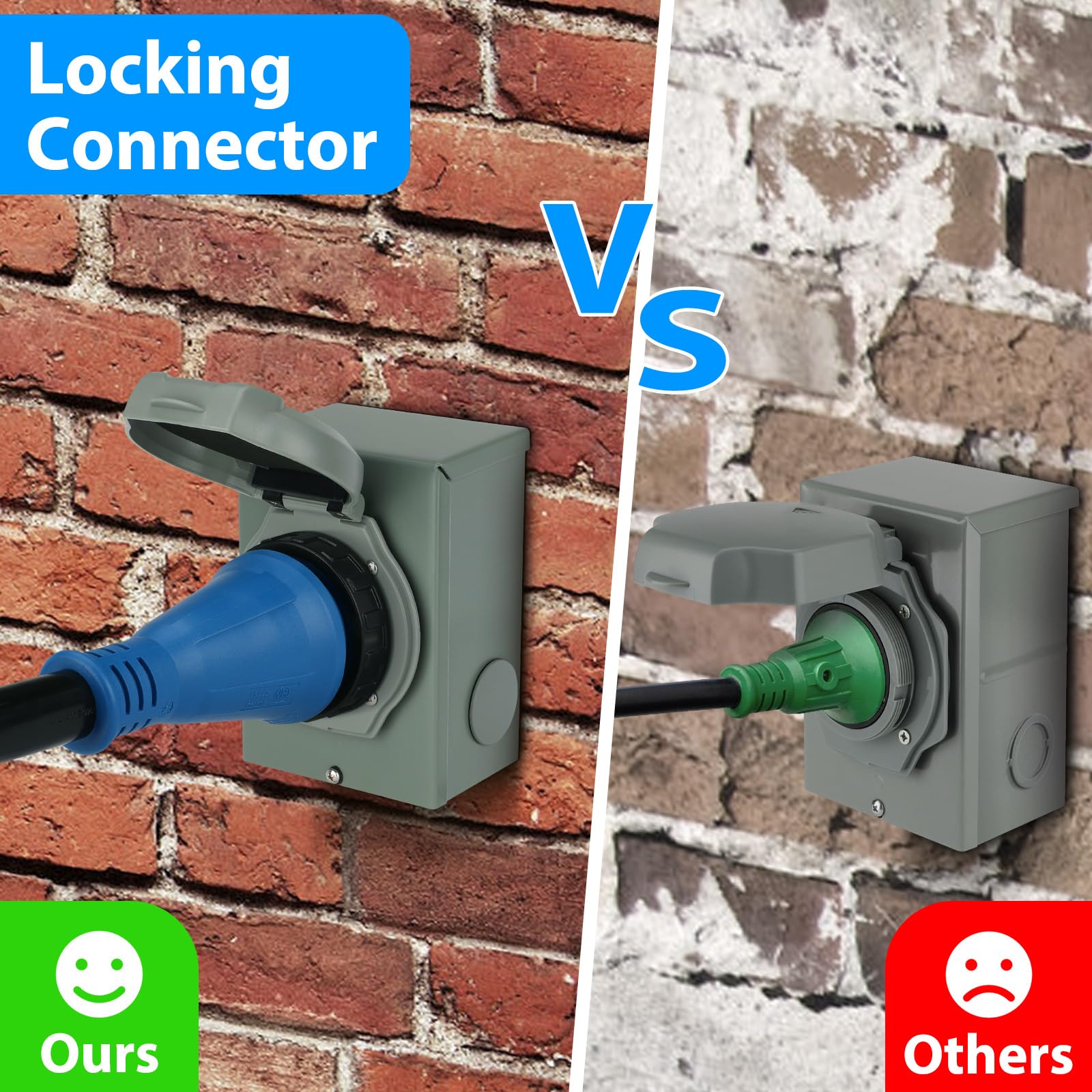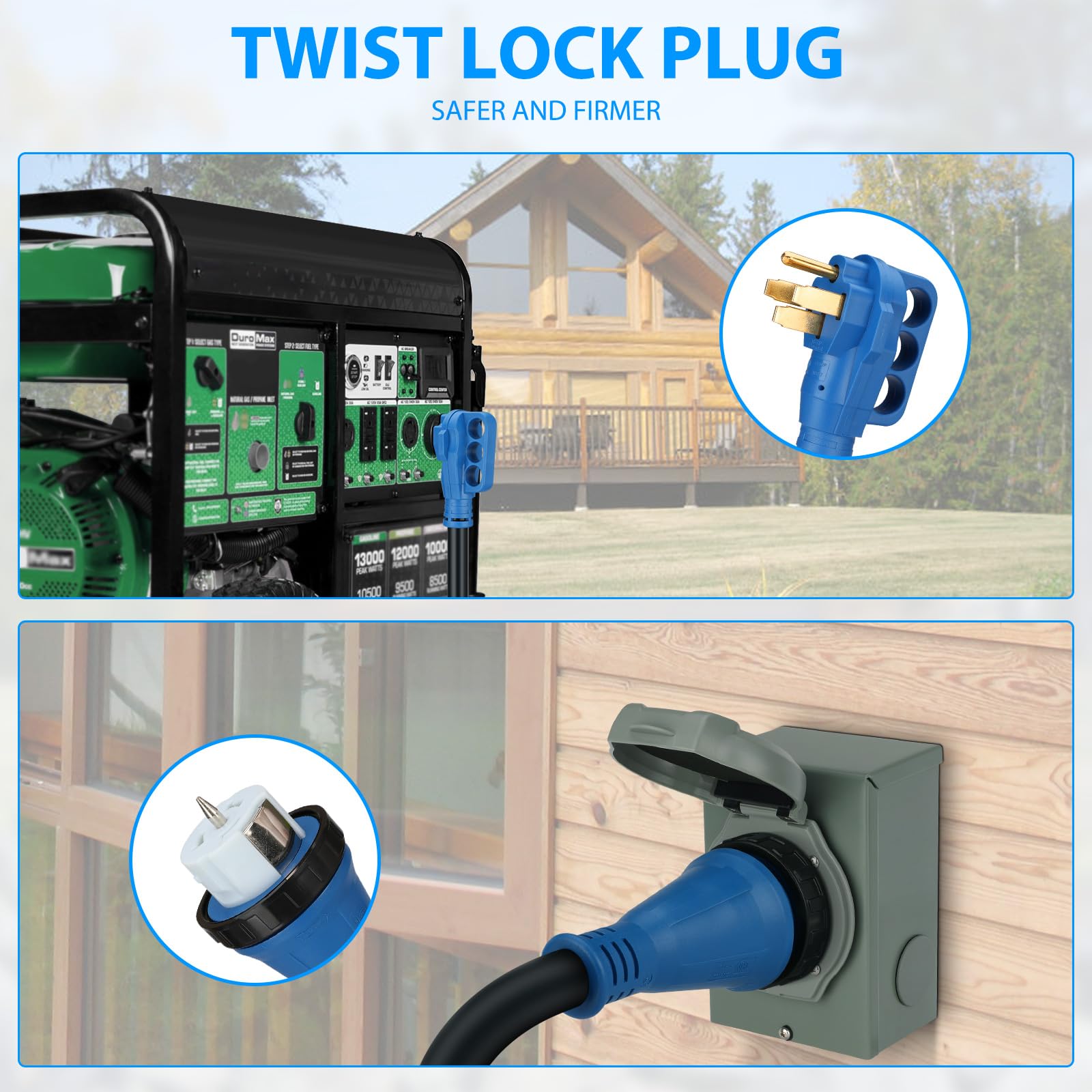 Easy To Use - 50 amp generator cord features ergonomic grip handles, ensuring both safety and ease of use for quick and effortless disconnection. The twist lock plug prevents cord falling off due to external force in various severe weather conditions. And the pre-drilled 50 amp generator inlet box is equipped with a secure green indicator on the flip cover, ensuring optimal performance and enhanced safety