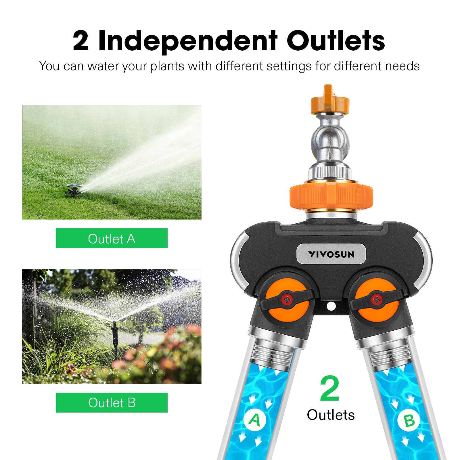 No Leaking and Watershed: Long and smooth thread with rubber ring at female end provides maximum protection against leakage; Internal rust-proof design makes the water flow clean; Use one outlet for the irrigation system while other can be used with a hose to watering flowers, washing car, bathing pets, rinsing the floor, washing windows and etc