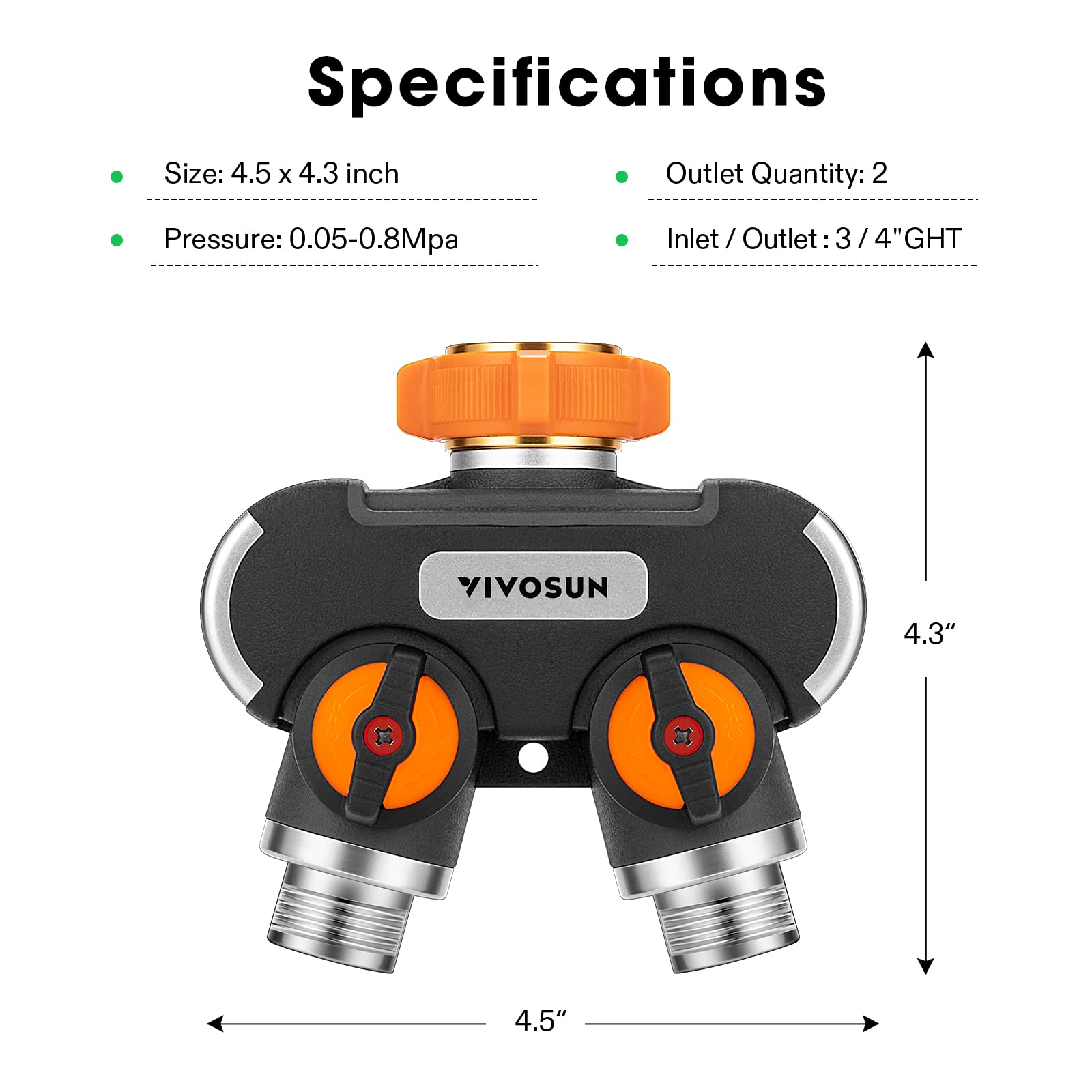 U.S. Standard Size: The copper-plated connector with plastic grip twists can match any 3/4" (U.S. standard) spigots and faucets; 2 Y-valve connector outlets fit standard 3/4" garden hose inlets; Water splitter 2 way compatible with any faucet timer; You can use it in the farm, garden, patio, deck or anywhere around the house