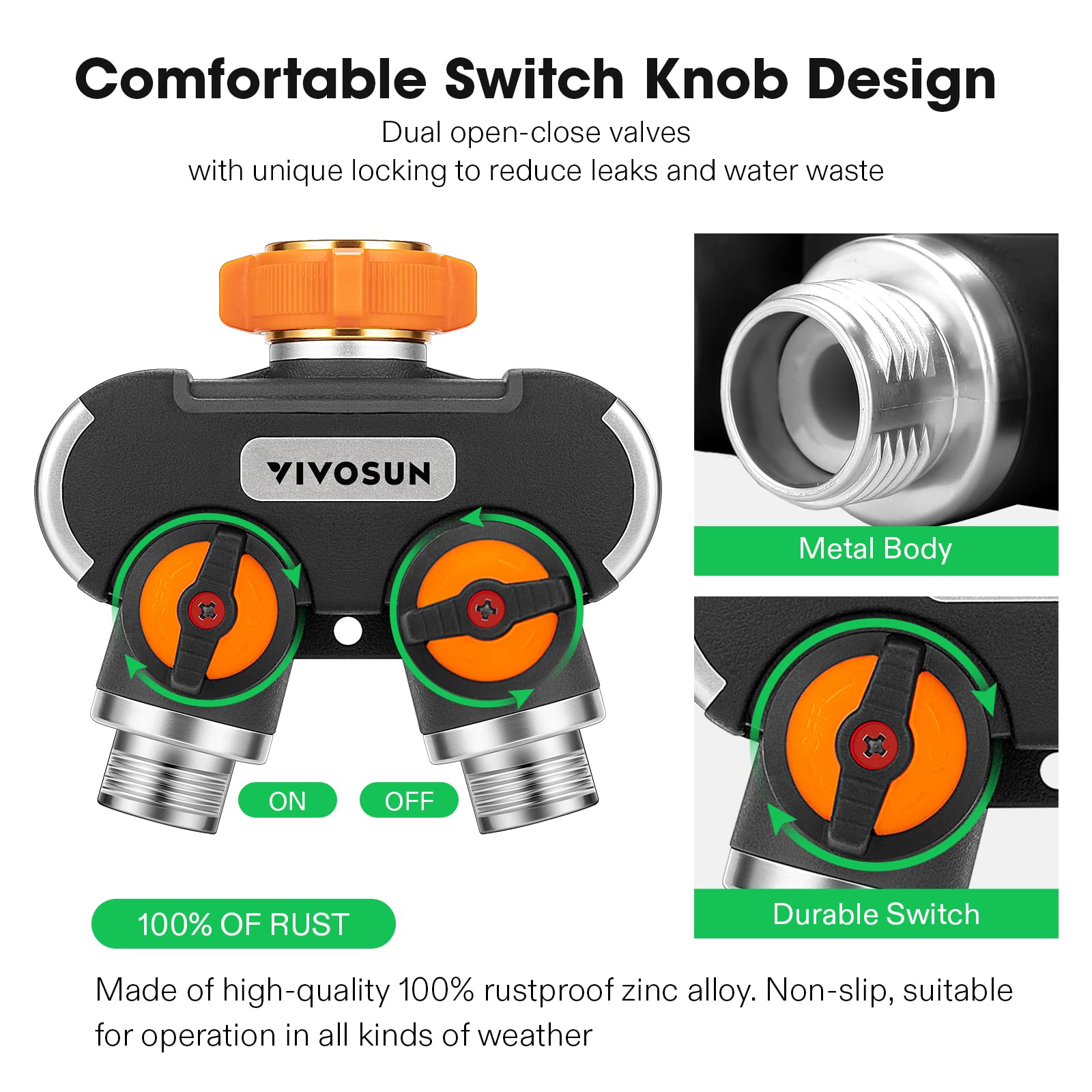Easy to Install and Use: Just rotate the 2 way hose connector and twist to the faucet and spin the swtiches to easily open or close the valves, no tools are needed; Dual open-close valves with unique locking to reduce leaks and water waste
