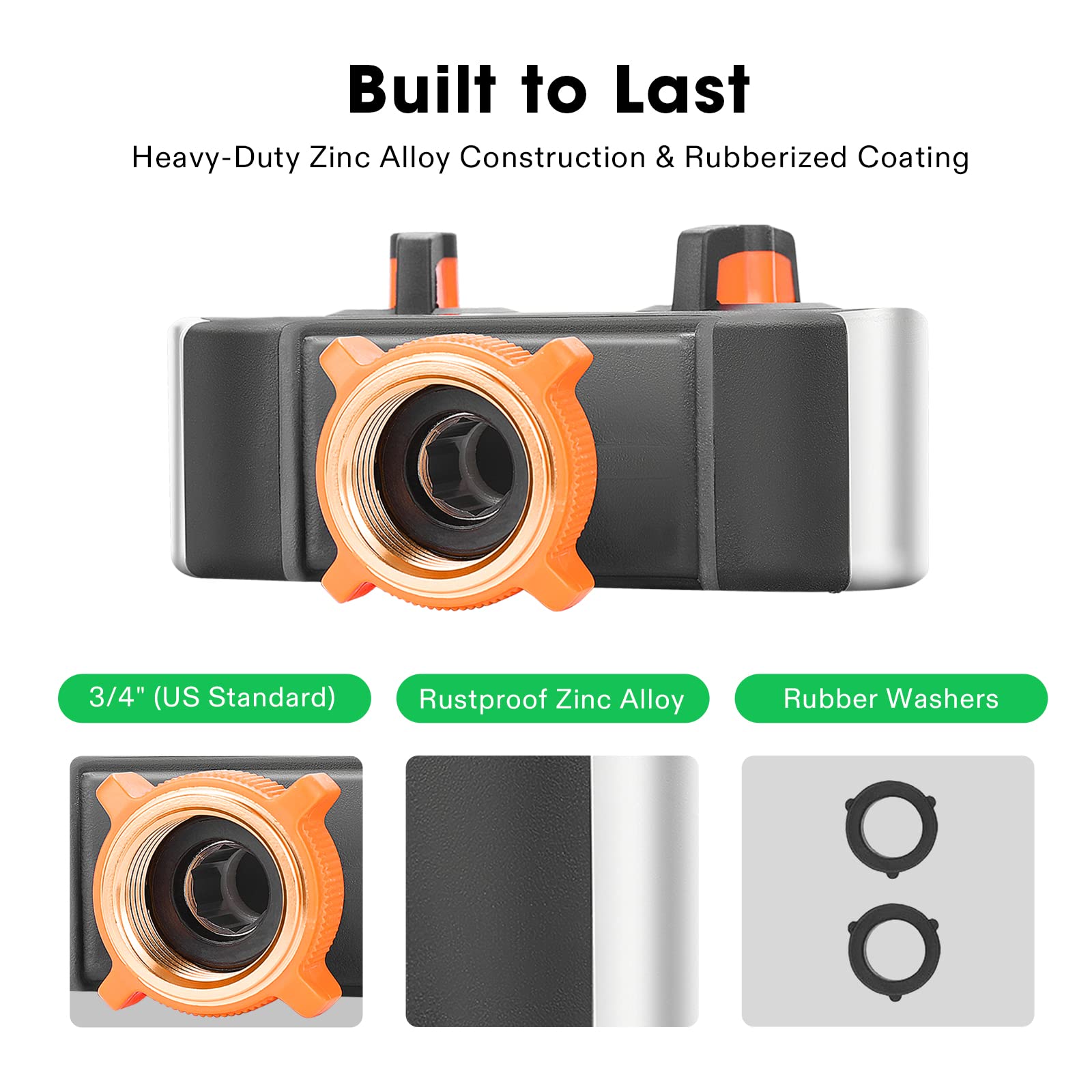 Heavy-Duty Zinc Alloy Construction & Rubberized Coating: Made of premium rustproof zinc alloy, the hose splitter is not easy to break, leak or fail even up to 0.8Mpa water pressure; Rubberized coating enables you to grip comfortably and prevents from getting rusted; Full soft rubber cover is ergonomic and non-slip, which is suitable for operating in all kinds of weather
