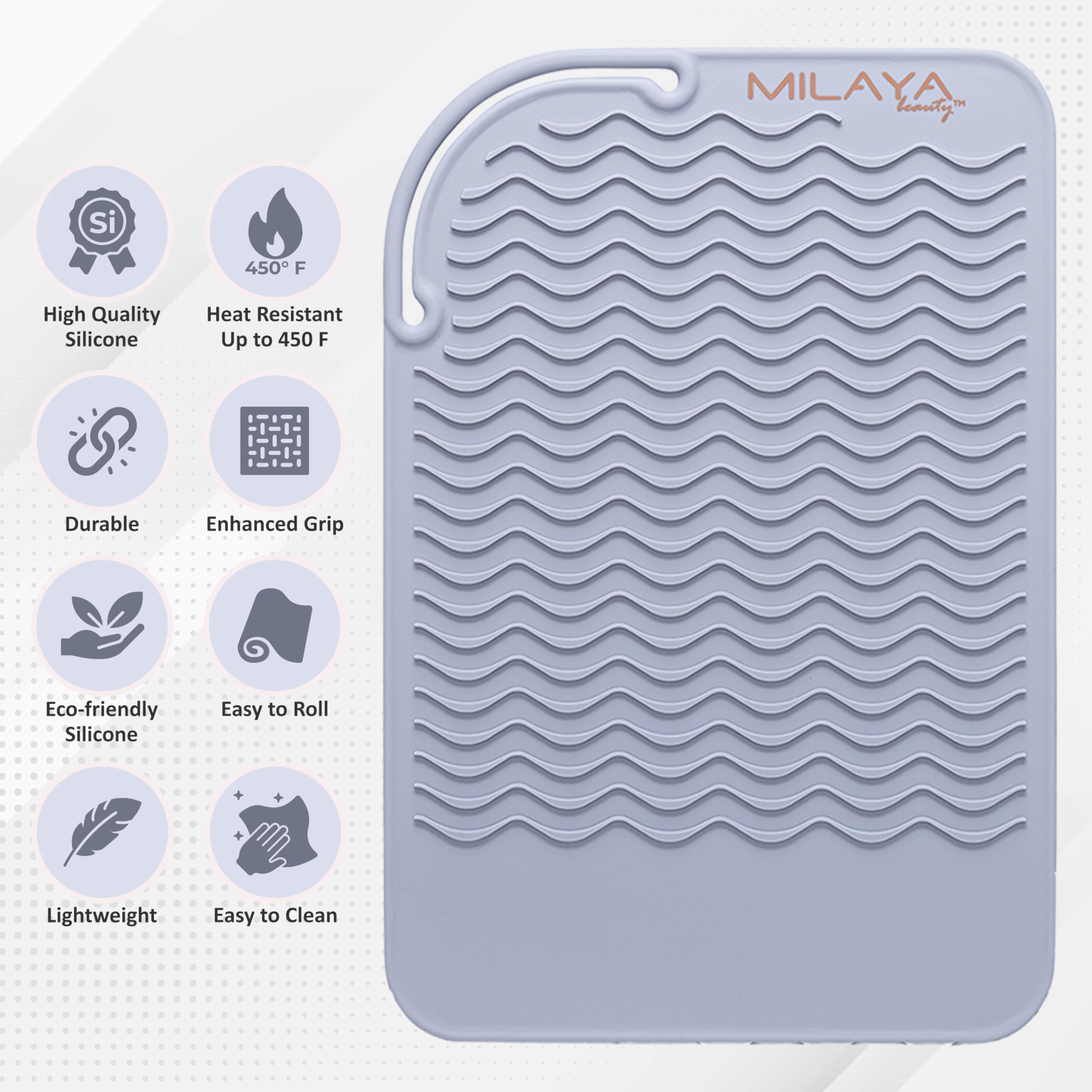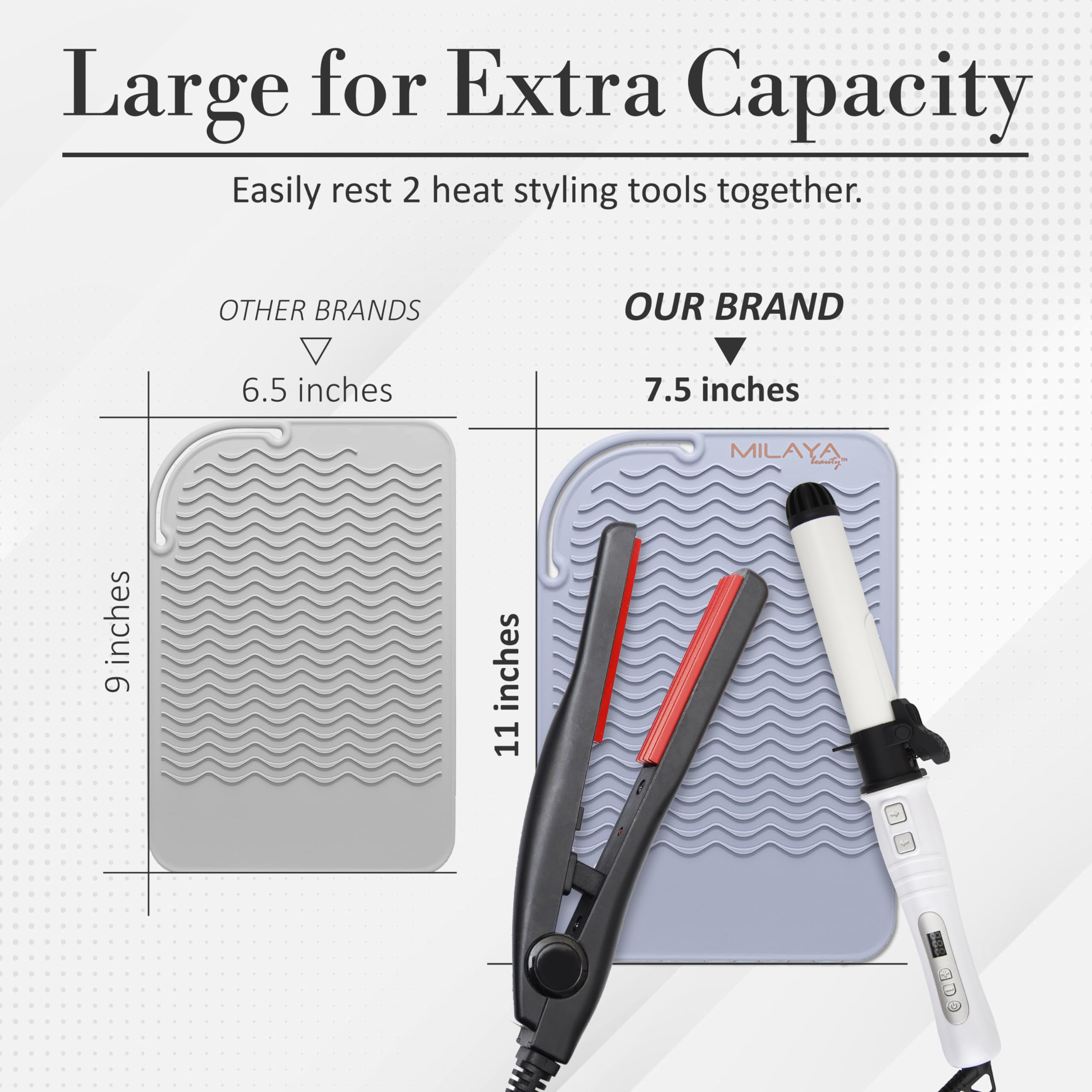 Large Size & Durability - The silicone heat resistant mat has been conveniently resized larger 7.5 inch x 11 inch compared to our competition of 6 inch x 9 inch. It provides more space for multiple hair tools. Convenient design keeps hair styling tools from slipping off the curling iron mat.