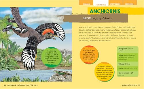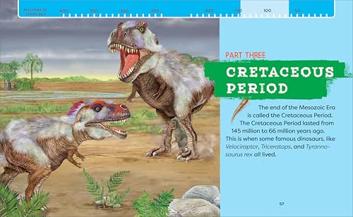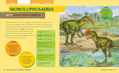 Dig up dino facts with this fun encyclopedia for kids ages 4 to 8 Dinosaurs are some of the most amazing animals that ever walked the Earth! They could be as tall as a four-story building or as small as a chicken. Some had spectacular spikes or hardened scales, while others had fantastic frills or vibrant feathers. This dinosaur book for kids gives them an exciting glimpse into the Age of Dinosaurs with awe-inspiring facts about how they lived, what they looked like, and more. This standout among dinosaur books for kids encourages them to: Discover dinos by eraβKids will learn about 90 different dinosaurs, organized by the prehistoric era in which they lived. Find kid-friendly factsβThis dinosaur book helps kids expand their dino knowledge with bite-sized facts, a pronunciation guide, and a glossary with easy-to-understand definitions. Explore colorful illustrationsβInspire kids to travel back in time through detailed artwork that brings the dinosaurs to life. Get the best in dinosaur books for kids with this fun-filled dinosaur encyclopedia.