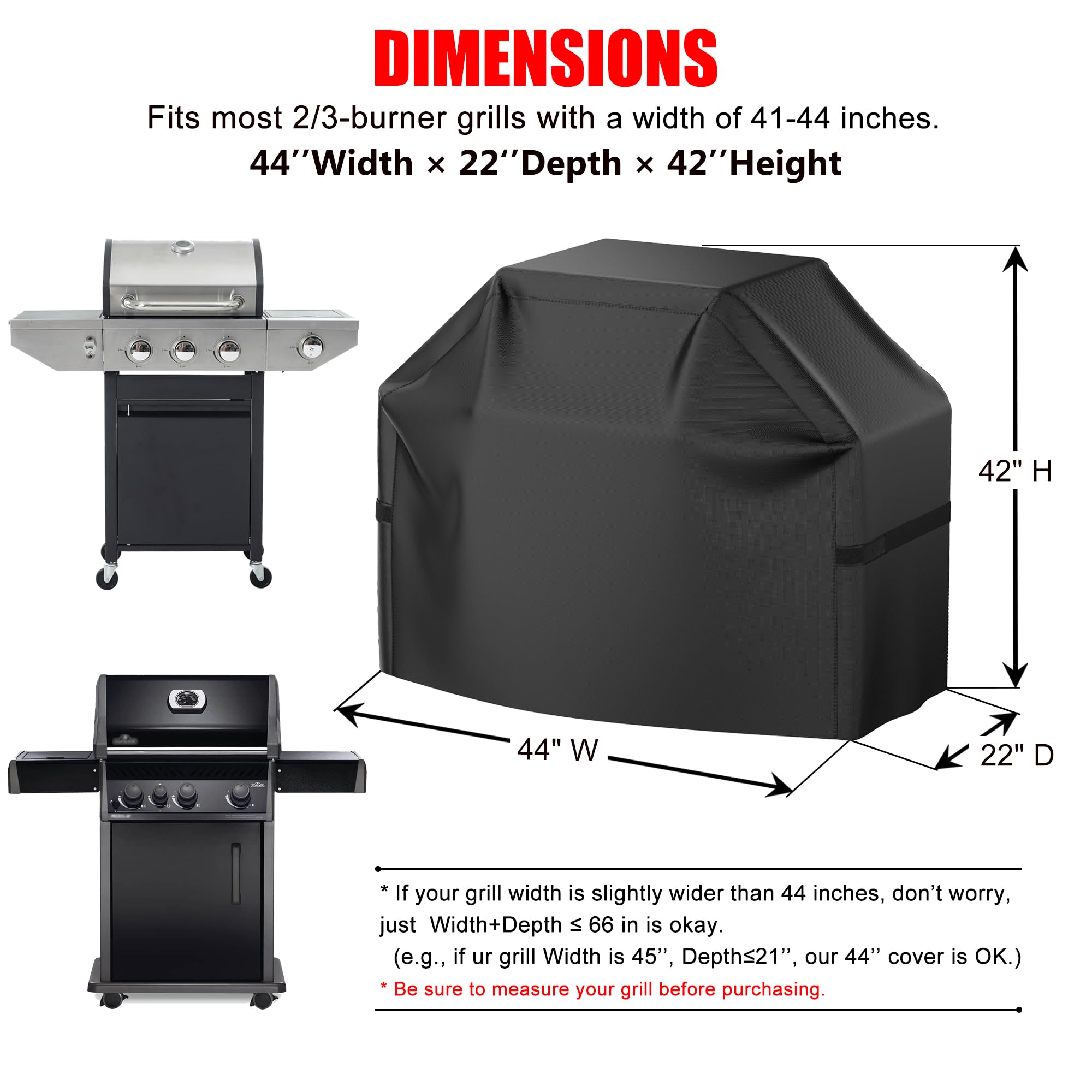 [Dimensions] W x D x H: 44 x 22 x 42 inches, fits most 2-burner or 3-burner grills up to 44'' wide. If your grill width is slightly wider than 44 inches (within 46''), it's okay as long as the width plus depth is less than or equal to 66 inches. The choice of grill cover depends on the size of your grill, please make sure to measure your grill before purchasing. If you are unsure which size of bbq cover is suitable for your grill, please contact us with the size of your grill.