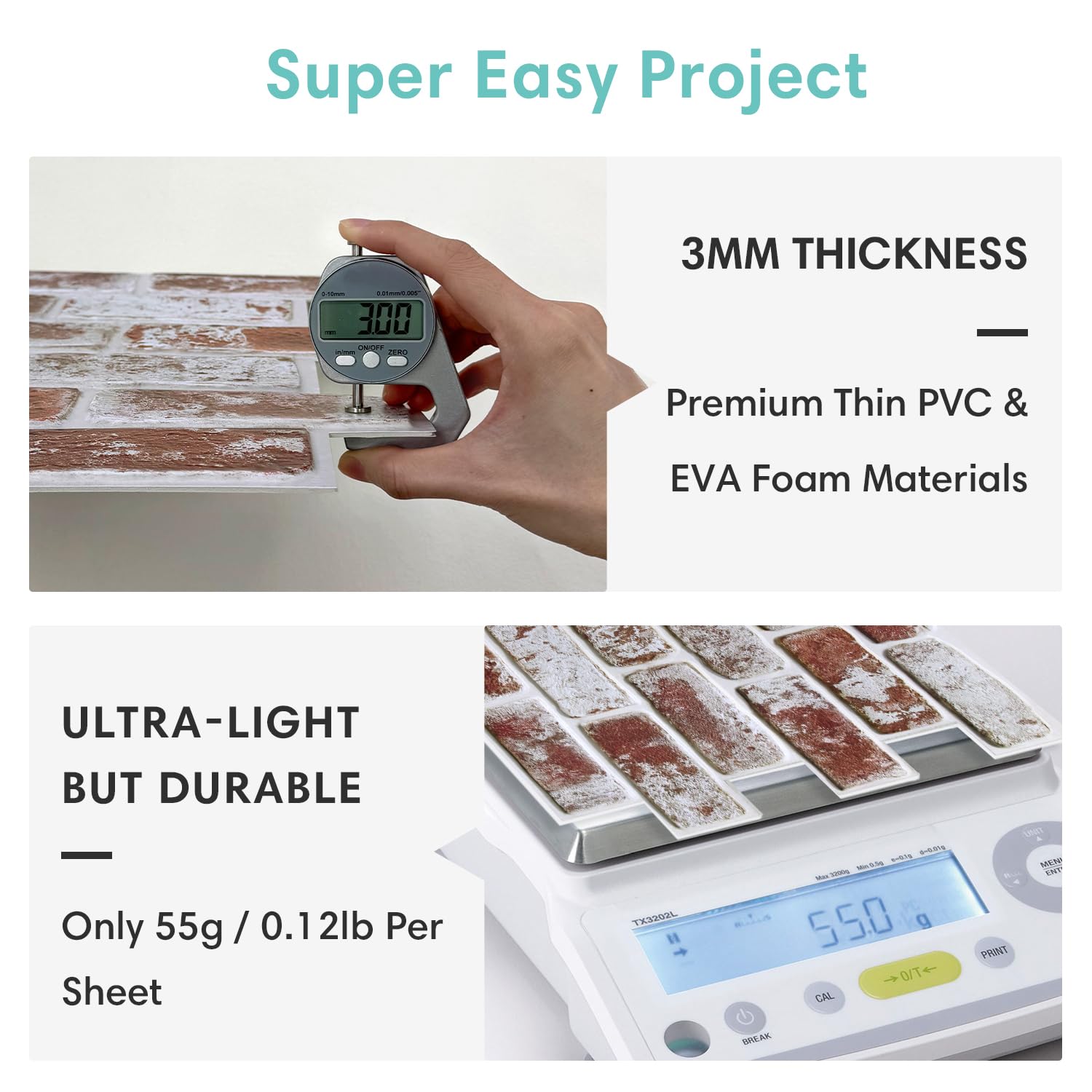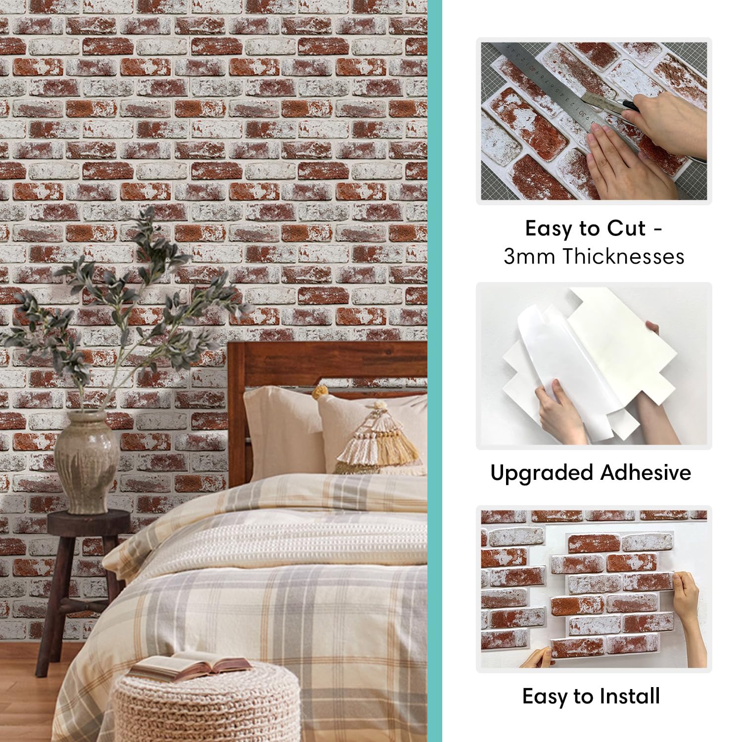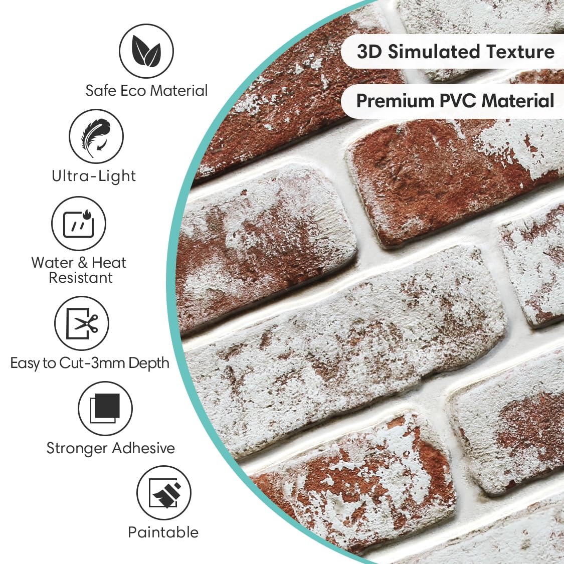 [UltraLight PVC, Flexible & Durable] 3D brick wall panels are made of premium PVC, 5mm thickness. Lightweight & Flexible: Very easy to install on interior walls. Be your own DIY designer