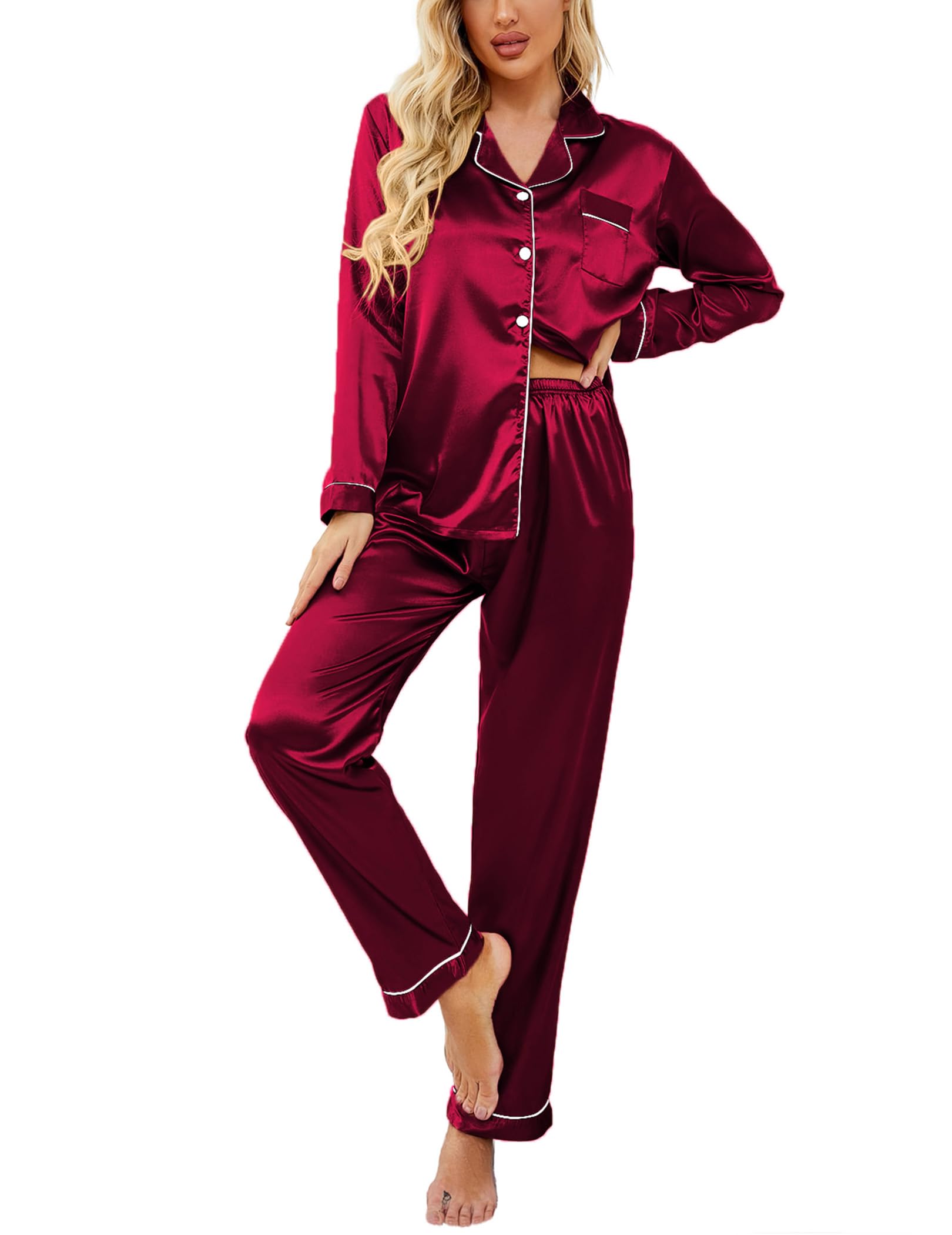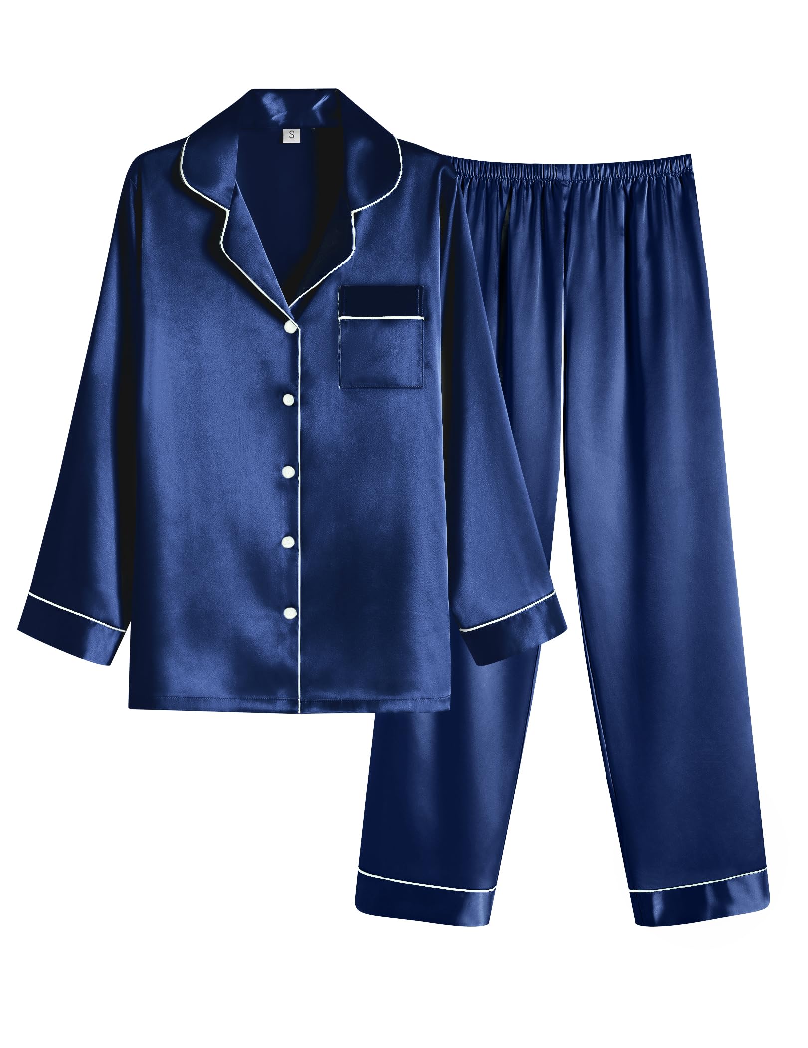 Features:Pajamas top use classic notch collar,button front,chest pocket,v neck,length at hips,contrast piping.Pjs pants has elastic waist ,two side pockets,easy to hold phones,keys or other