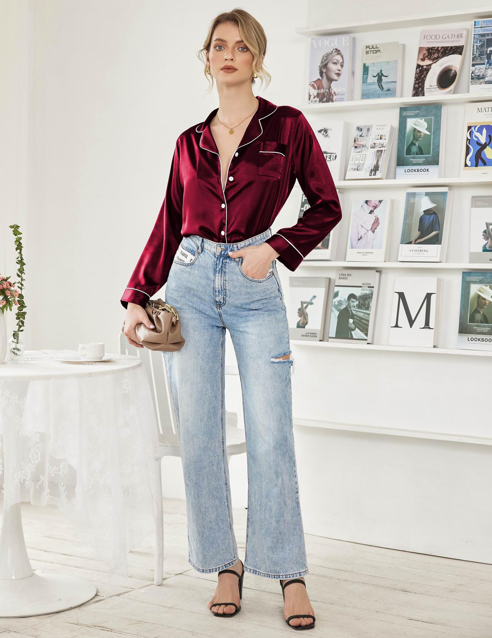 Novel MATCH STYLE:Pajamas shirt paires with jeans,bag,belts,earrings,sandals as womens outfits for going out,casual daily look.Pajamas top + jeans/dress+high heels/boots + fashionable bag = Gorgeous fashion women.Refer to model pictures