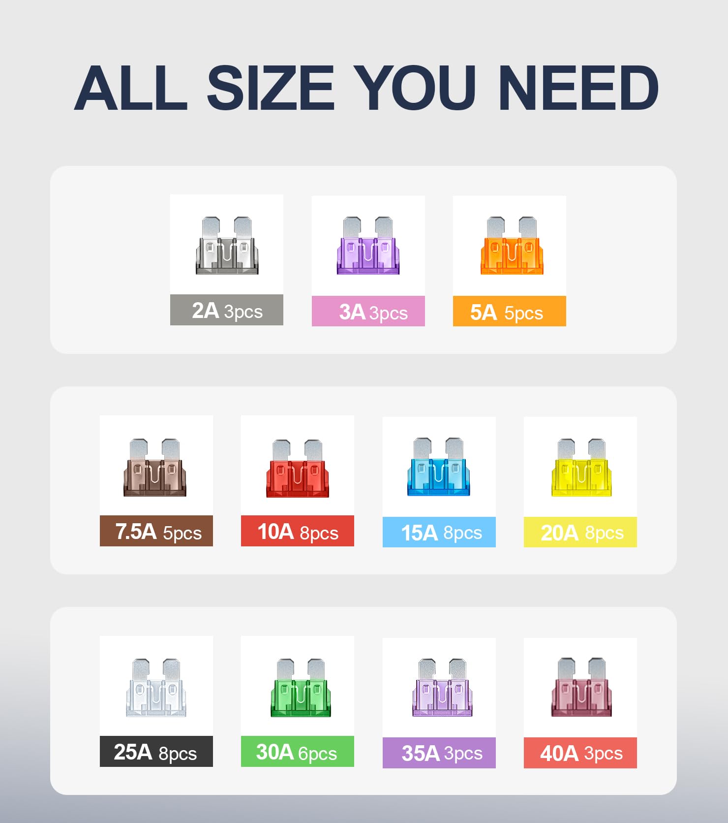 【High quality, easy to identify】-- The fuse is made of environmentally friendly plastic and zinc alloy. The fuse of each current specification is distinguished by different colors, and the current specification number is marked on the top of each fuse, which is easy to identify.