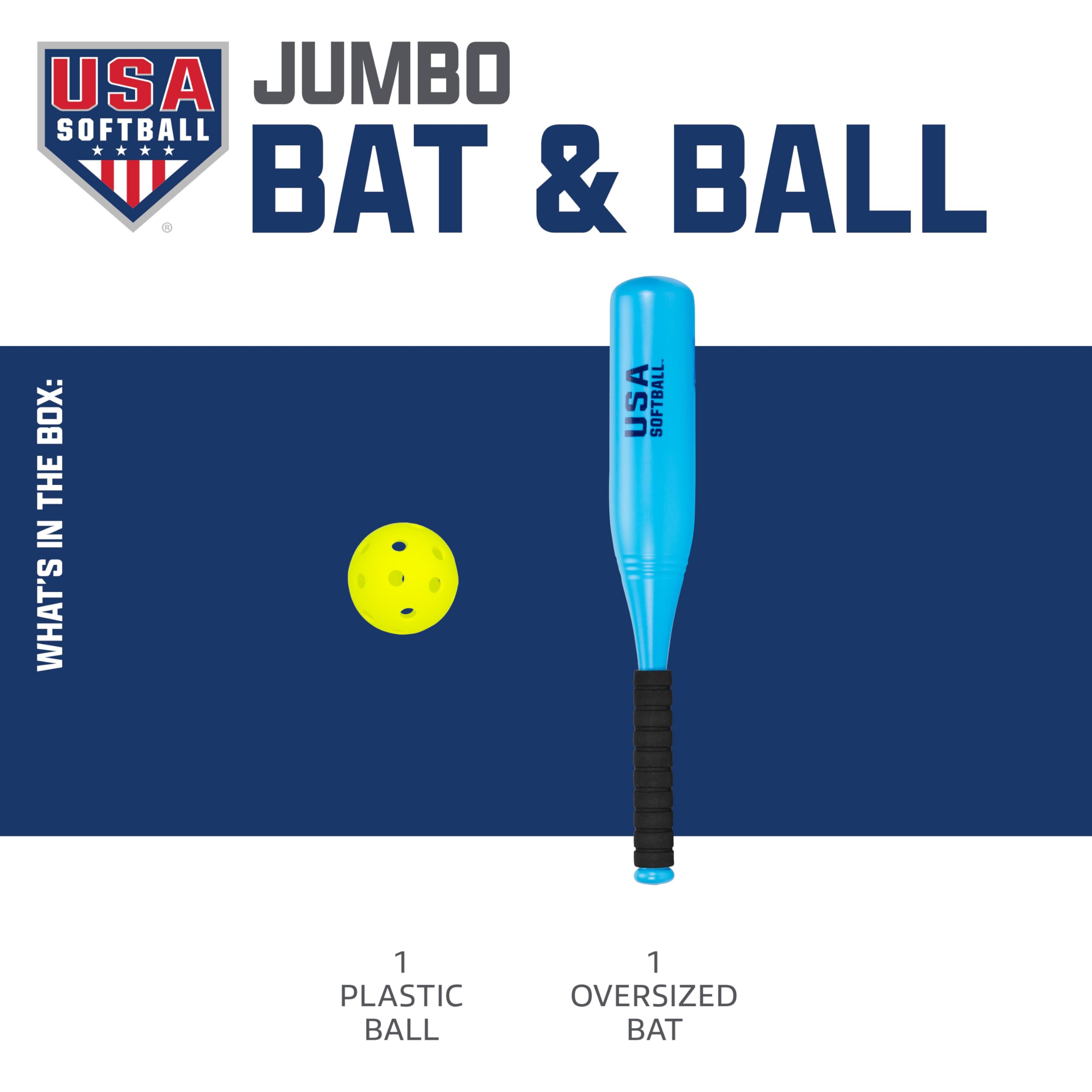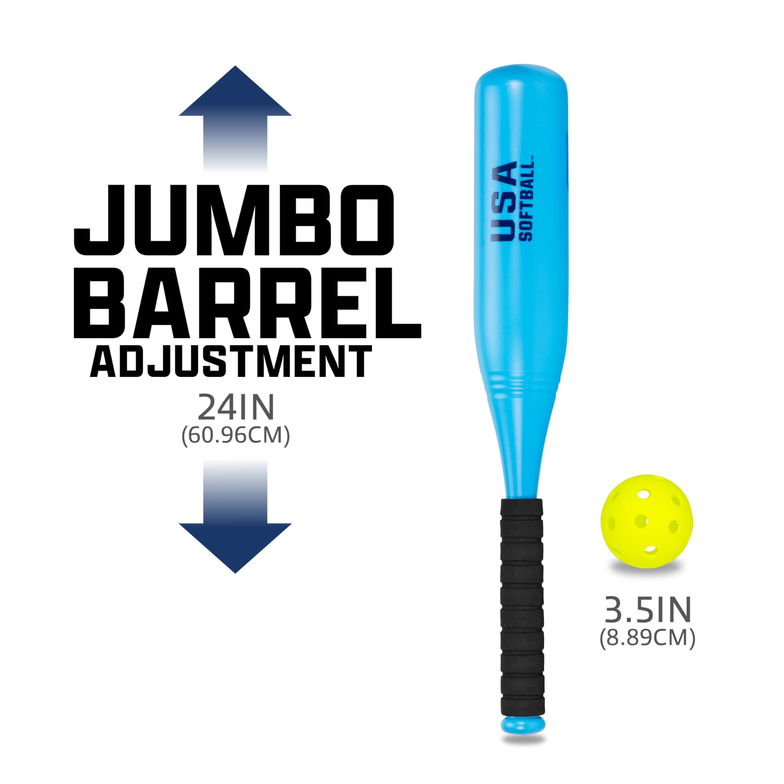 Bring the excitement of softball to your backyard today with the Franklin Sports USA Softball Jumbo Kids Plastic Bat & Ball set! This set is designed with kids and young baseball and softball players in mind, and is designed with an oversized barrel for easy hits and a lightweight plastic construction that's perfect for beginners. The 24" big barrel plastic bat is also constructed with a foam handle grip to help kids get a better grip on the bat for better swings. The jumbo bat makes it easier for young players to make solid contact with the ball, boosting their confidence while teaching them the fundamentals of batting and the durable plastic ensures long-lasting outdoor fun, whether in the backyard, at the park, or during family picnics. This set also comes with a plastic softball included so you have everything you need to start playing right out of the box. This youth bat and ball set is an official USA Softball licensed product and is designed with official logos so your kids can play like their favorite pros. So if you're ready to start the backyard baseball and softball action, grab your Franklin Sports USA Softball Jumbo Kids Plastic and Ball Set today!