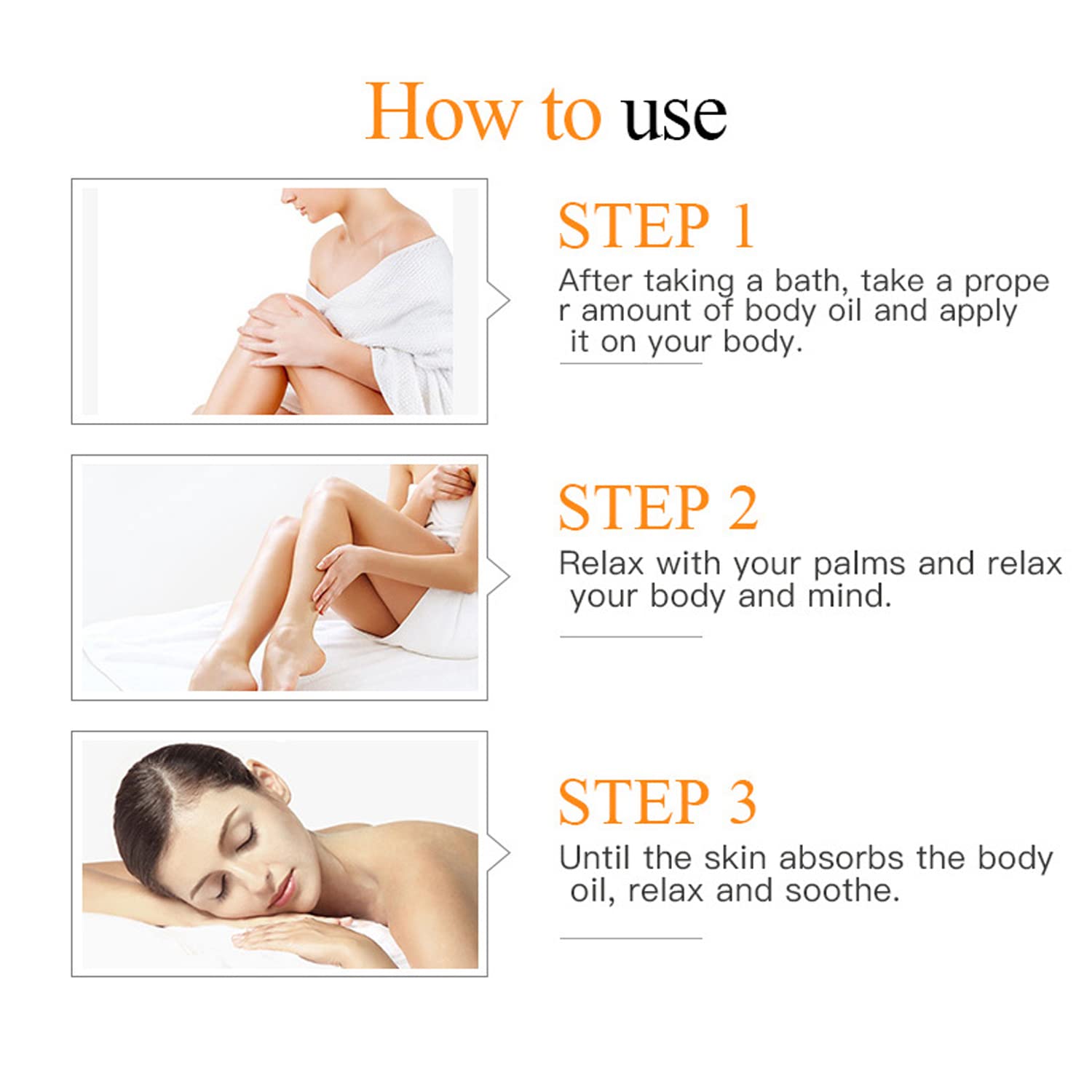 1. After taking a shower, take an appropriate amount of body oil and apply it to your body. 2. Relax and relax your body and mind with the palm of your hand. 3. While the skin is not absorbing body oil, relax and calm down.