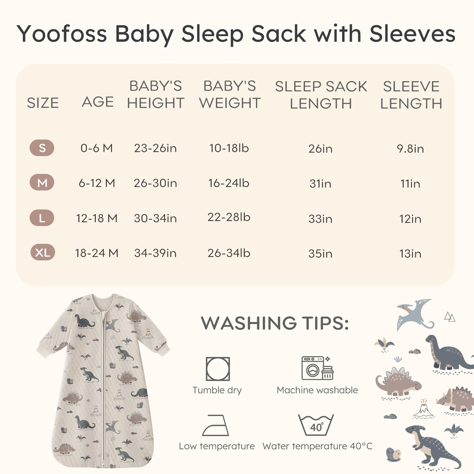 Available Size and Mahchine Washable: Available in 4 sizes for babies 0-24 months (S, M, L, XL). Machine washable for easy maintenance, these toddler sleep sacks retain their softness and durability wash after wash. Please measure your infant's height and weight, and refer to the size chart before choosing.