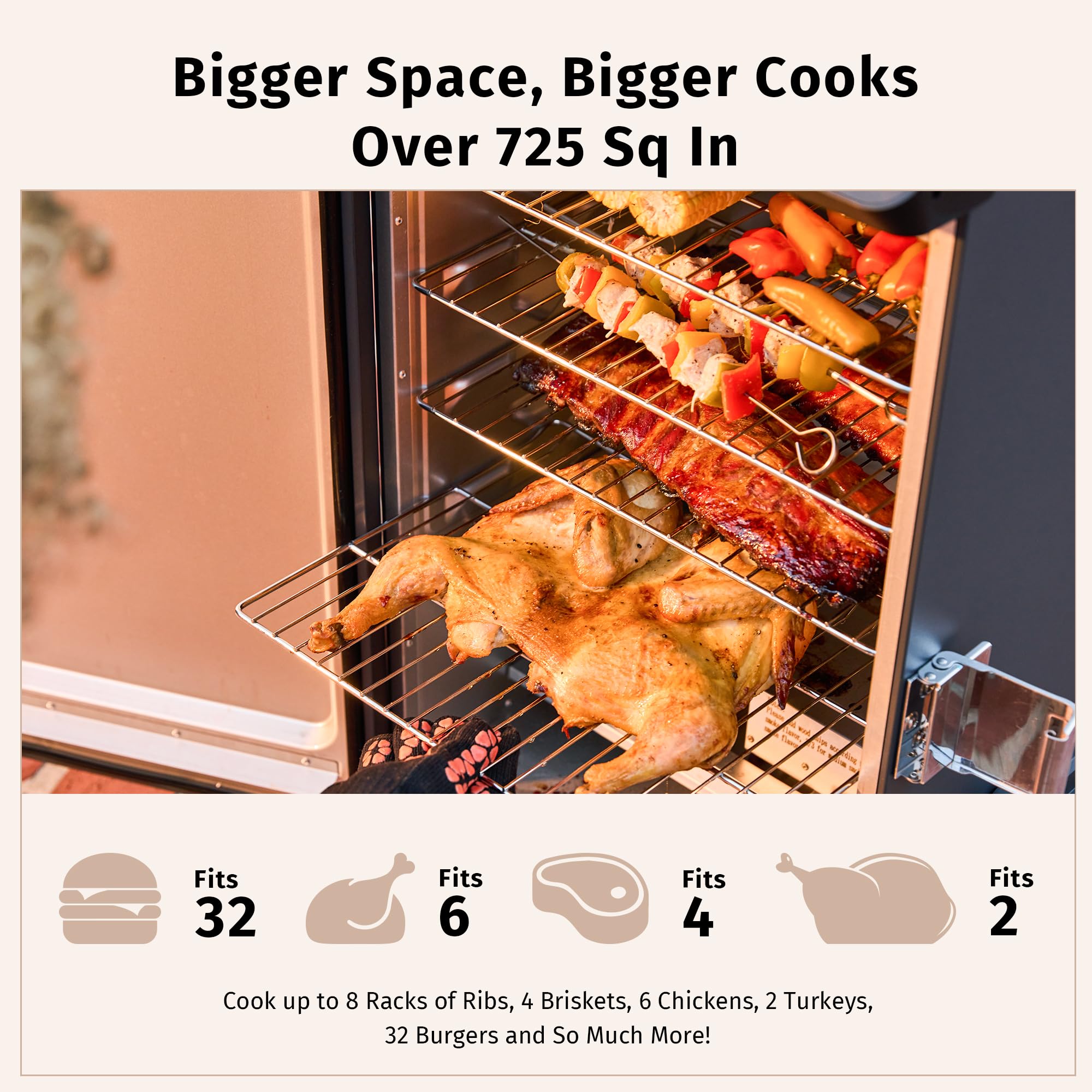 EAST OAK Smokers, unlike grills, use indirect heat to cook and flavor foods. Smokers are able to maintain a lower temperature range, allowing for a longer, slower, and gentler cooking process. This low-temperature, slow-cooking method results in tender meat with a strong, smoky flavor and a dreamy, fall-off-the-bone texture. Specifications: Color: Night Blue Capacity: 725 sq inches Dimensions: 17.56"L x 18.97"W x 32.44"H Temp Range: 100°F- 275° F / 38°CīŊ135°C Max Timing: 12 hours Before using the smoker for the first time, it's crucial to clean the device to remove any residues from the manufacturing process, like oil and dust. Follow these steps: 1. Clean the interior with a wet sponge and mild detergent, then air-dry. 2. Use a cloth with a bit of cooking oil to wipe the interior walls. Avoid applying oil to the smoke box, heating elements, grease tray, or water tray. 3. Keep water and smoke boxes empty with the vent open. 4. Power up the smoker, set it to 275°F, and run for 2 hours. 5. After 2 hours, cool down the smoker. 6. After completing the above steps, your smoker is ready for use. Note: During the initial heating, there may be some oil smoke and odors due to residues. This is normal and should largely dissipate after the high-temperature operation for 2 hours. This process can effectively remove impurities and odors. *Protective gloves are recommended during use.