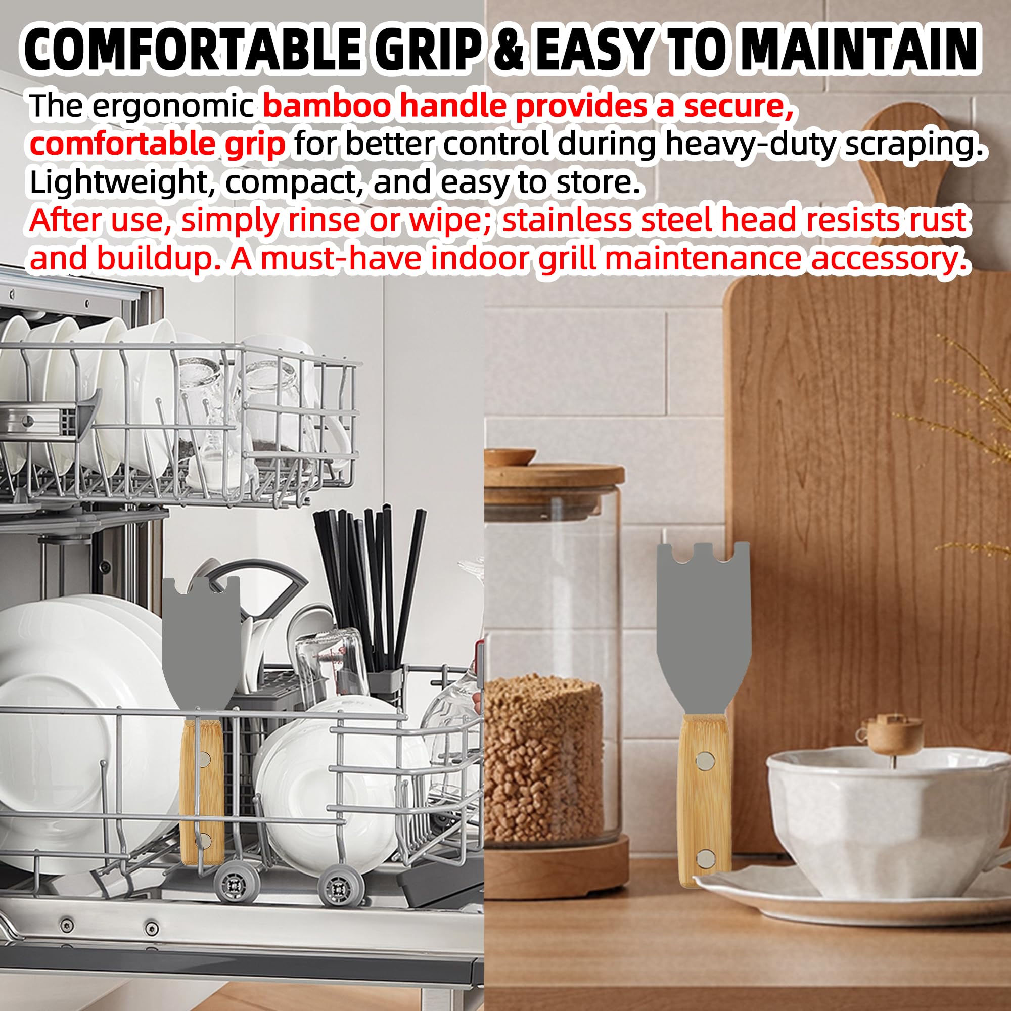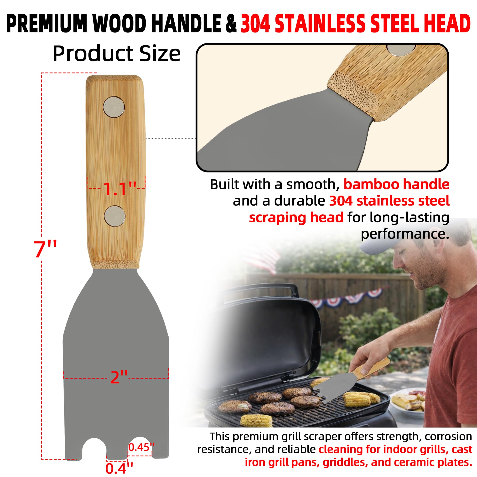 【Comfortable Grip & Easy to Maintain】The ergonomic bamboo handle provides a secure, comfortable grip for better control during heavy-duty scraping. Lightweight, compact, and easy to store. After use, simply rinse or wipe; stainless steel head resists rust and buildup. A must-have indoor grill maintenance accessory.