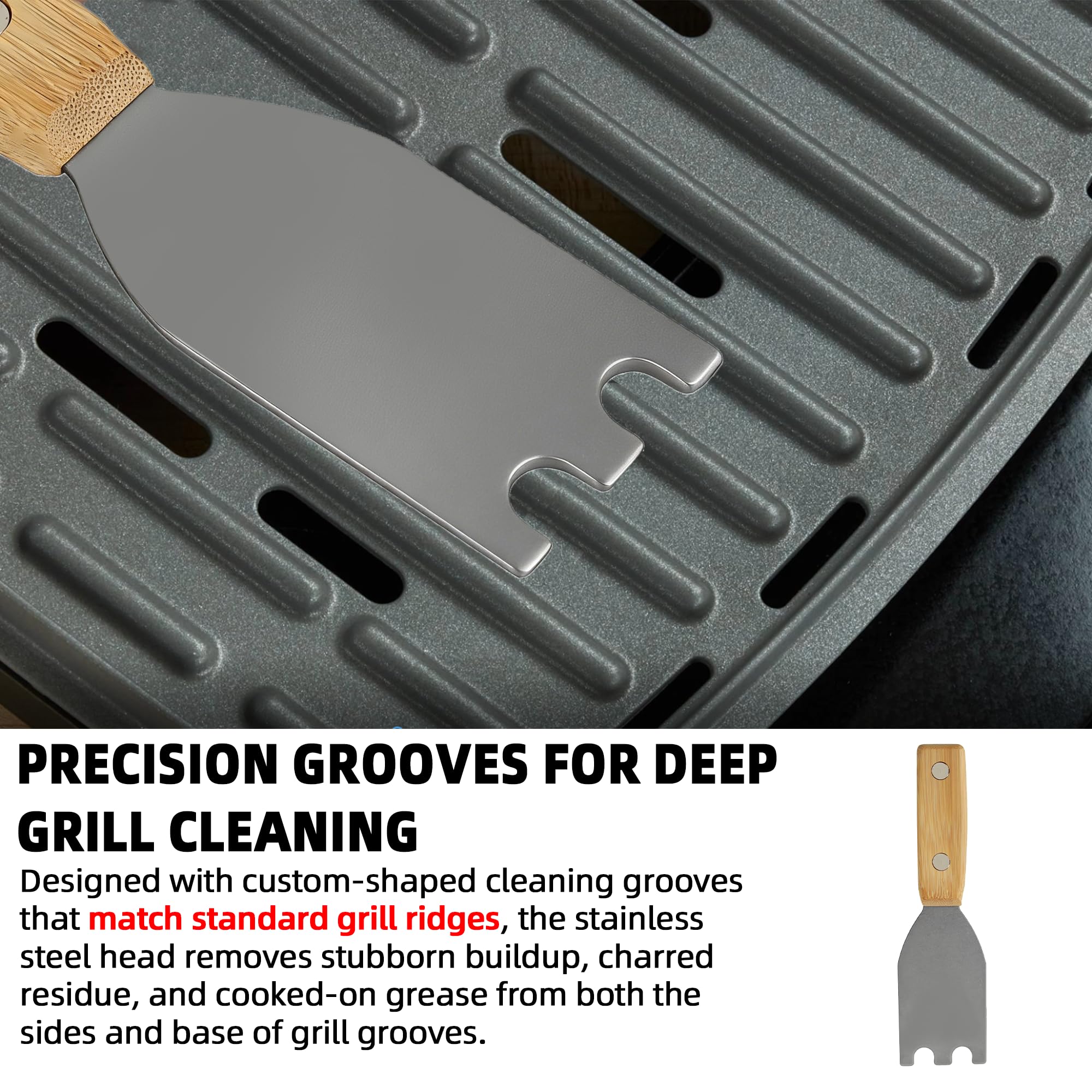 【Precision Grooves for Deep Grill Cleaning】Designed with custom-shaped cleaning grooves that match standard grill ridges, the stainless steel head removes stubborn buildup, charred residue, and cooked-on grease from both the sides and base of grill grooves. Ideal for cleaning grilled meats, veggies, and everyday cooking messes.