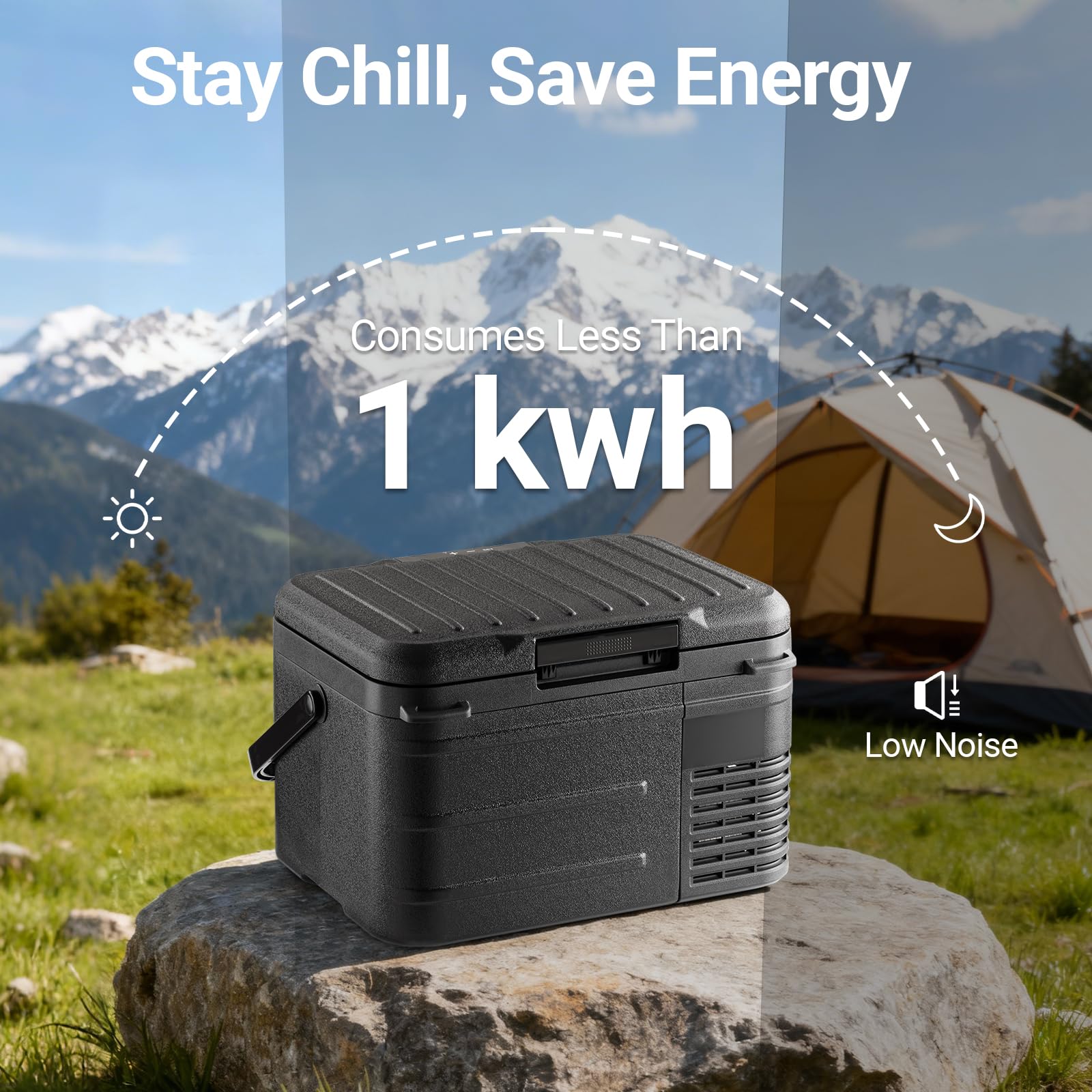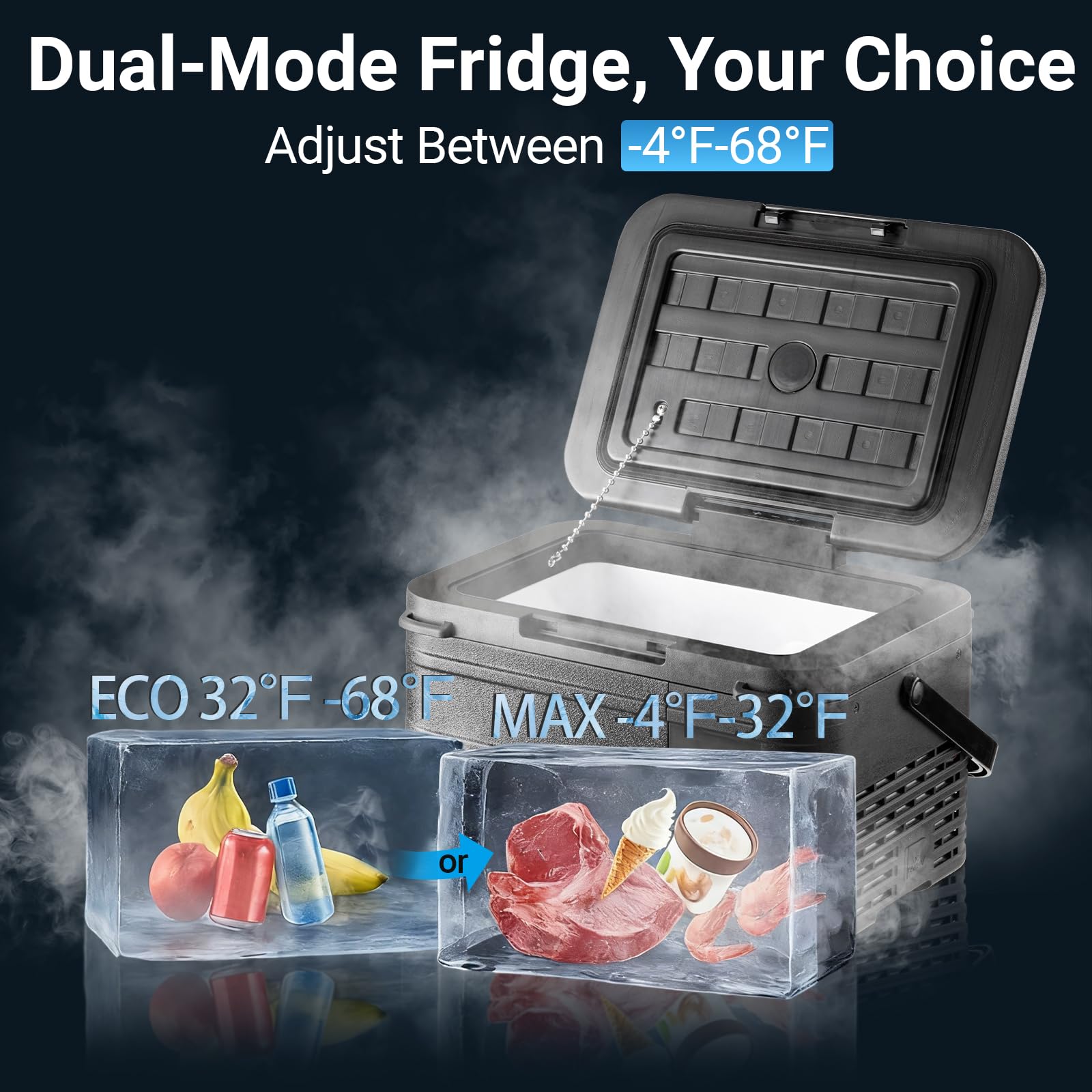 Powerful Compressor & Excellent Insulation: The car refrigerator is equipped with a high-efficiency variable frequency compressor, offering strong cooling capabilities with a temperature range from -4°F to 68°F. The portable freezer is UL energy certified, featuring an energy-saving ECO mode and a fast cooling MAX mode. The casing of car fridge is made of composite insulation and wear-resistant materials, ensuring superior insulation and protection during your trip.