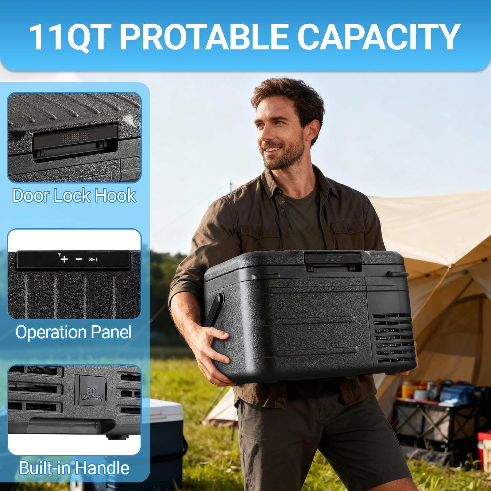 Lightweight & Portable Design: This portable refrigerator has a 11 Quart capacity and weighs only 16.3 lbs, making it convenient for storing all your food. The 12-volt refrigerator is equipped with an internal handle, making it easy to carry and move, thus reducing your burden during your journey.
