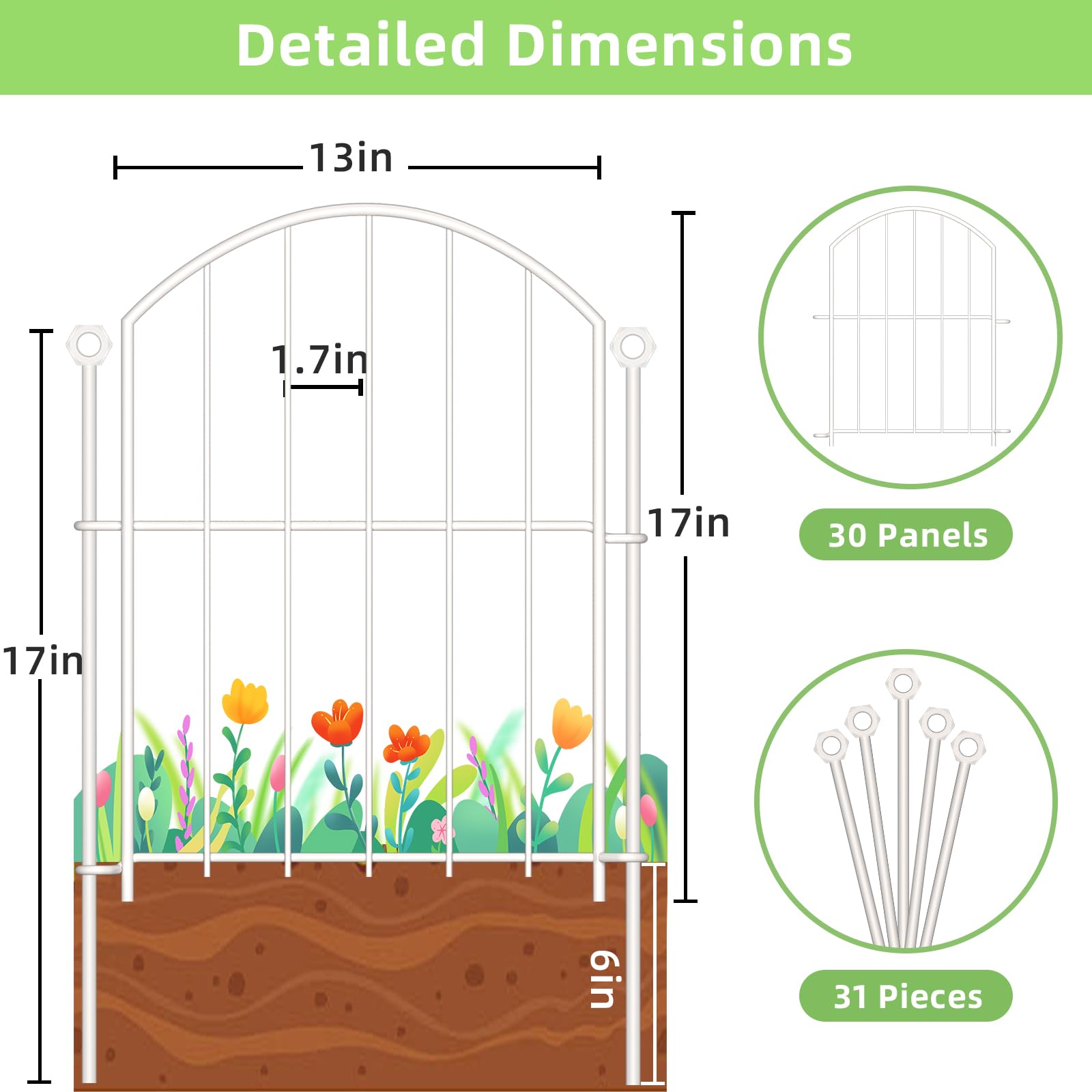Customizable Size: Our garden fence border comes with 30 panels, each fence panel 13" wide by 17" high, with a clearance of 1.7", for a total length of 30 ft. The metal fence is also equipped with 31 sturdy 17" metal stakes to securely anchor it to the ground , the maximum depth for inserting into the soil is 7 inches. The fence panels are flexible and can be easily extended and customized to fit your specific landscaping needs