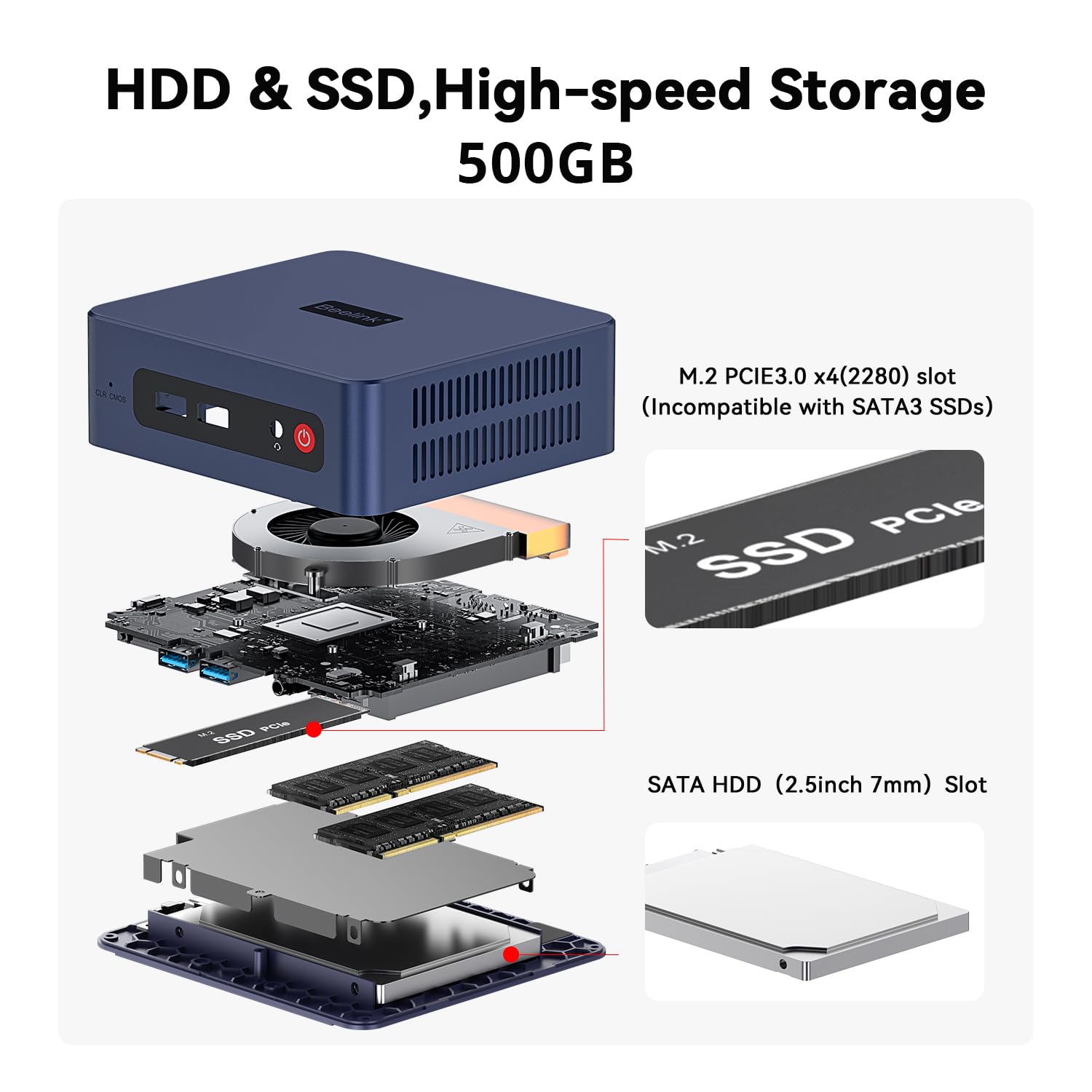 【High capacity & Expansion Options】Mini computer comes with 16GB 3200MHz DDR4 RAM (dual-channel, expandable up to 32GB, not included) and a 500GB M.2 PCIe 3.0 SSD, expandable up to 2TB. You can quickly launch and load applications,with ample storage space for files,pictures,videos,games,and more. Alternatively, add a 2.5-inch 7mm HDD (up to 2TB, not included) for expanded storage.