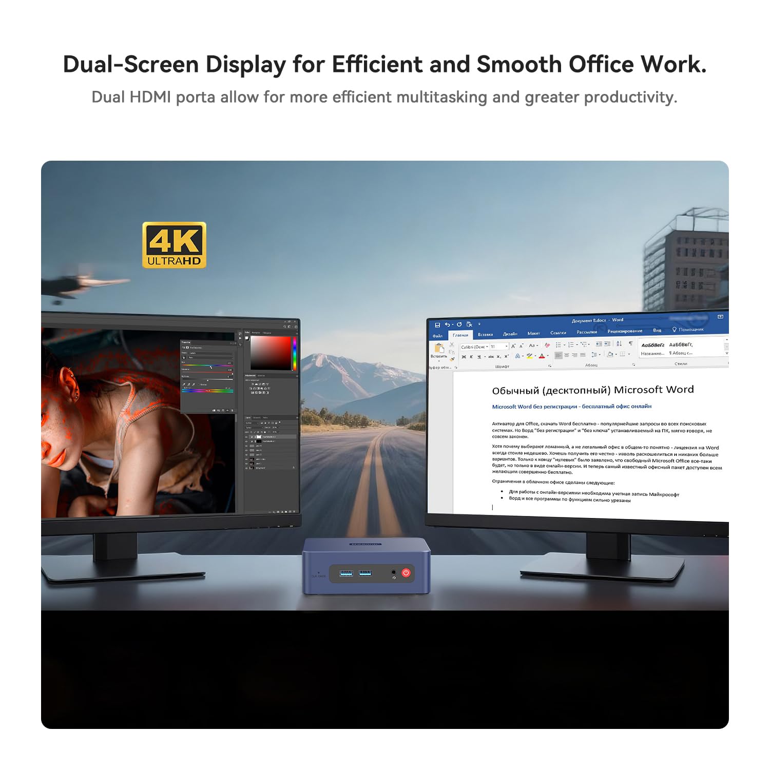 【4K HD Dual Display】This beelink mini computer features Radeon Vega 3 Graphics with 1200 MHz,supporting 4K FPS video playback and delivering powerful graphics processing. The dual HDMI interfaces can be connected to two monitors simultaneously, greatly enhancing your work efficiency.