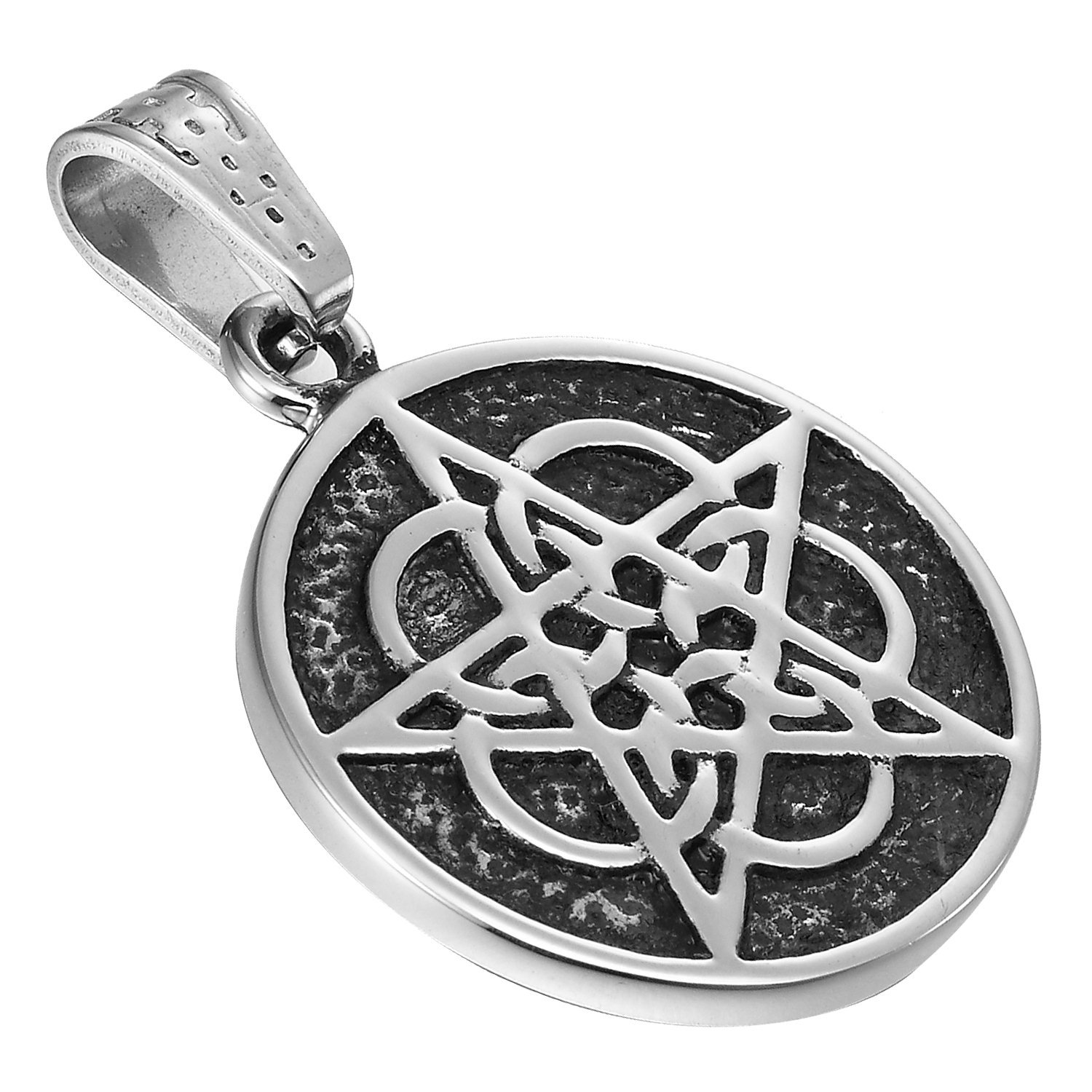 Description Getting the look of an aged heirloom pentagram necklace doesn't have to mean spending a fortune for an antique! The Urban Jewelry Vintage Style Pentacle Pentagram Crescent Moon Stainless Steel Pendant Necklace for Men looks like a necklace that has been handed down through the ages but is brand new and made from the finest quality non tarnishing stainless steel. Measuring 1.34 inches in diameter by 1.5 inch in thickness, the Urban Jewelry Vintage Style Pentacle Pentagram Crescent Moon Stainless Steel Pendant Necklace for Men presents two important symbols from many religious faiths. The crescent moon in the center has long been revered as a symbol of the harvest and is symbolic over the triumph over death in the Islamic faith. The pentagram is the embodiment of all five elements: earth, wind, water, fire and ether, which represents the spirit. Sold with a 21-inch stainless steel chain, the Urban Jewelry Vintage Style Pentacle Pentagram Crescent Moon Stainless Steel Pendant Necklace for Men arrives ready to wear in a stylish gift box. The necklace makes a very unique gift of faith for men for any occasion. Treat yourself or a special gentleman to the beauty of a vintage inspired necklace! Order the Urban Jewelry Vintage Style Pentacle Pentagram Crescent Moon Stainless Steel Pendant Necklace for Men today.