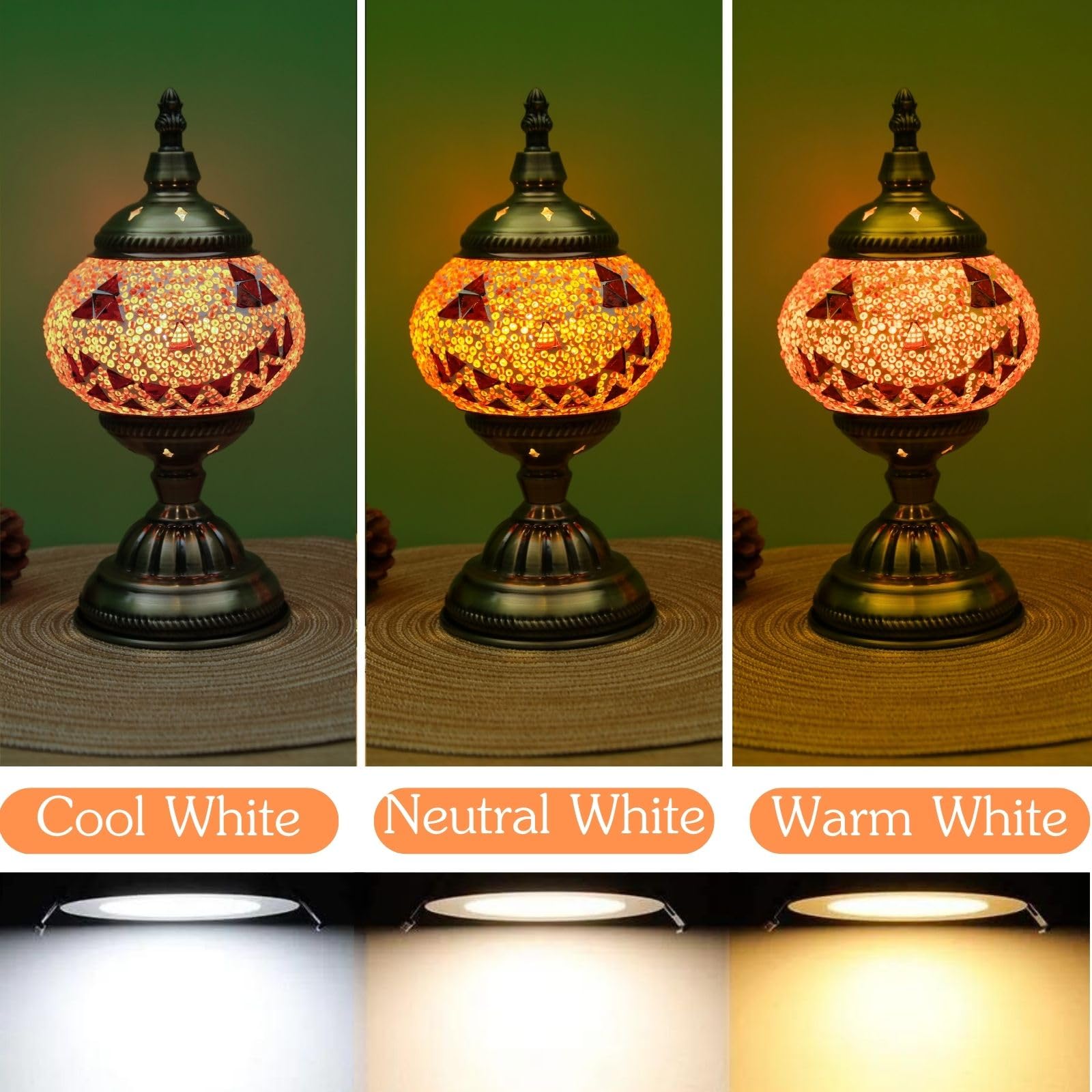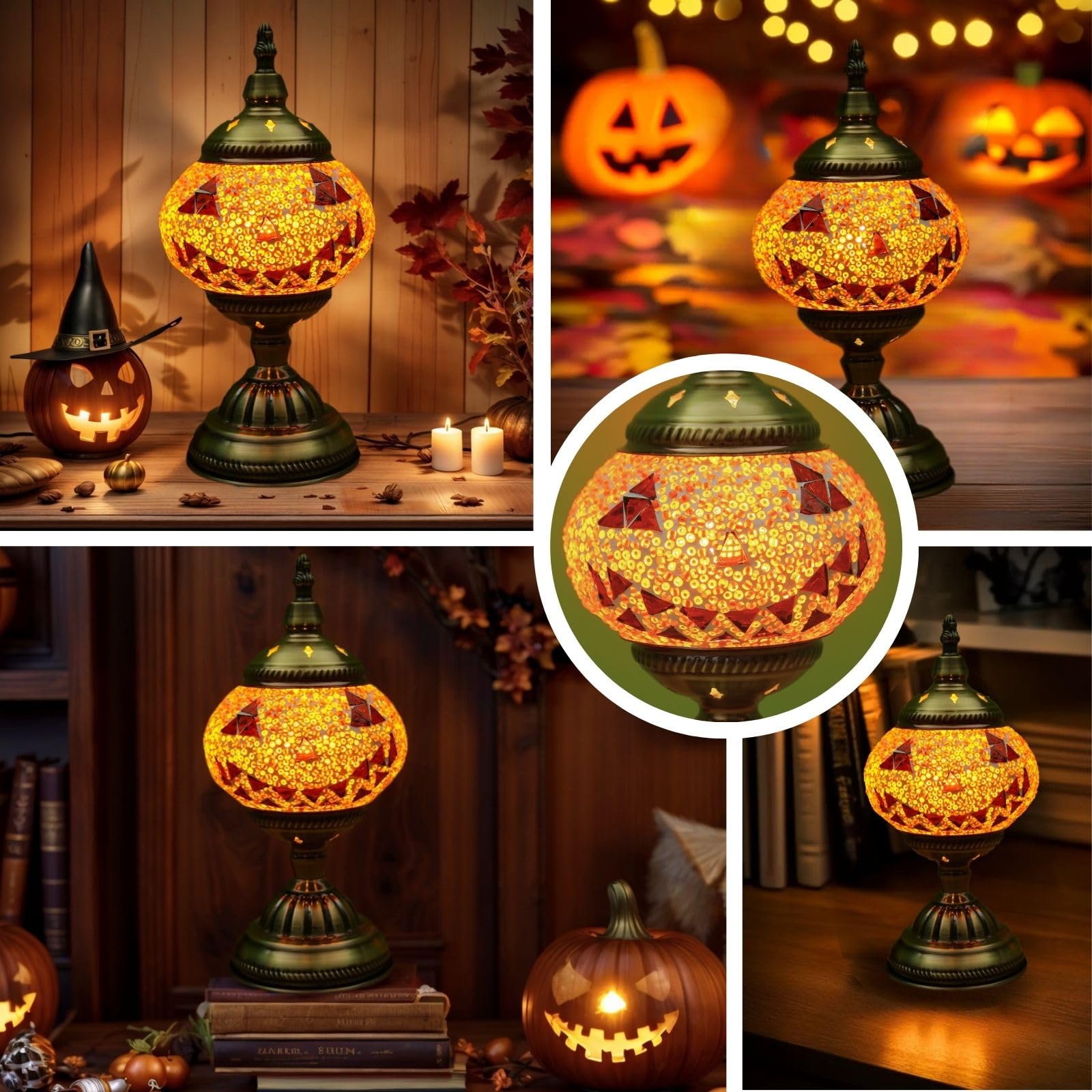 Enchanting Halloween Glow: Handcrafted Turkish mosaic pumpkin lantern emits vibrant stained glass light, creating magical ambiance for US homes.