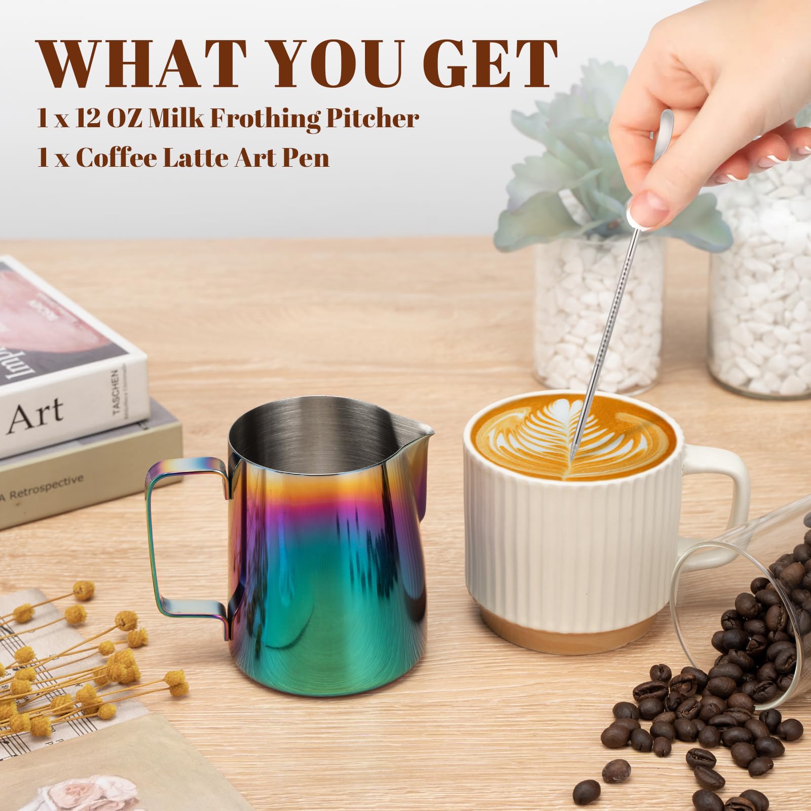 LATTE PEN: Amrules milk frother pitcher comes with a 304 stainless steel latte art pen, which features anti-slip design in the middle for easy use. You can make especial and beautiful patterns on your latte without a trembling hands