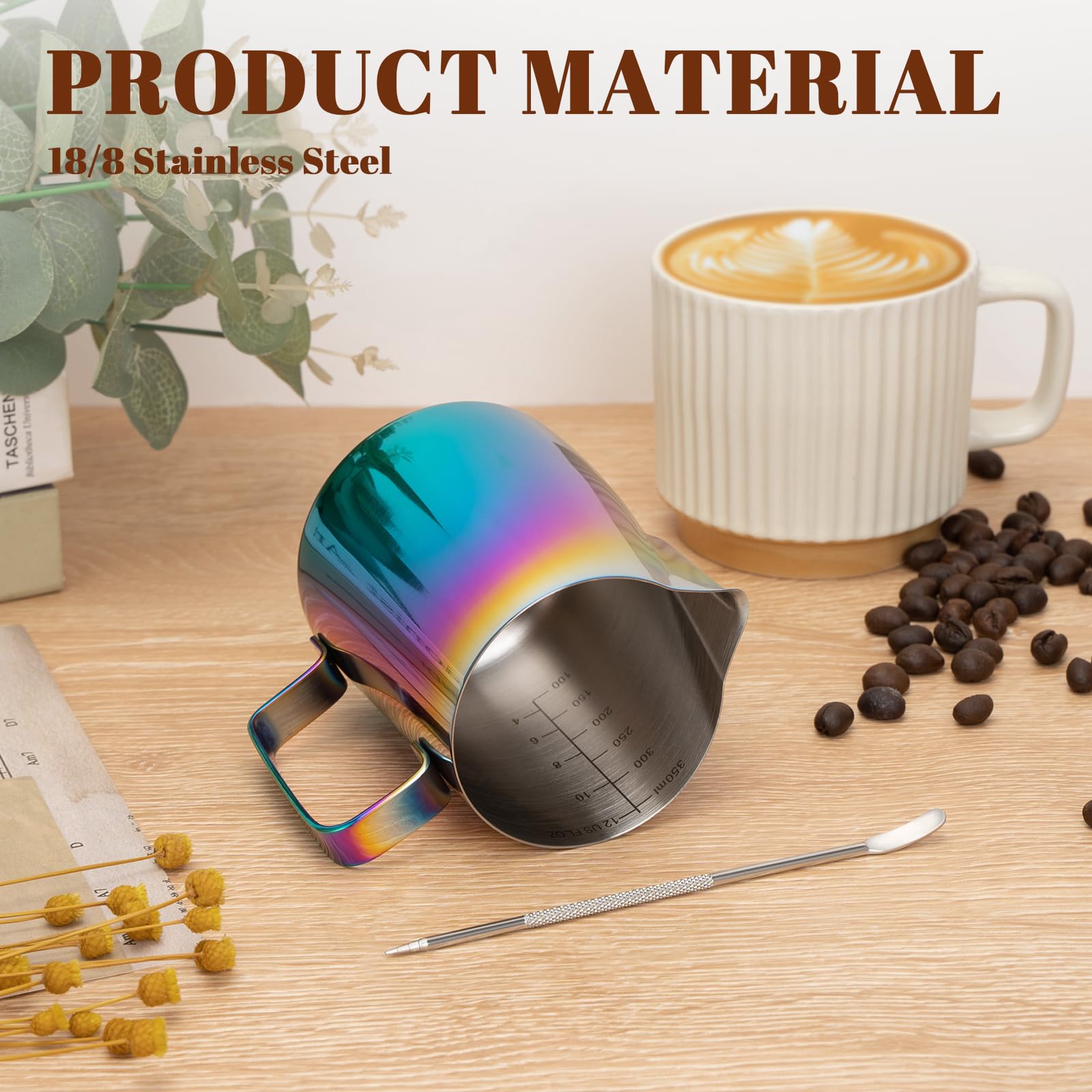 COMFORTABLE HANDLE: The handle of the milk frothing cup is ergonomically designed, with rounded top and bottom corners; easy to gripping and use, allowing you to make beautiful coffee art patterns with your hands