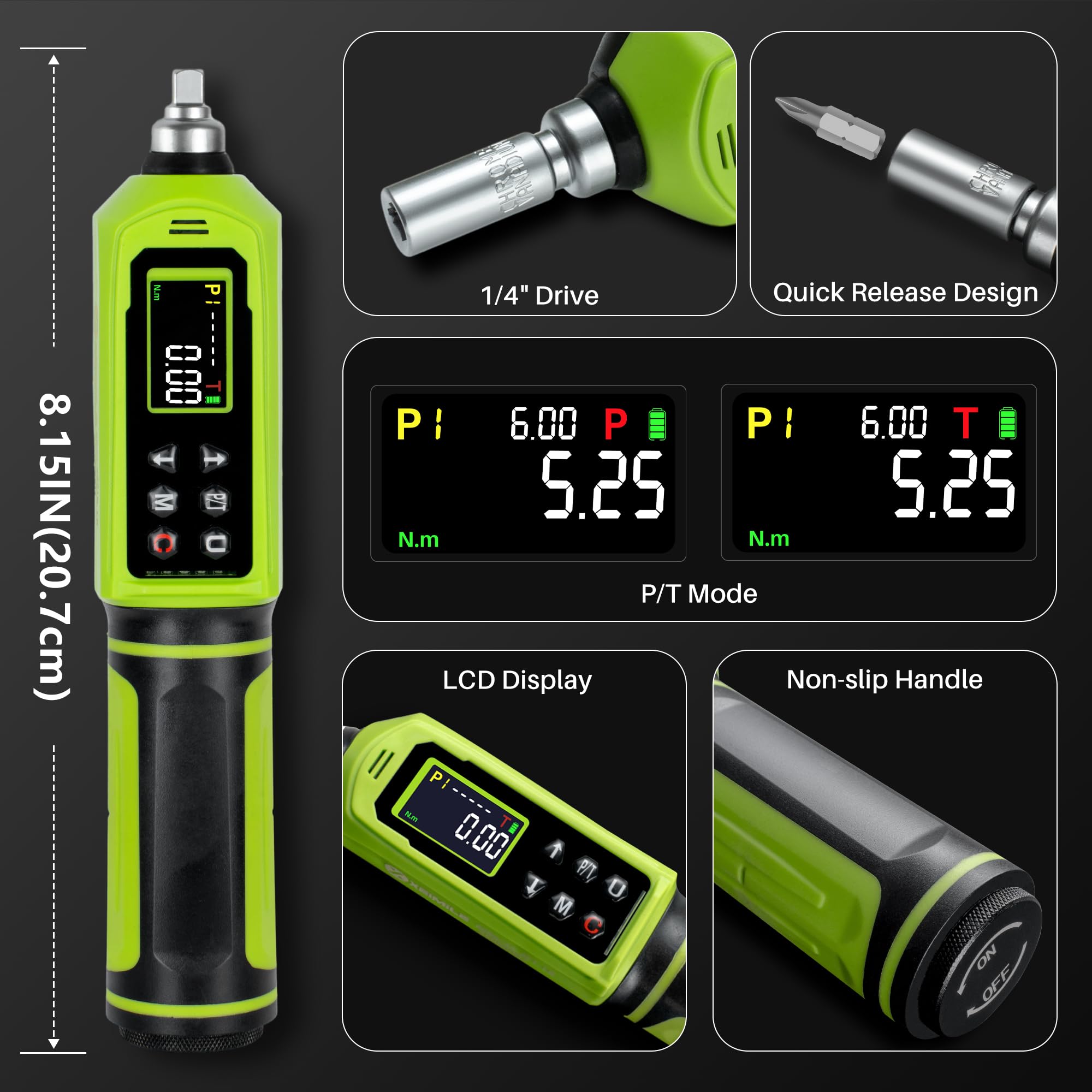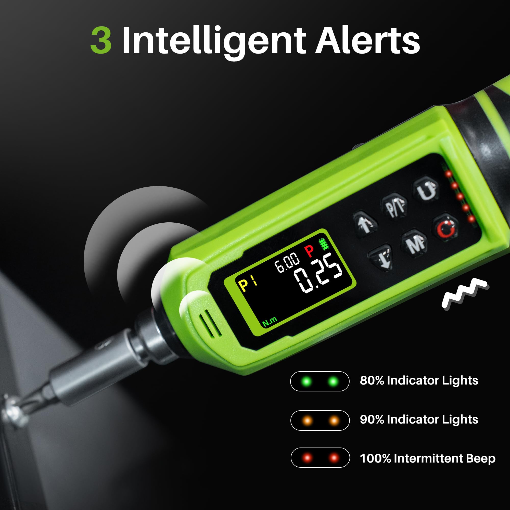 AUDIBLE AND VISUAL REMINDER The electric screwdriver features a high-contrast LCD screen for easy reading. It provide clear audible alerts and flashing lights as approach and reach the torque, helping prevent under-tightening and over-tightening