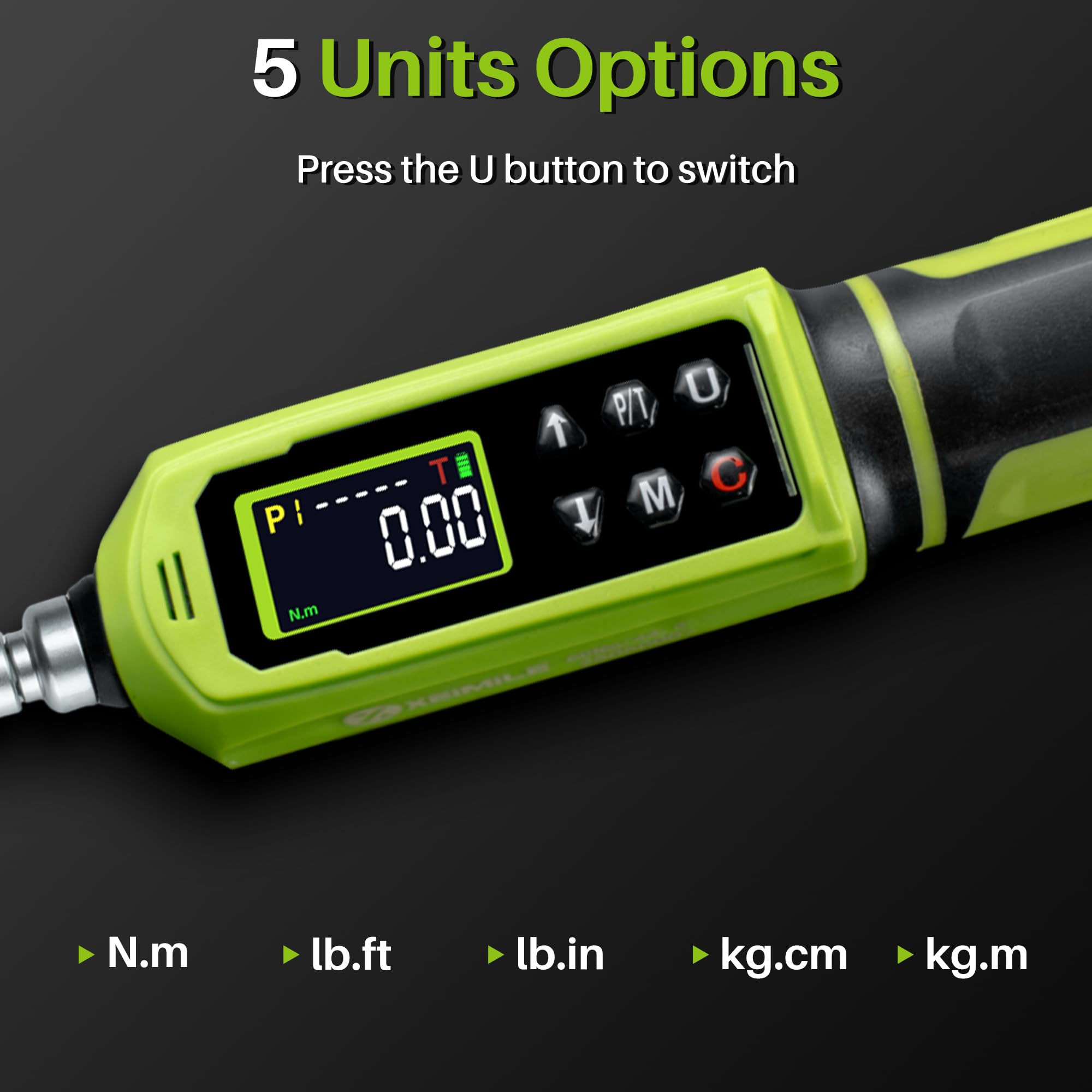 EFFICIENT AND USER-FRIENDLY Torque screwdriver features 9 customizable preset torque values for quicker work. It support 5 measurement units (N.m,lb.ft,in.lb,kg.cm,kg.m)and includes Peak and Track modes(store 500 data)for versatile torque monitoring