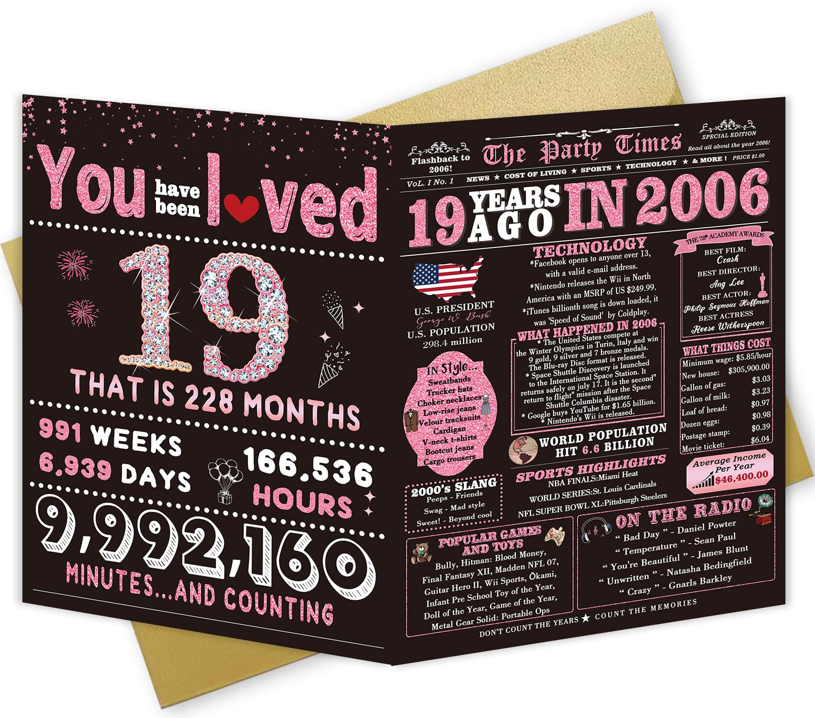 This 19th birthday card is perfect for girls, featuring a "Back in 2006" theme with rose gold accents, making her special day unforgettable.