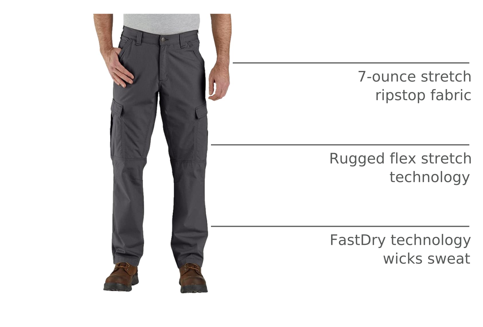 Description These men's lightweight Carhartt pants are equal parts durable and flexible. The stretch ripstop fabric wicks away sweat and fights odor. Made to move, the relaxed cut has a comfortable fit through the seat and thigh. Stash your tools in the multiple cargo and utility pockets. 7-ounce, 69% Cotton, 31% Polyester stretch ripstop. Built to move with Rugged Flexยฎ stretch technology. Built with Force technology to wick sweat, dry fast, and fight odors. FastDryยฎ technology keeps you cool for all day comfort. Relaxed Fit: Comfortable fit through the seat and thigh with more room to move. Strong sewn-on-seam belt loops. Comfortable gusseted crotch for more stretch between the legs. Reinforced front slash pockets. Cargo and utility pockets. Heavy-hauling reinforced back pockets