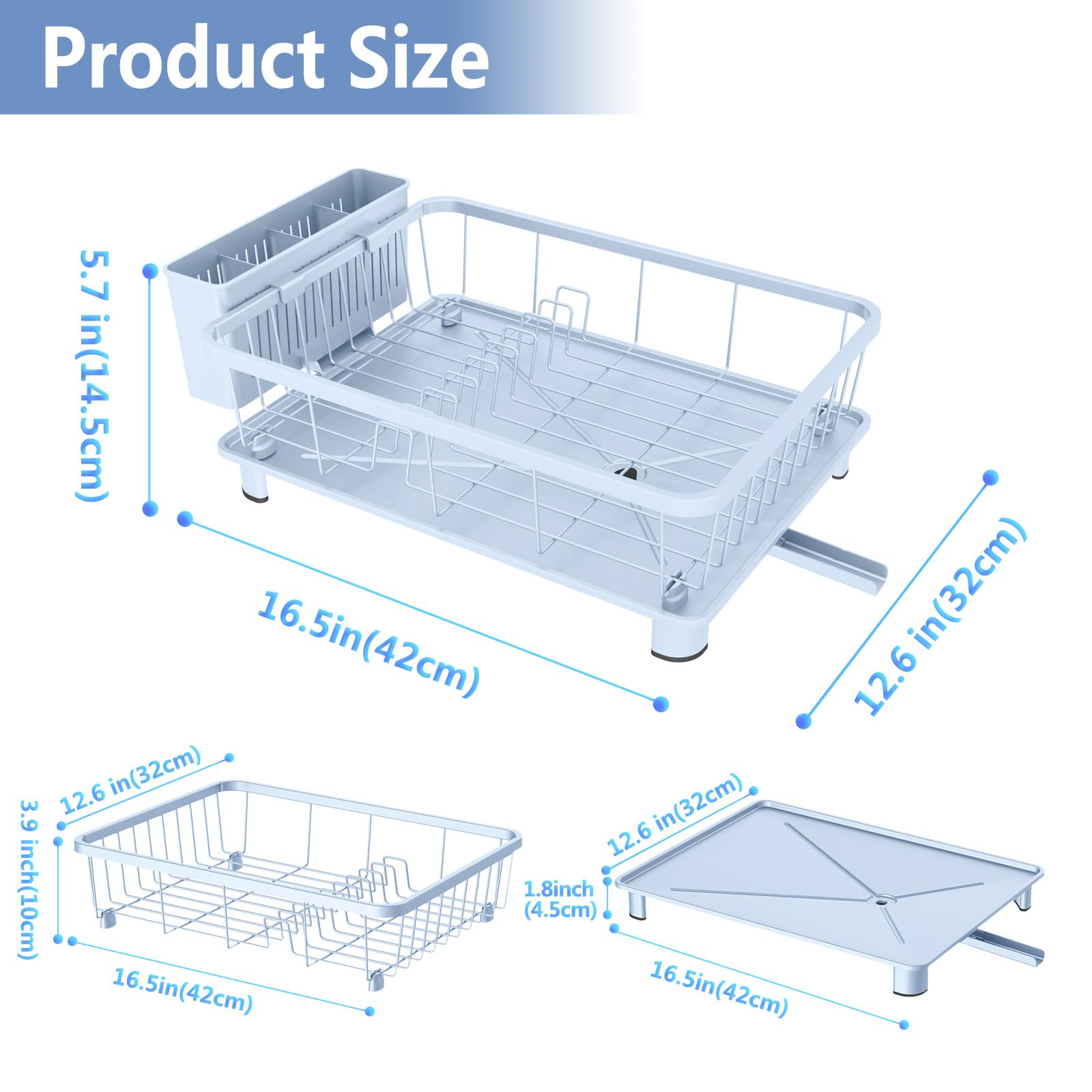 【SPACE SAVING DISH RACK】The Hiviweer dish rack measures 16.5"Dx 12.6"W x5.71"H, (Manual measurement with slight error) which can hold different sizes of dishes. Have a detachable four-compartment utensil holder, you can personalize the arrangement of your cutlery, spoons, knives, forks, and other kitchen essentials.