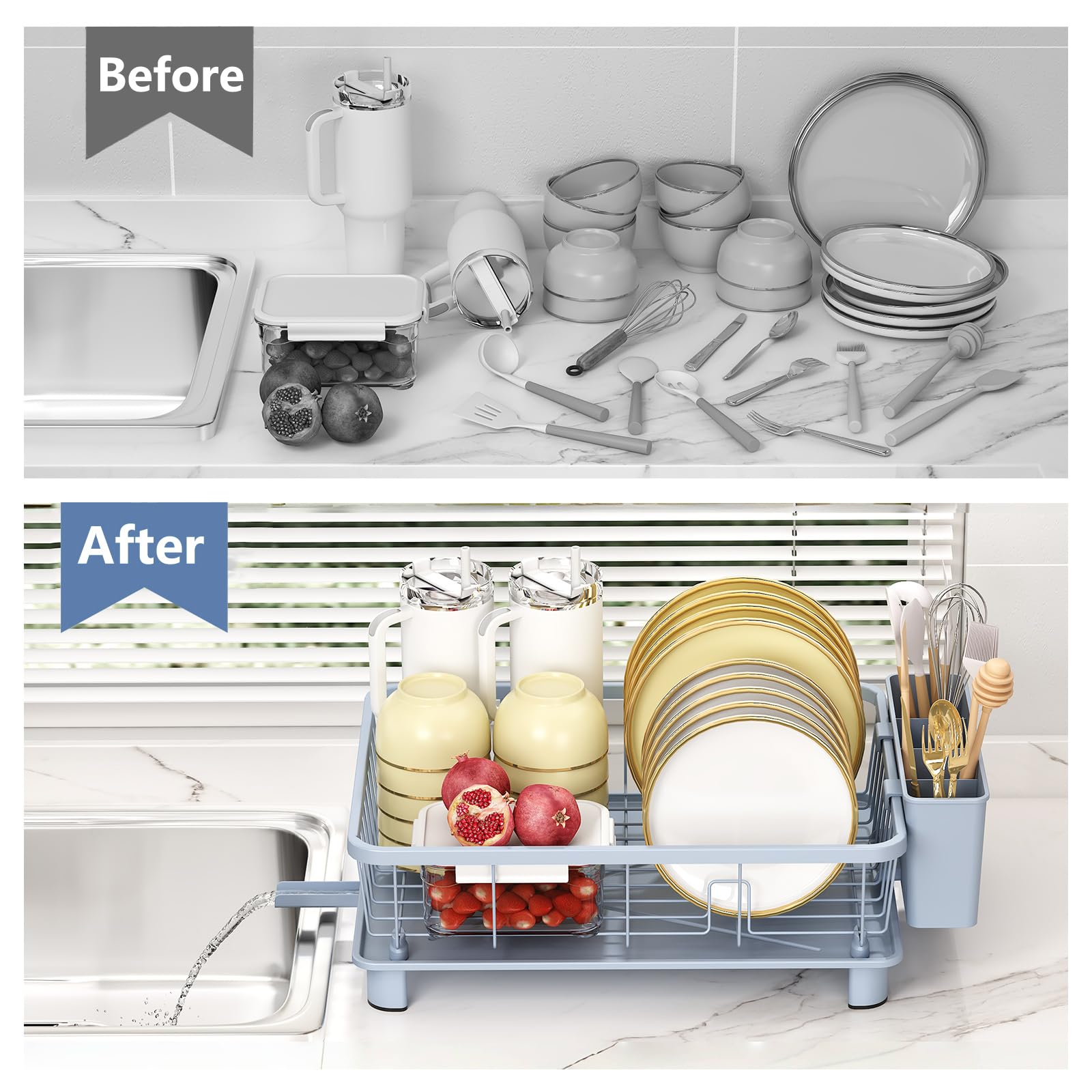 【STURDY & RUSTPROOF】The sink dish drying rack is made of high quality carbon steel, protected by a spray coating on the surface, which can effectively prevent rust or discoloration damage, durable. Compared to other metal framed racks, our products add a layer of PP plastic frame, which is not only beautiful, but also better protects dishes and kitchenware. This kitchen drying rack has passed the 24-hour salt spray test, making it a reliable choice.