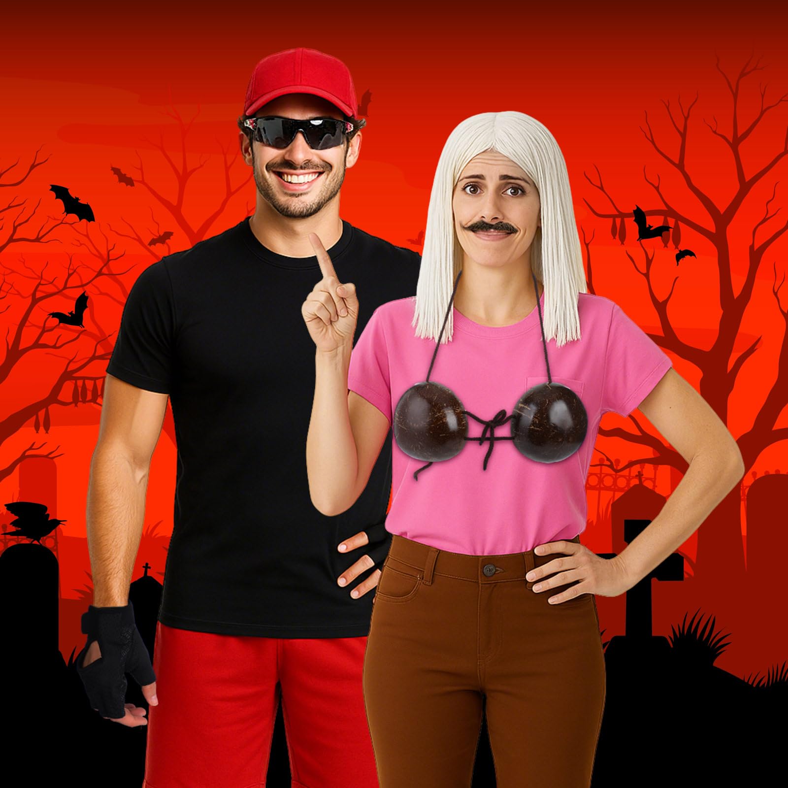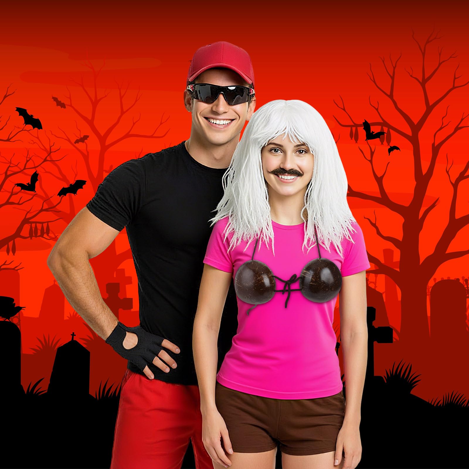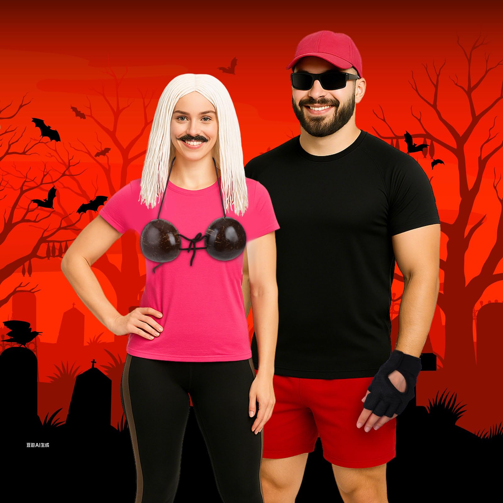 Fun Couples Costume: inject a dose of humor into your evening with our couples costume; The combination of the coconut bikini top, quirky wig, and amusing accessories makes it a fun choice for those looking to enjoy a halloween comedy movie costume moment