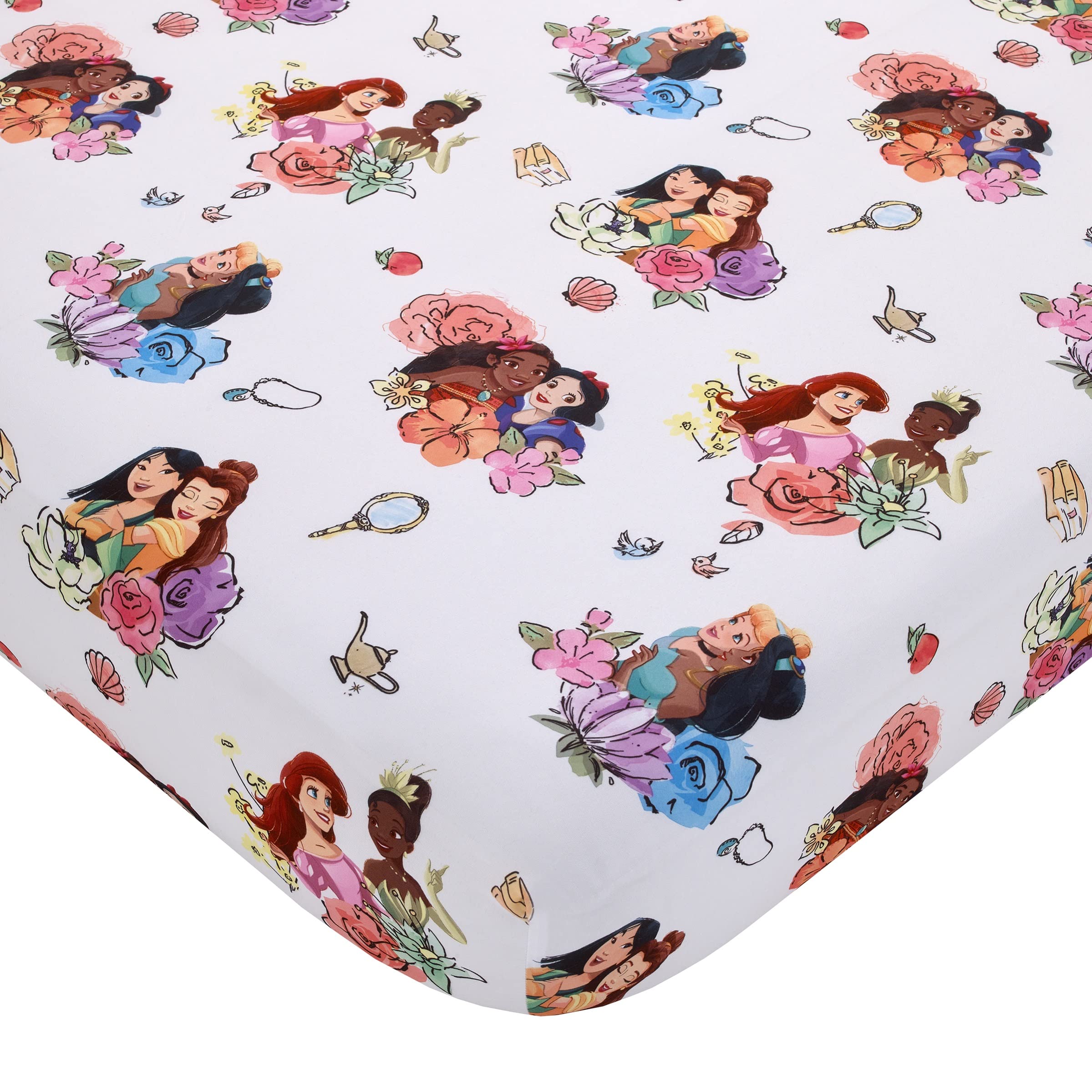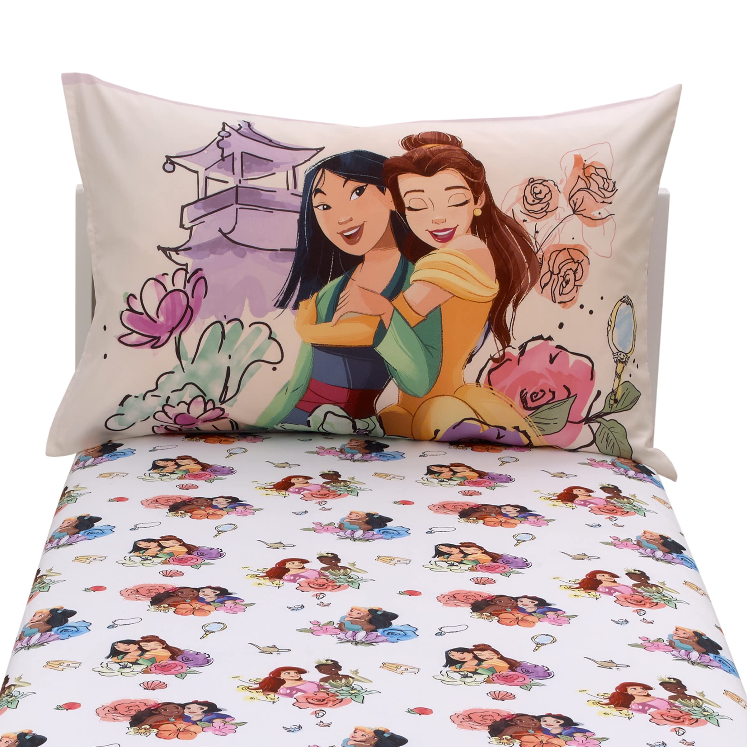 The Disney Princesses Courage & Kindness 2 Piece Toddler Sheet Set includes a fitted bottom sheet and reversible pillowcase. Features a pretty pattern with enchanting princesses, Ariel and Tiana, Mulan and Belle, Cinderella and Jasmine, Moana, and Snow White. Designed in shades of pink, blue, and white. Made of super soft fabrics for a snuggly sleeping surface. The 20" x 30" pillowcase is reversible, and the fitted sheet measures 28" x 52" x 8". Fits a standard size mattress. Includes full elastic edges for a safe and snug fit. Perfect for your little princess! Coordinates with Disney Princesses Courage & Kindness toddler bedding and accessories!