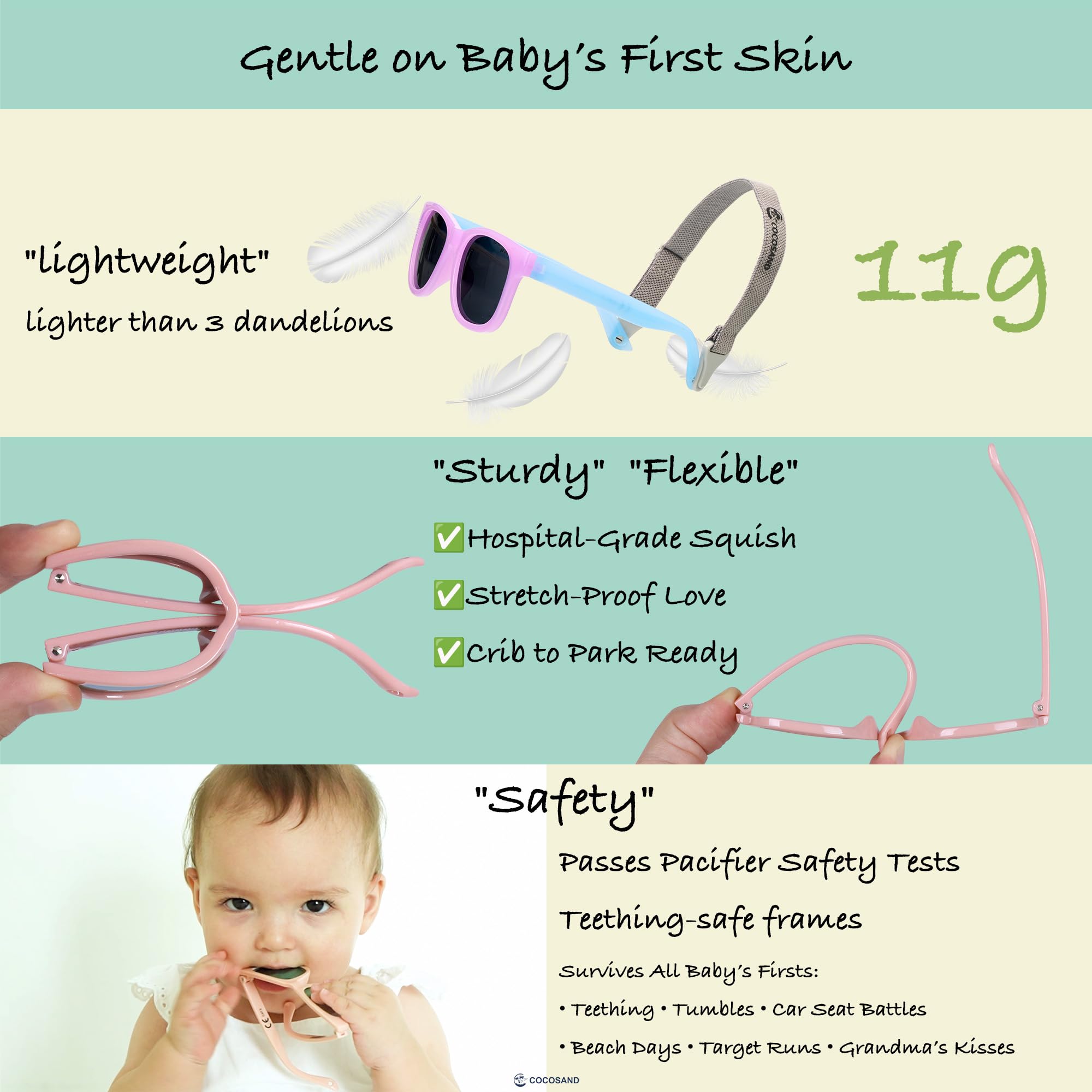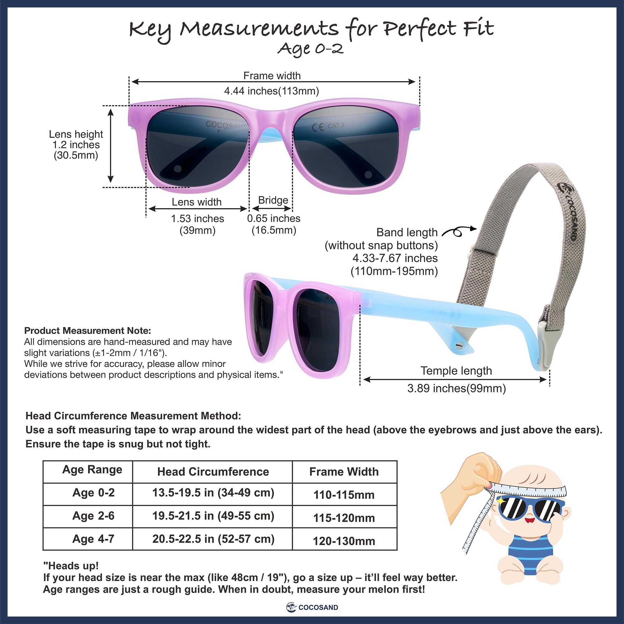 【Perfect Fit for Growing Babies】:Our infant sunglasses fit babies with head circumferences up to 48cm. The adjustable temple and 110 - 195mm strap mean a custom fit for every stage. Whether your baby boy or baby girl is growing fast, these sunglasses grow with them