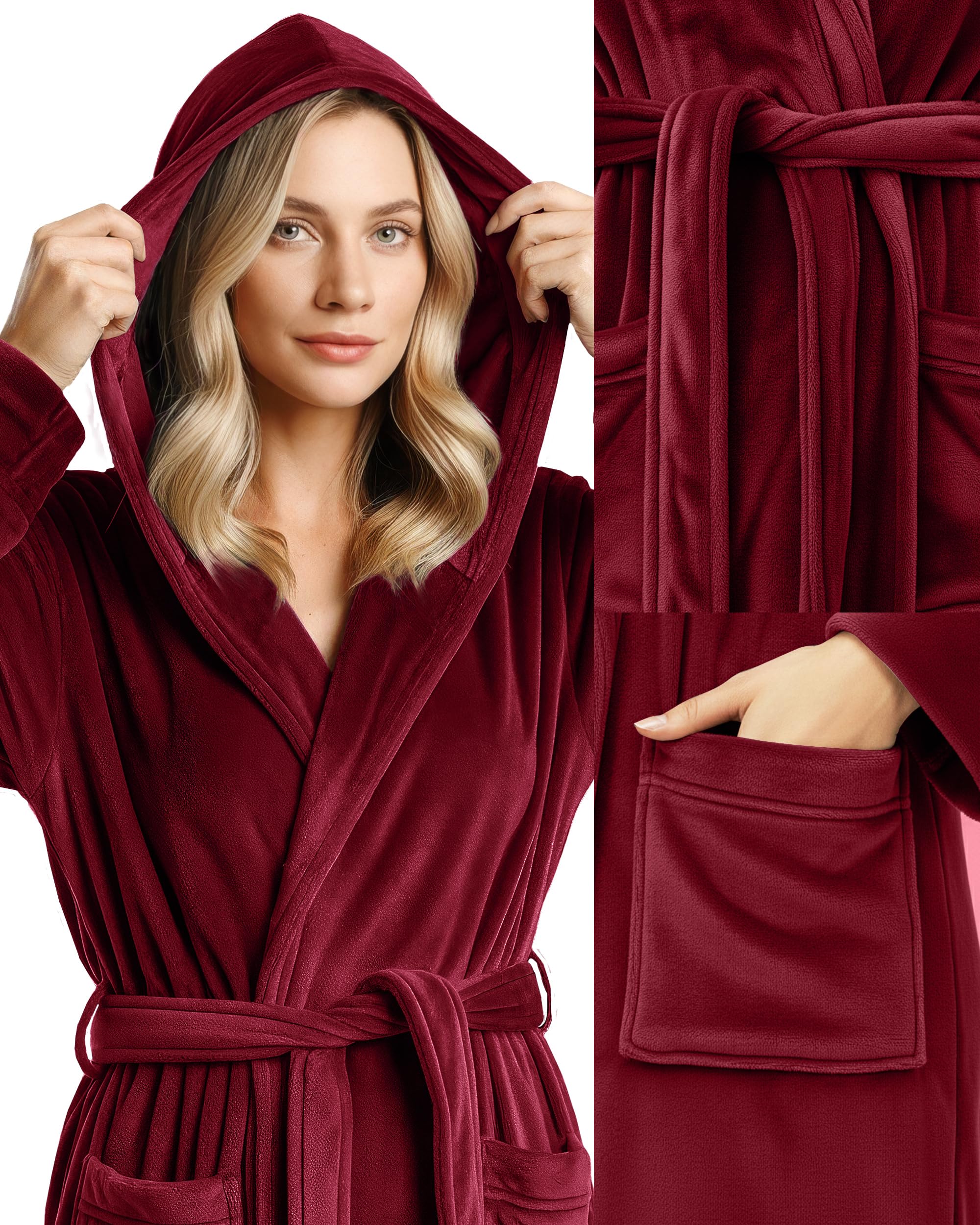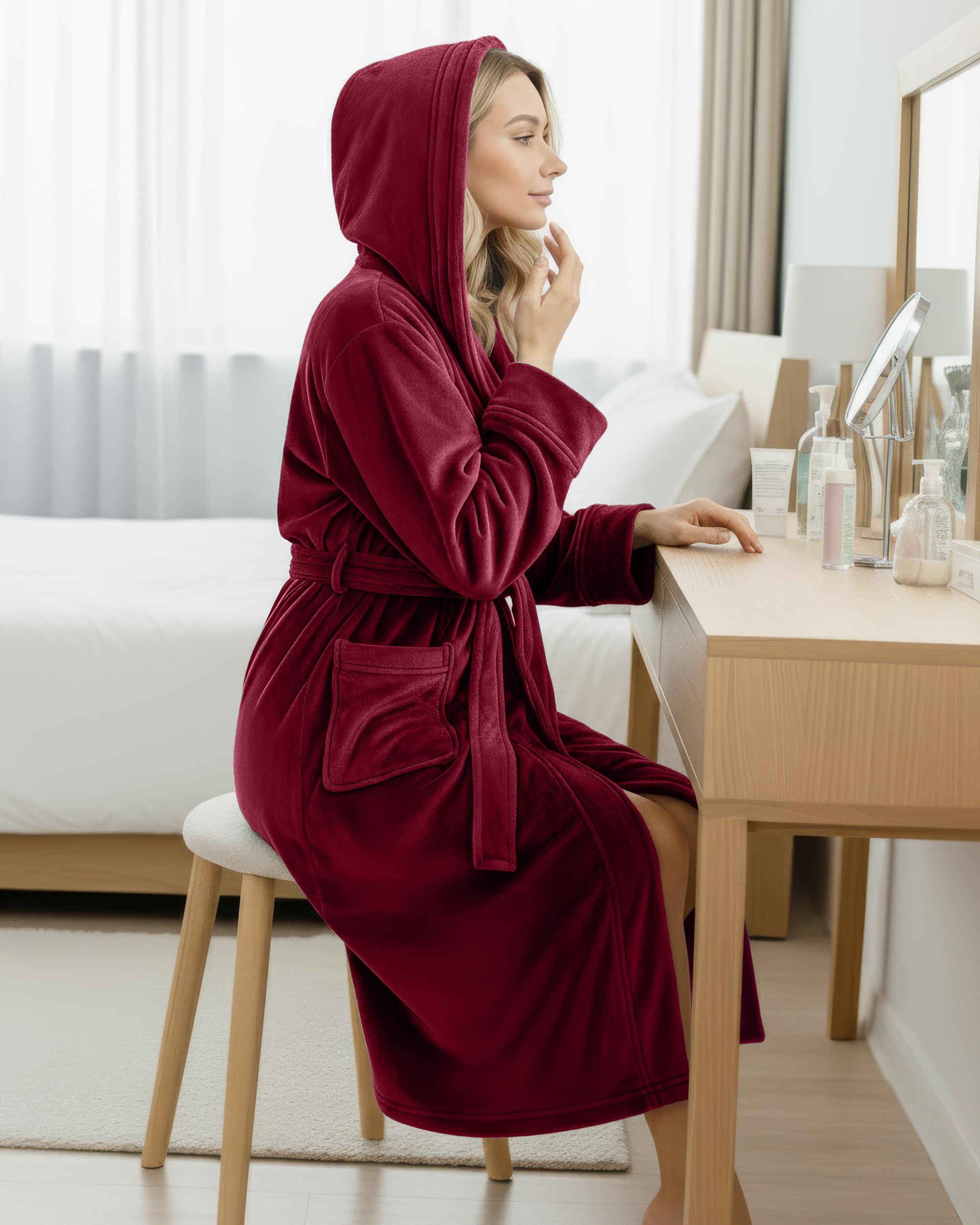 Description Enjoy refined comfort with our Women’s Hooded Bathrobe, thoughtfully created for cozy, luxurious relaxation. Designed with a soft hood for extra warmth, this bathrobe is crafted from plush, fluffy fleece with an ultra-soft feel that’s gentle on the skin. Made for comfort instead of absorbency, this non-absorbent bathrobe is ideal for post-shower lounging, peaceful mornings, or relaxing evenings at home. Its stylish design and premium appearance bring everyday luxury while keeping you warm and comfortably at ease.