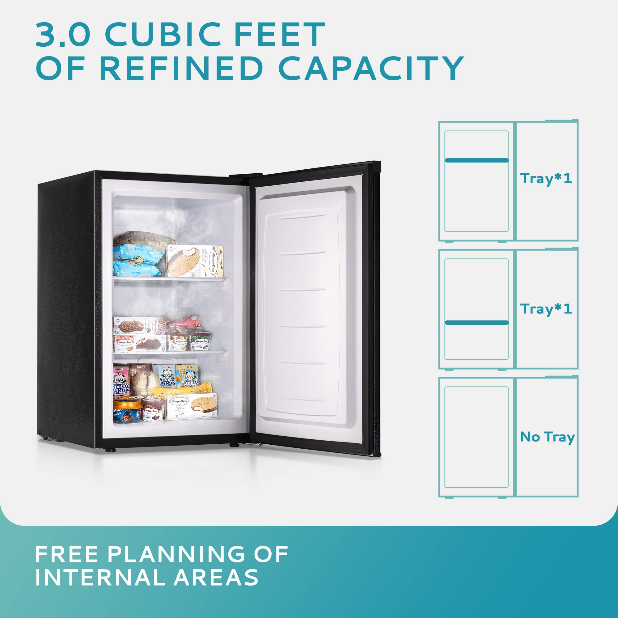 EUHOMY - RESPONSIBLE FOR YOUR FOOD - Euhomy’s mini freezer uses 3D refrigeration technology, and rapid cooling technology is good for food fresh and storage. The internal capacity (3.0 cu.ft) and the multilayer structure allow you to have more choices. It can not only provide ample storage space for food/fruit/vegetables/seafood/ice cream, but also prevent odor, allowing you to enjoy clean and odorless food all the time.