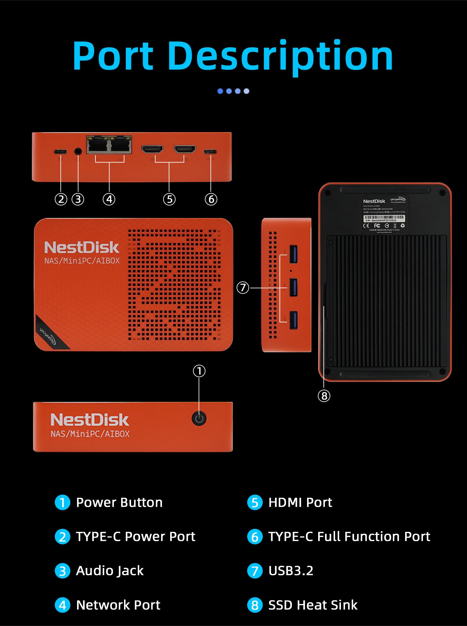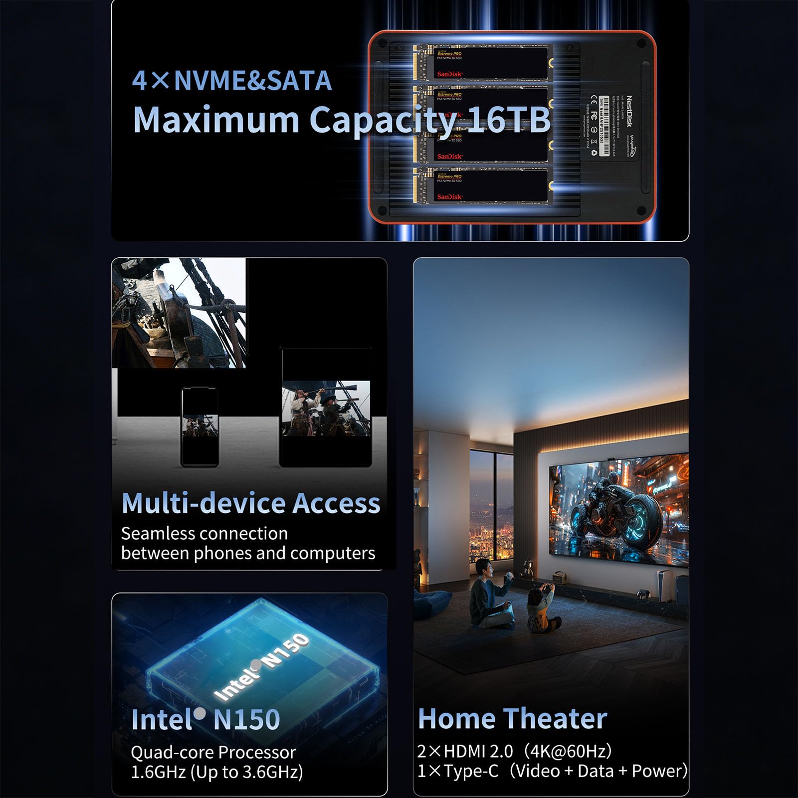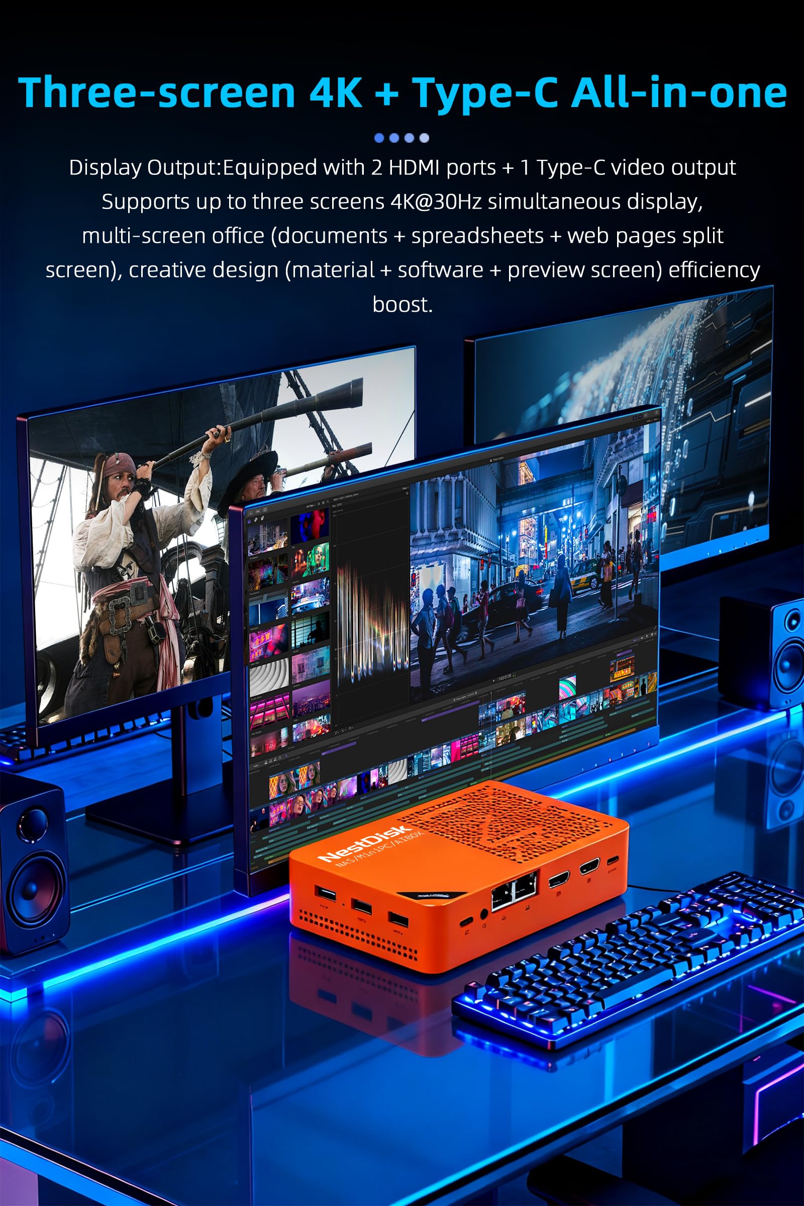 [Triple 4K Collaborative Workspace] YOUYEETOO Nest Disk NAS Supports triple 4K 60Hz signal output via dual HDMI & Type-C ports, compatible with 4K monitors for multi-screen productivity and entertainment. Operates as a Theatre Media Centre for seamless playback of high-definition content, catering to financial multi-screen operations, audio-visual editing, and multilingual interface requirements. An efficient assistant for creative professionals and office users alike.