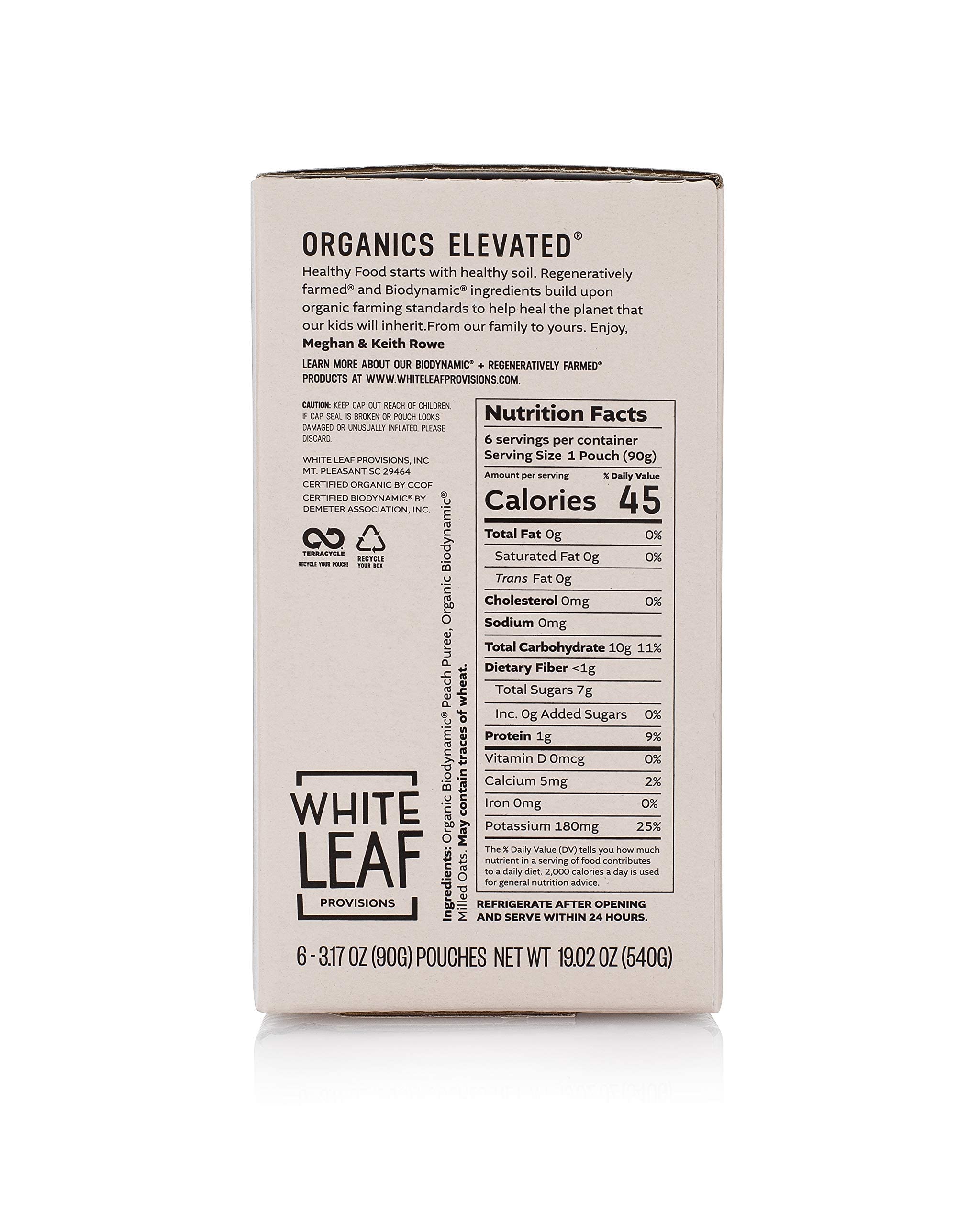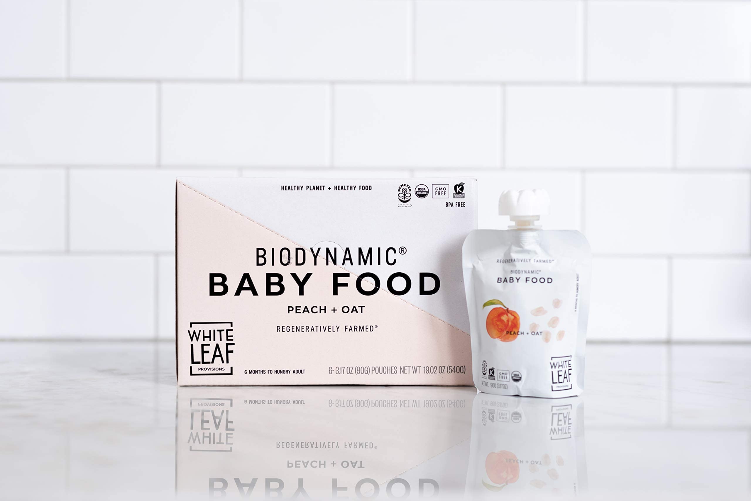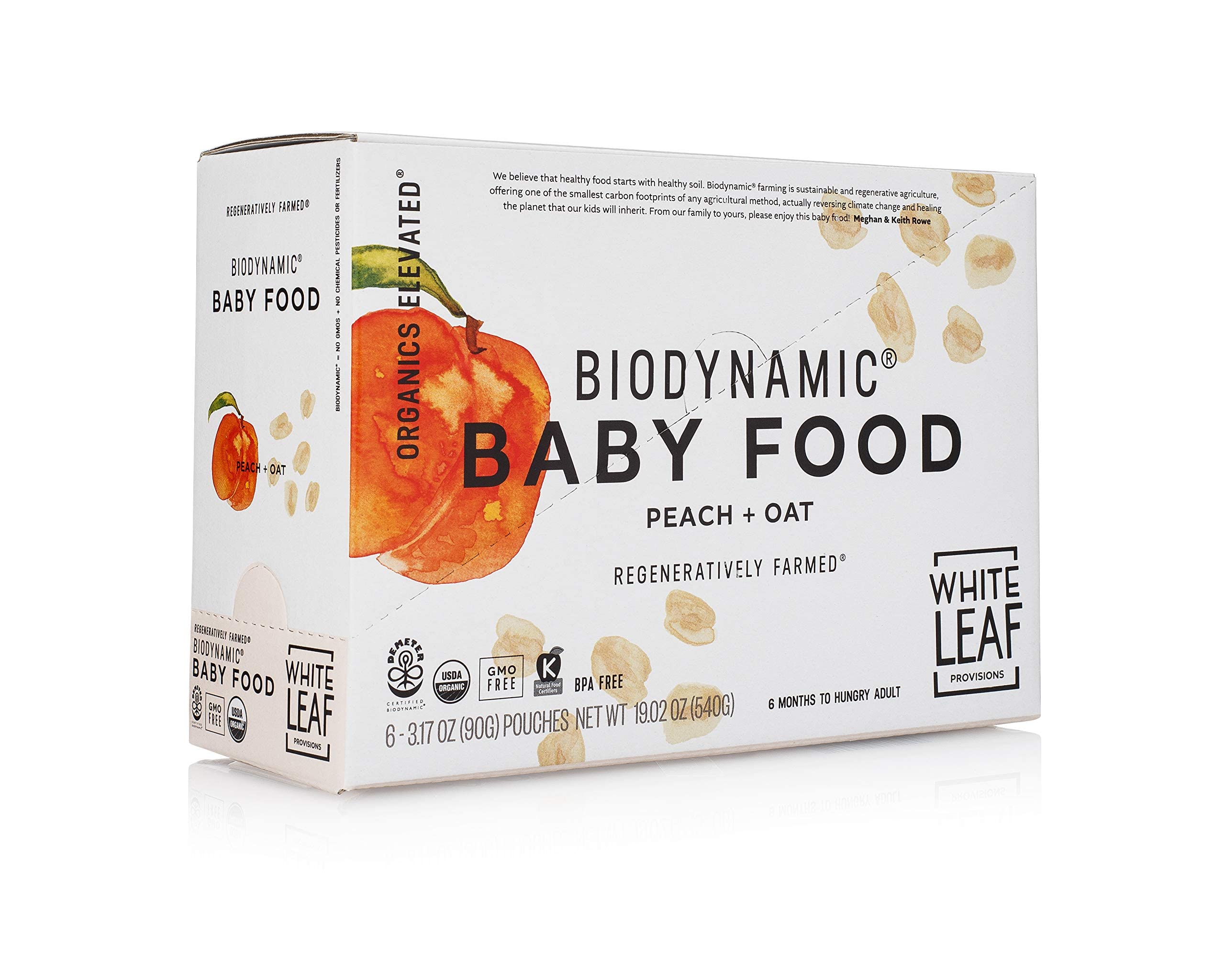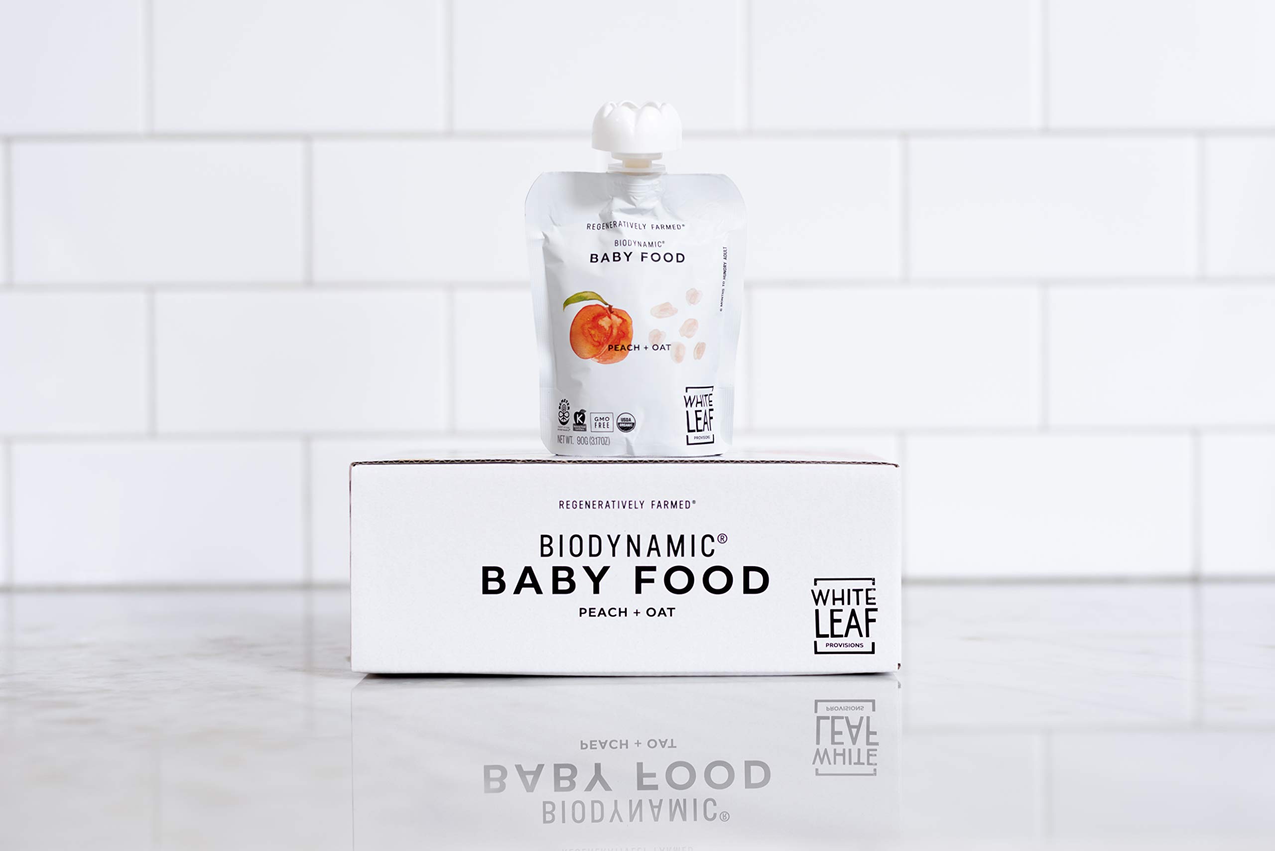 White Leaf Provisions Biodynamic & Organic Baby Food / Snacks — Peach + Oat Unsweetened Baby Puree Pouches — Squeezable Baby Food & Toddler Snack – 6 x 90g Organic Fruit Pouches