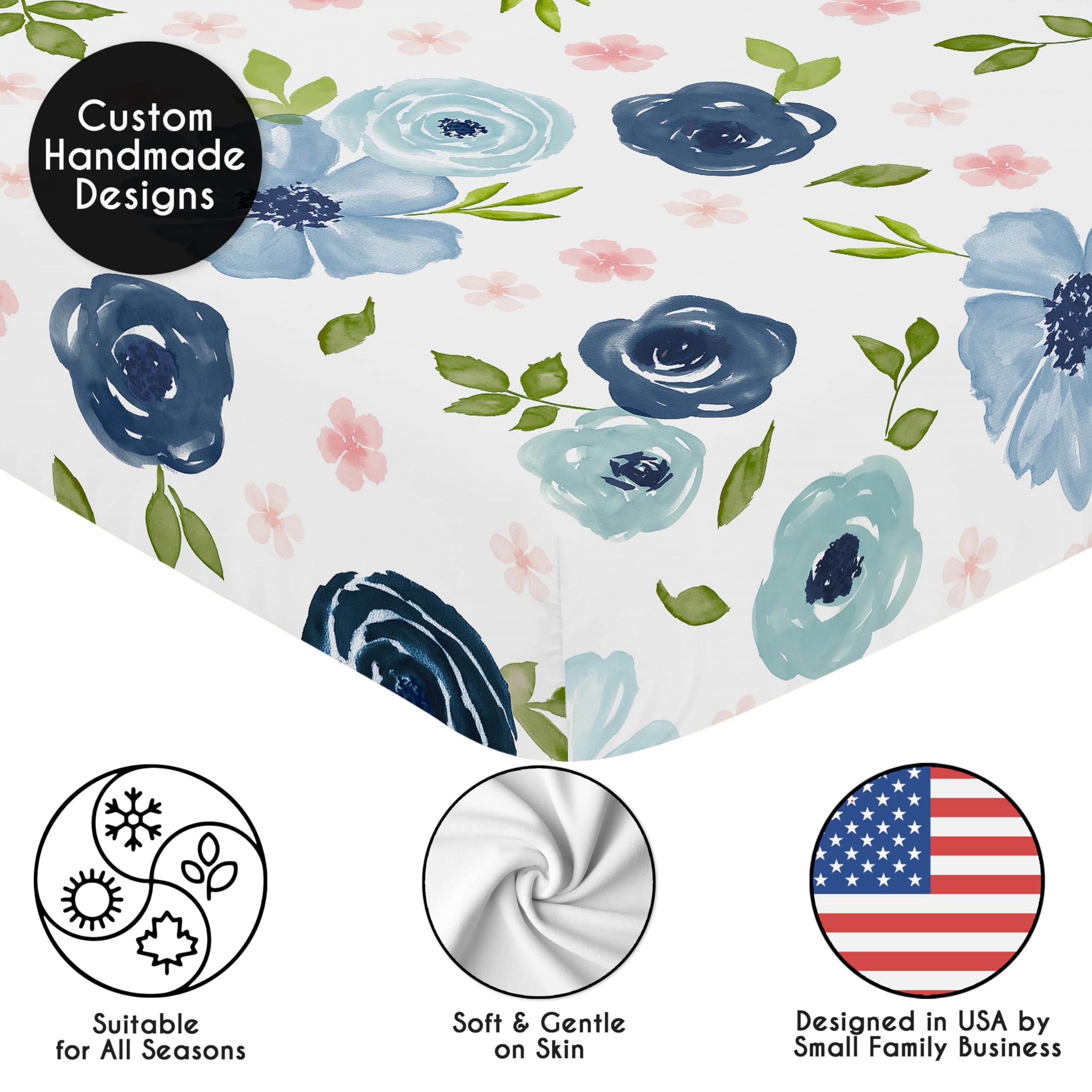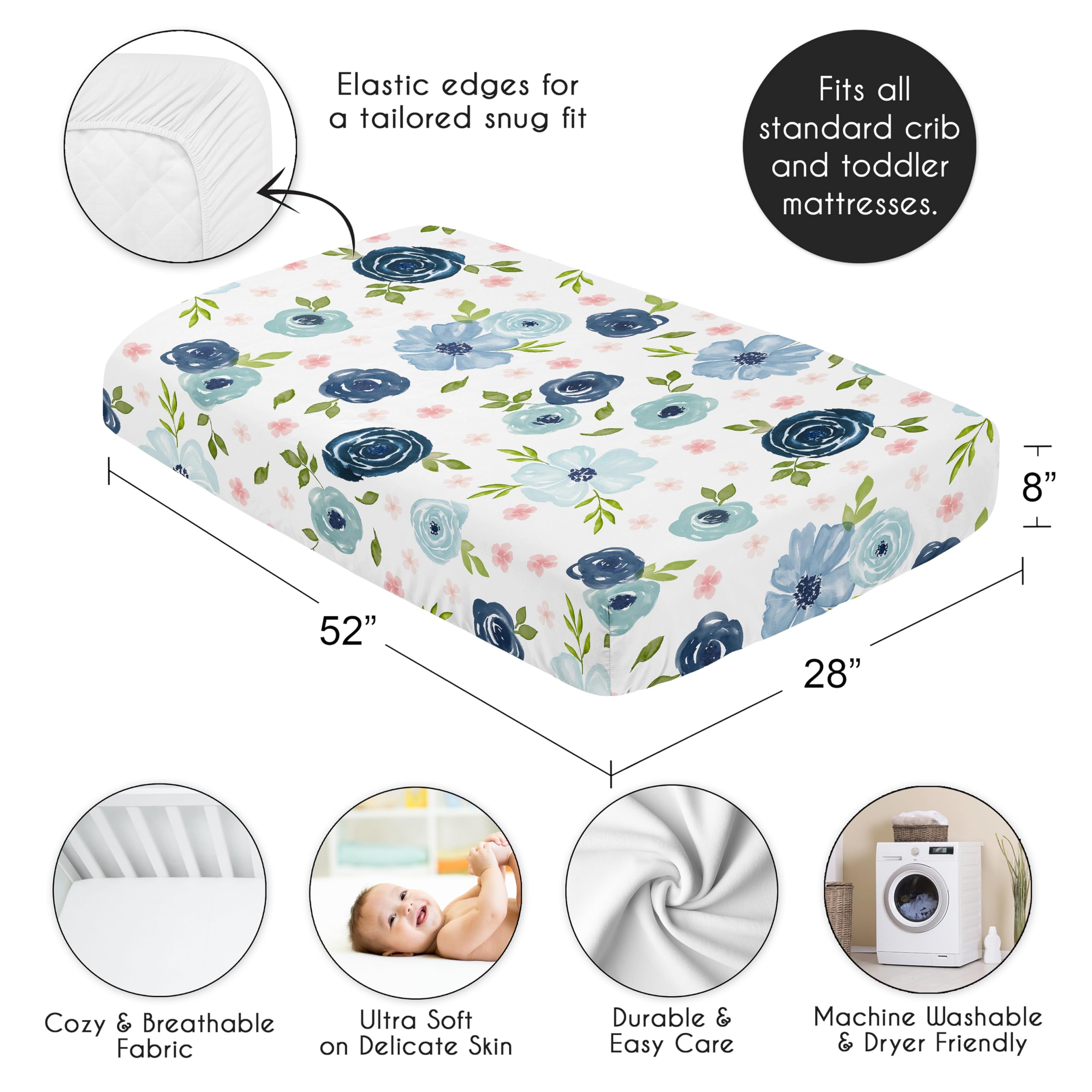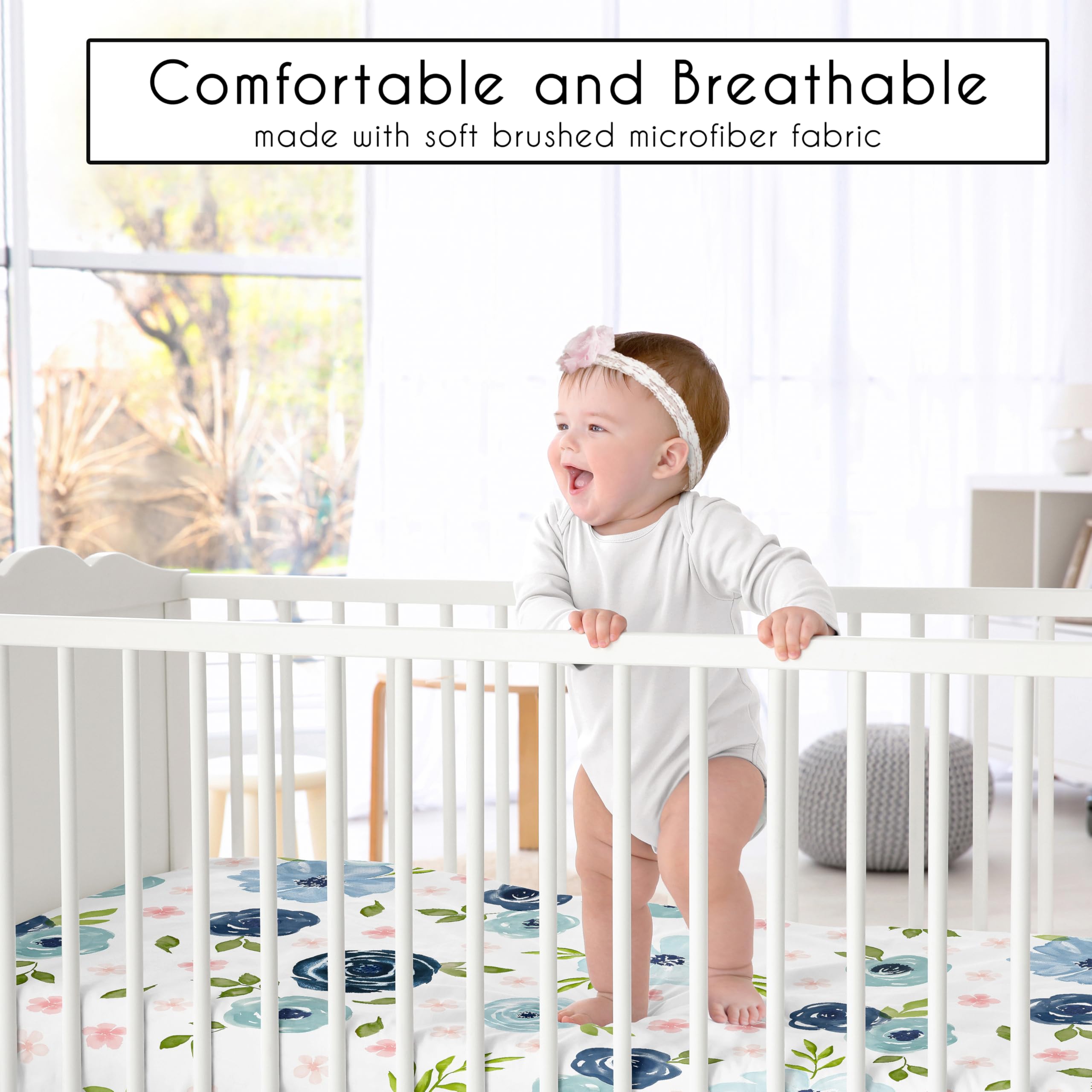 SNUG FIT: Includes (1) Fitted Crib Sheet 52in. x 28in. x 8in. Our newborn standard crib sheets fit snugly, with premium elastic sewn around the entire bottom edge for a secure fit on most standard sized cribs and toddler beds, to reduce shifting and bunching. This brushed microfiber crib sheet features an exclusive design of a navy blue, pink & green boho, garden, watercolor floral, shabby chic, leaf, wildflower, flower print & is gentle on delicate skin to foster a soothing sleep environment.