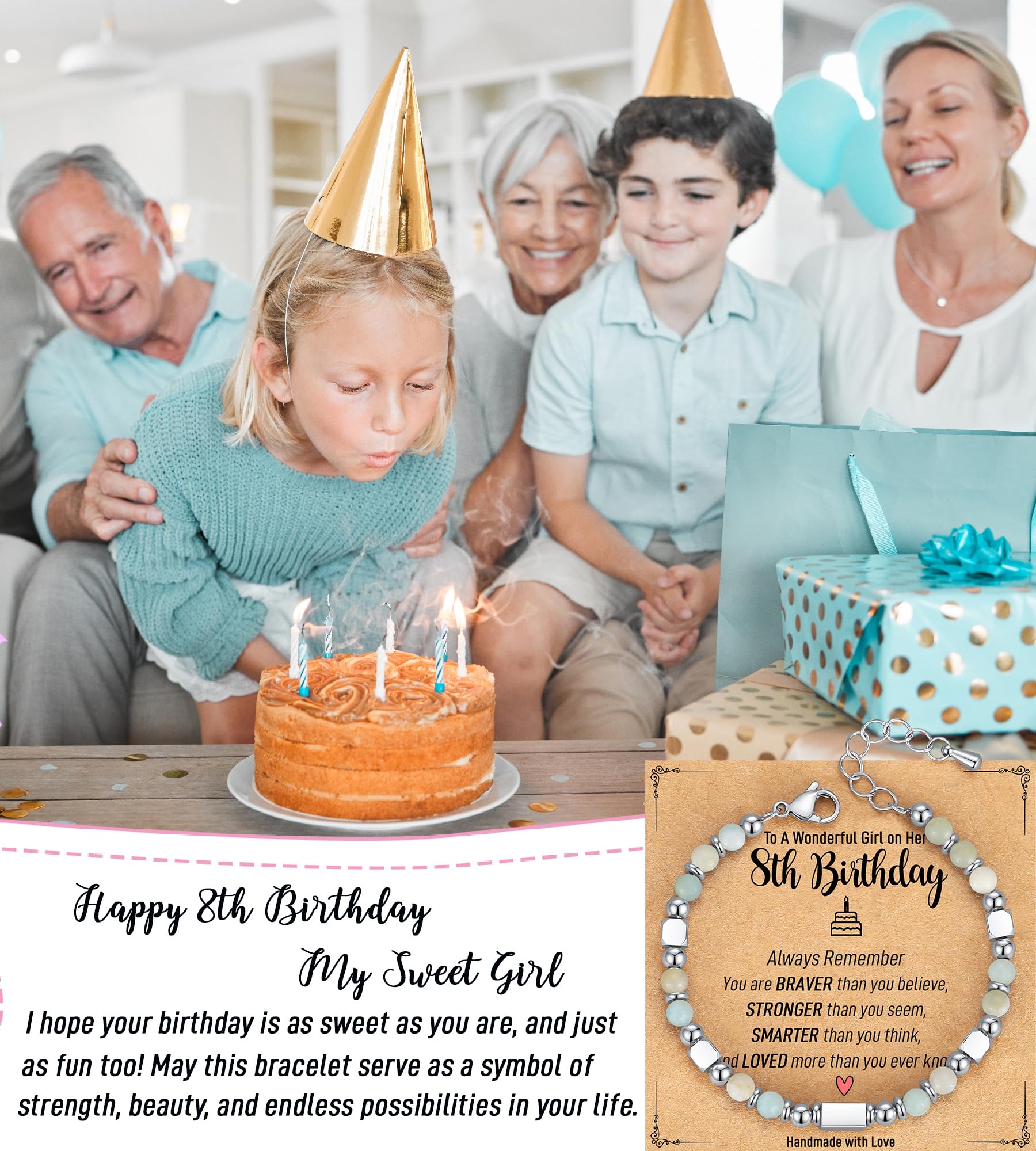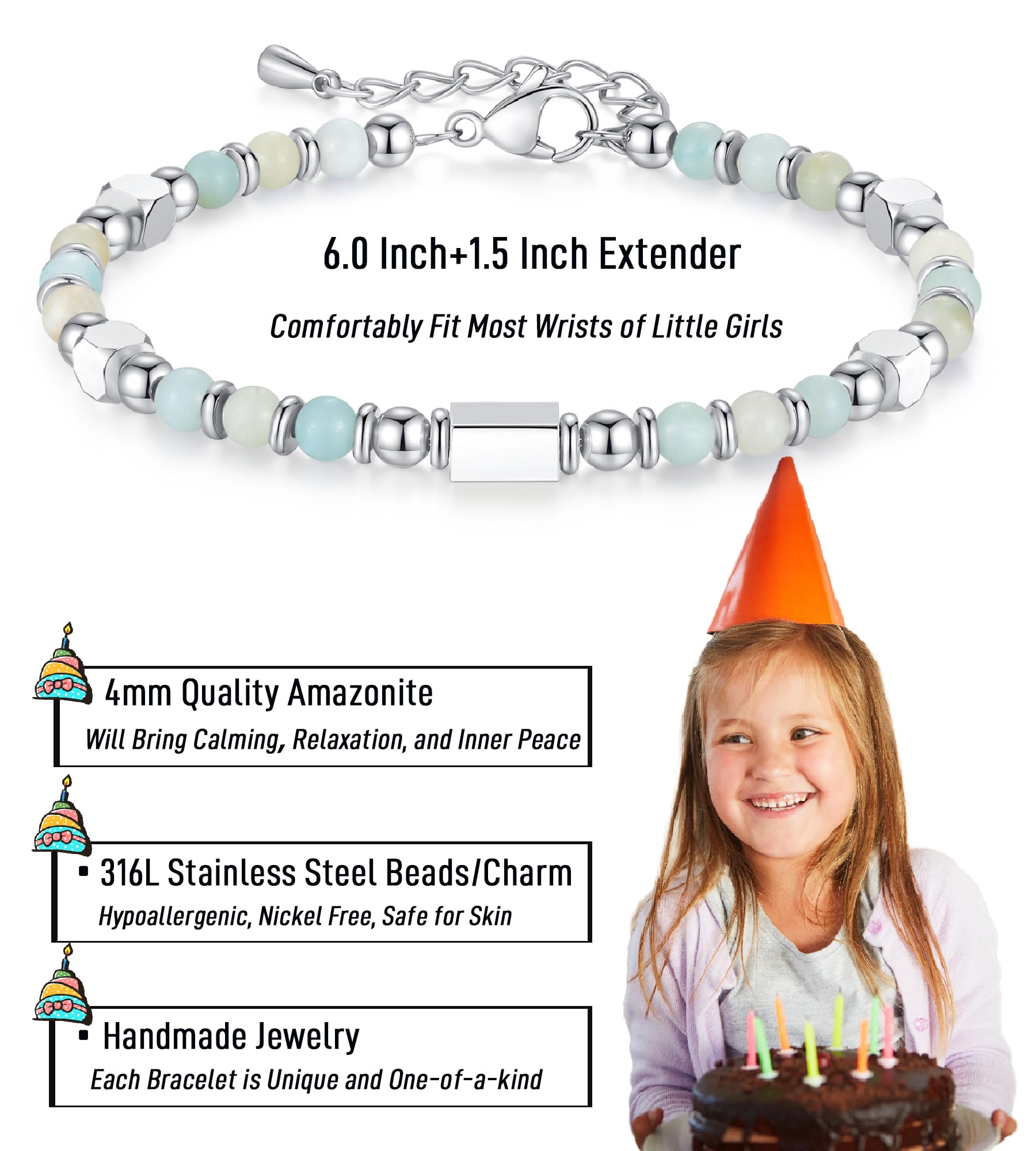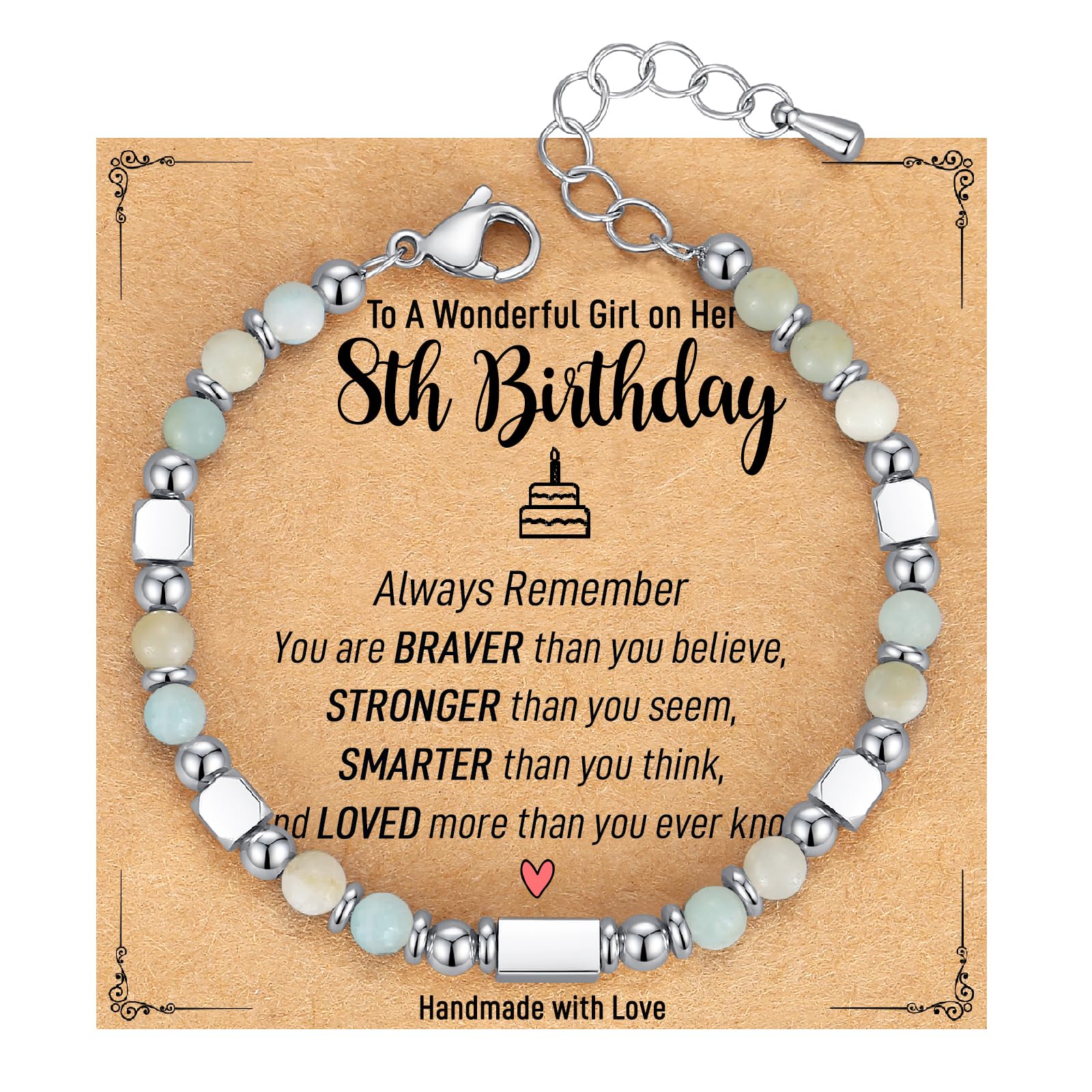 Birthday Bracelet for 8 Year Old Girl: Combination of tiny gemstones and stainless steel beads, this trendy bracelet makes the perfect 8 year old birthday gifts due to its unique designand natural stone meaning. Amazonite is said to bring calmness, balance, and relaxation to your young girl. Celebrate her turning 8 with this pretty bracelet, remind the little girl always remember that she is brave, strong, smart and beautiful.