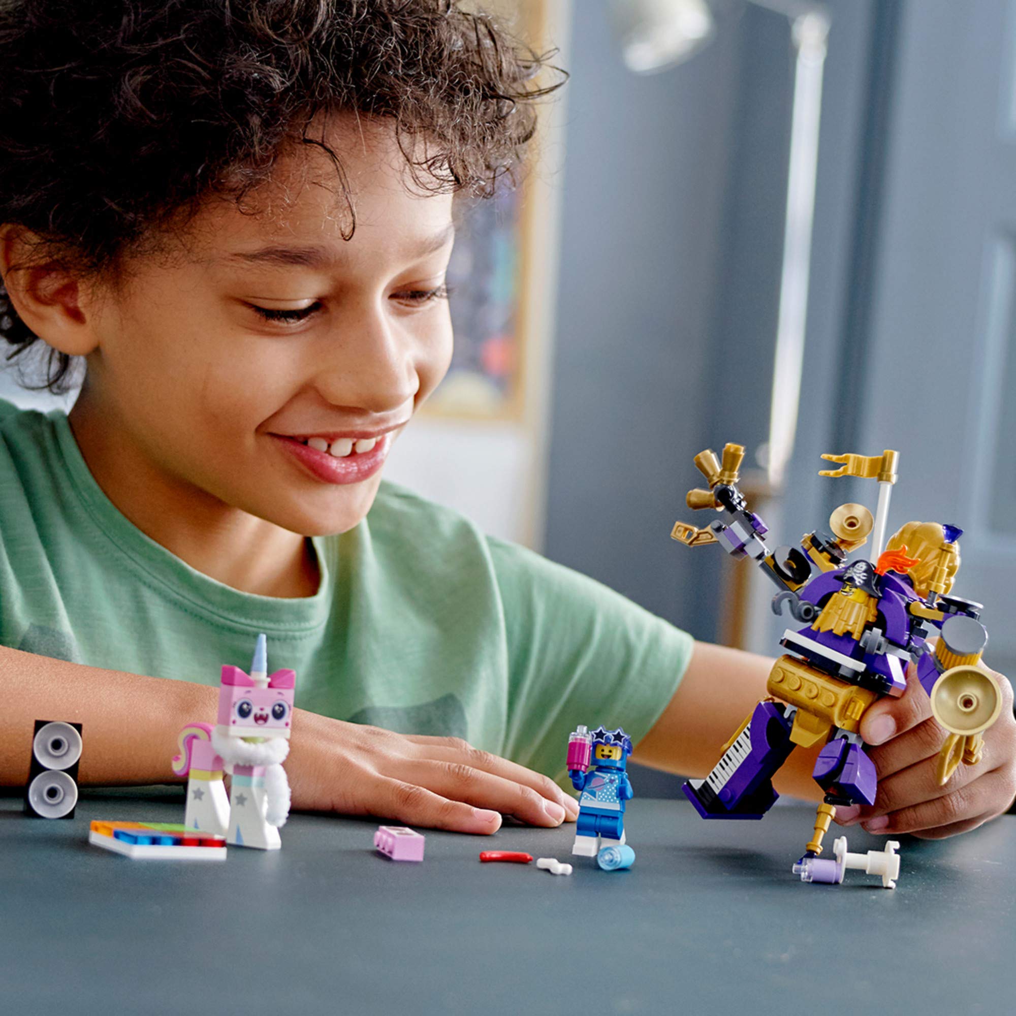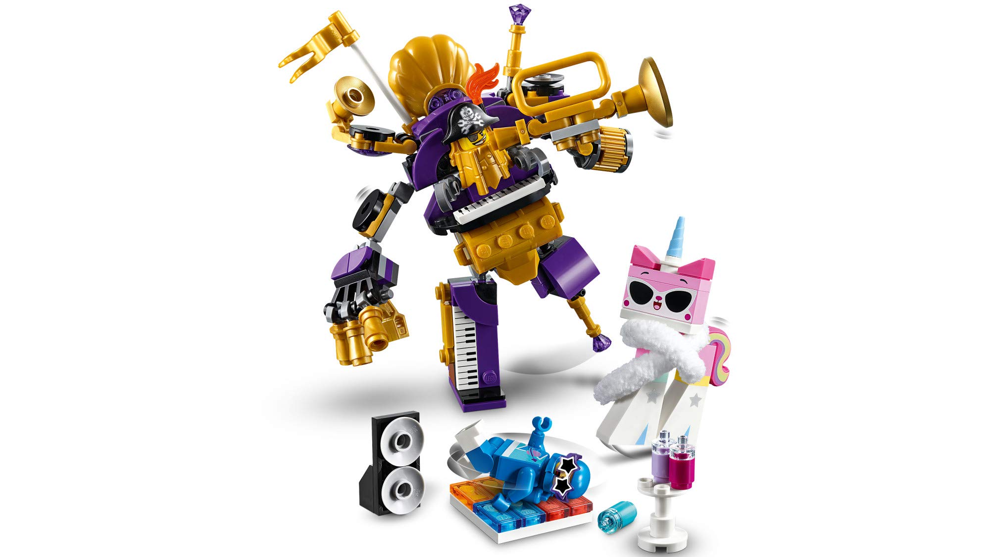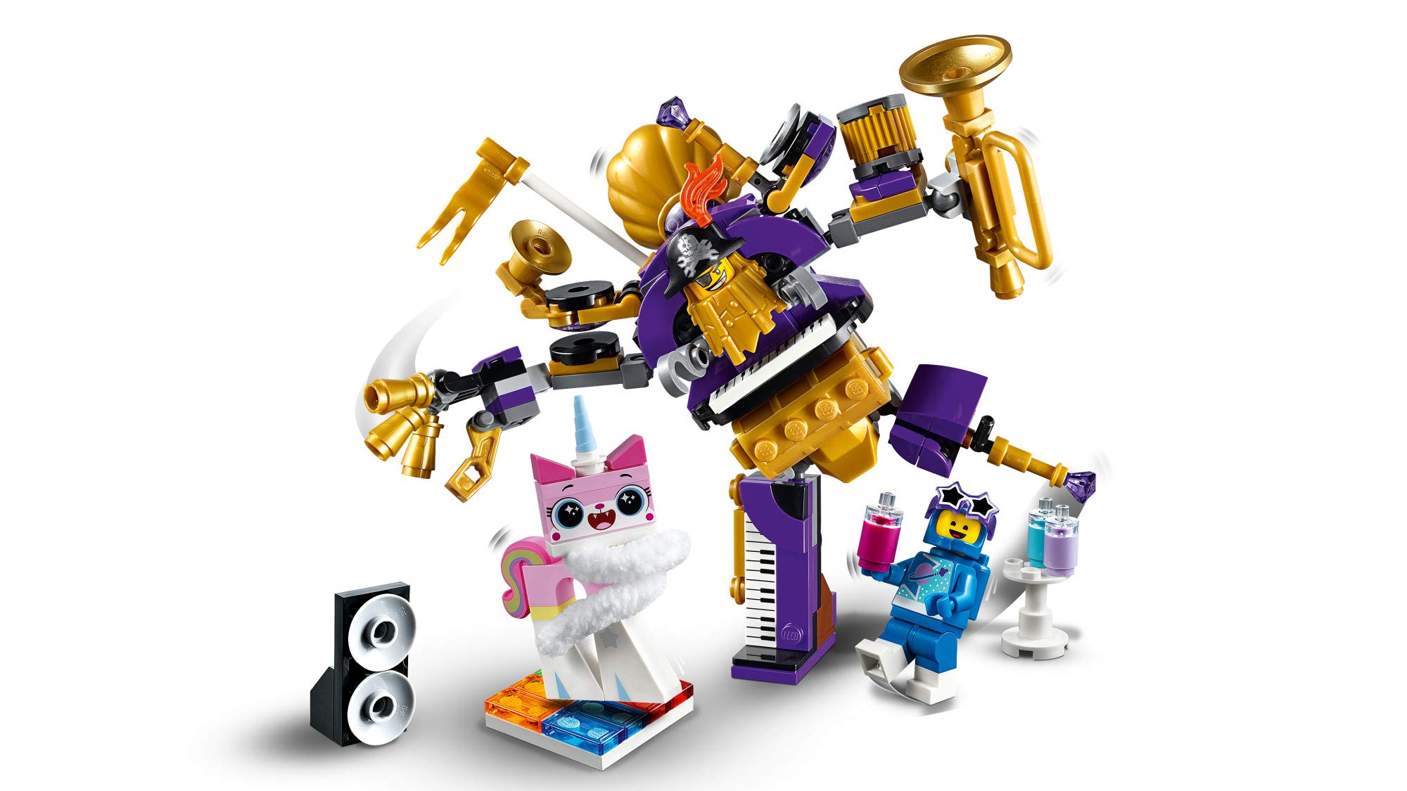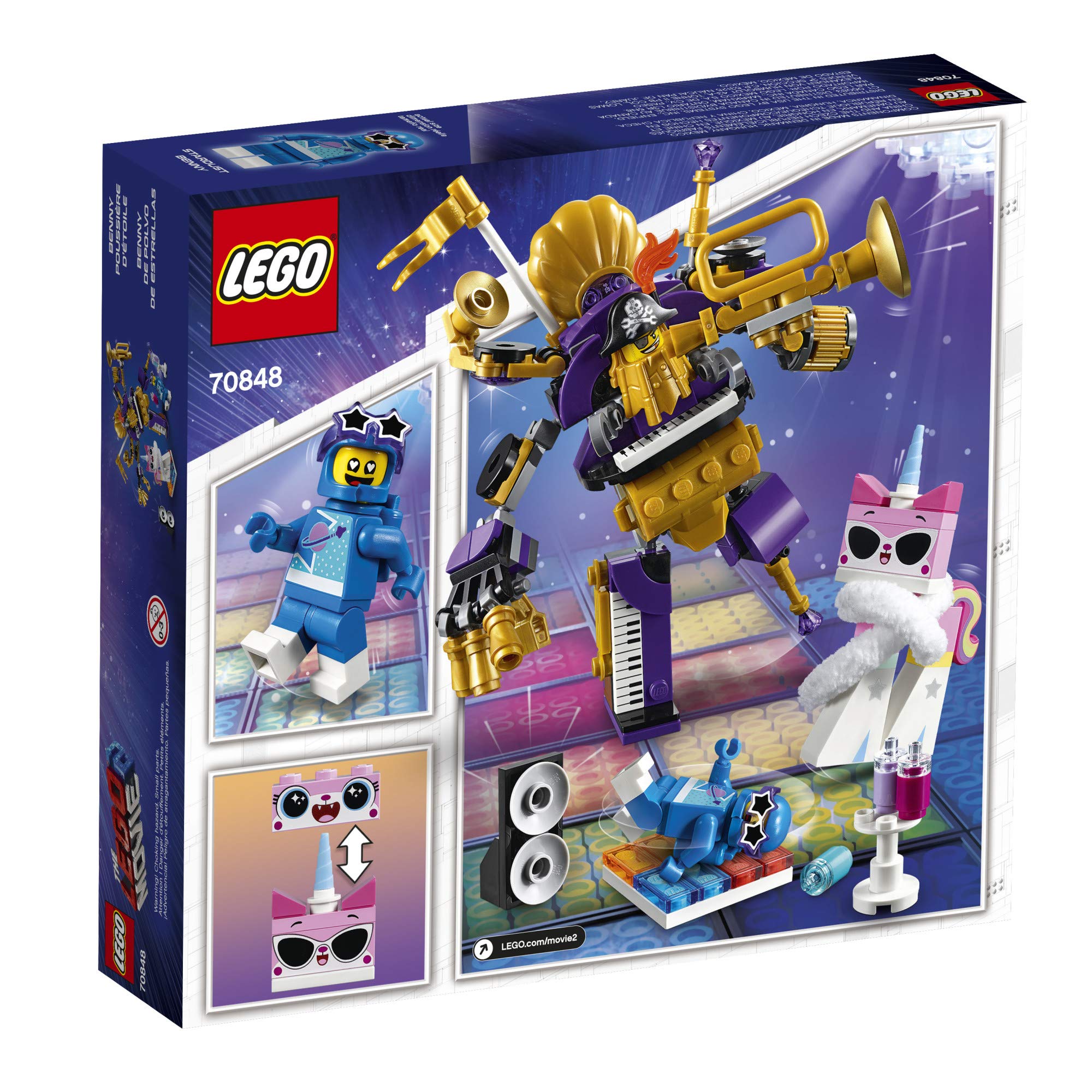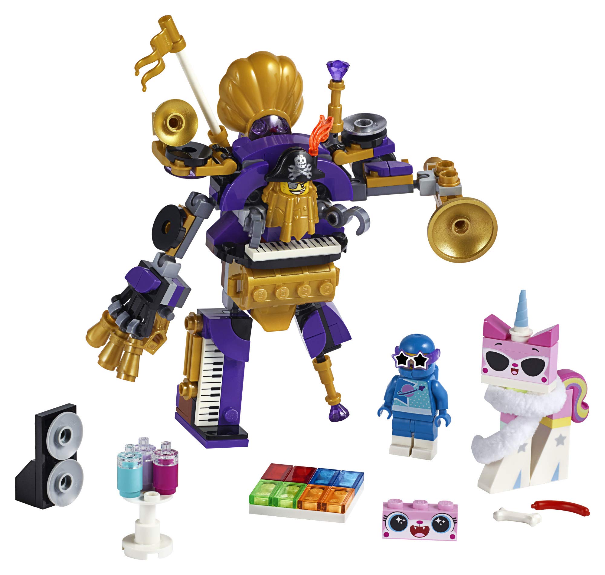 Kids can create an out-of-this-world party with 70848 Systar Party Crew! This fun-packed THE LEGO MOVIE 2 set features the highly posable One-Man-Metal-Band mech, with a built-in LEGO MetalBeard minifigure head, gripping hand and lots of built-in musical instrument details. Fans of the movie will love dressing up THE LEGO MOVIE 2 character Stardust Benny with new-for-August-2019 star glasses and the LEGO Unikitty as Disco Kitty brick-built figure with a fluffy fabric feather boa. This unique toy playset also includes a buildable multicolored dancefloor, loudspeaker and table topped with brick-built smoothie drinks to inspire kids to recreate movie scenes and make up their own stories.