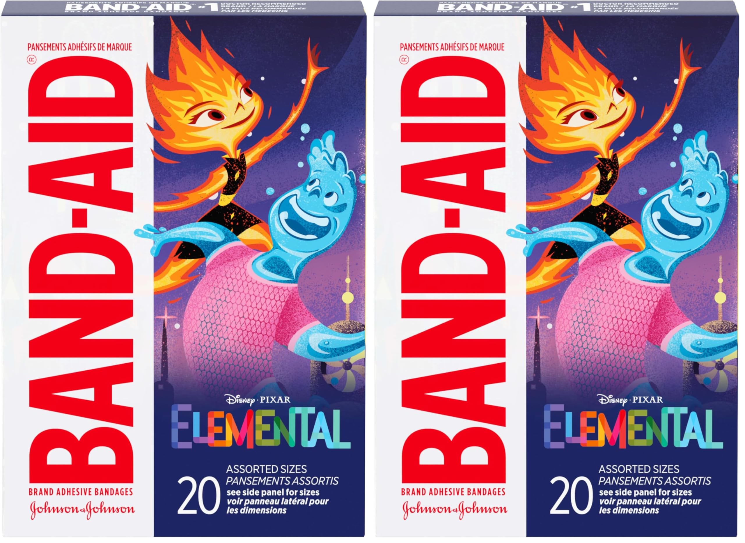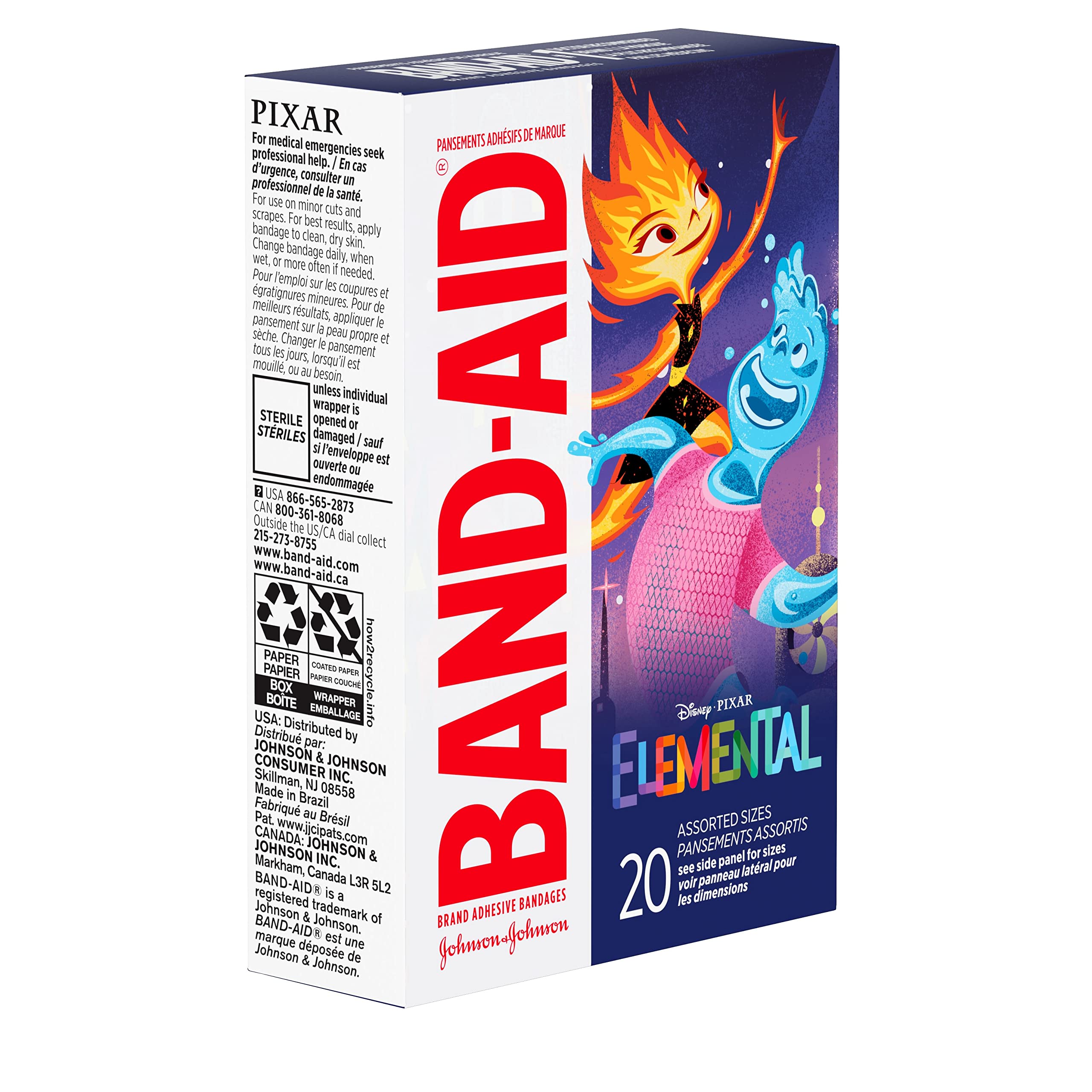 Care for your child's minor wounds and bring a smile to their face with Disney's Elemental Characters Band-Aid Brand Adhesive Bandages. These first aid adhesive bandages for kids and toddlers cover minor wounds, cuts and scrapes to deliver daily wound protection. Perfect for kids and toddlers, each individually wrapped sterile bandage features Disney's Elemental characters from the animated movie to make first aid more fun for your child. As part of your essential first aid supplies, the Disney decorated bandages protect minor wounds from contact with germs and dirt that may cause infection and delay healing. These sterile kids' bandages come in various sizes and are comfortable to wear thanks to a non-stick pad that won't adhere to the wound. The box contains individually wrapped sterile first aid bandages. ©Disney